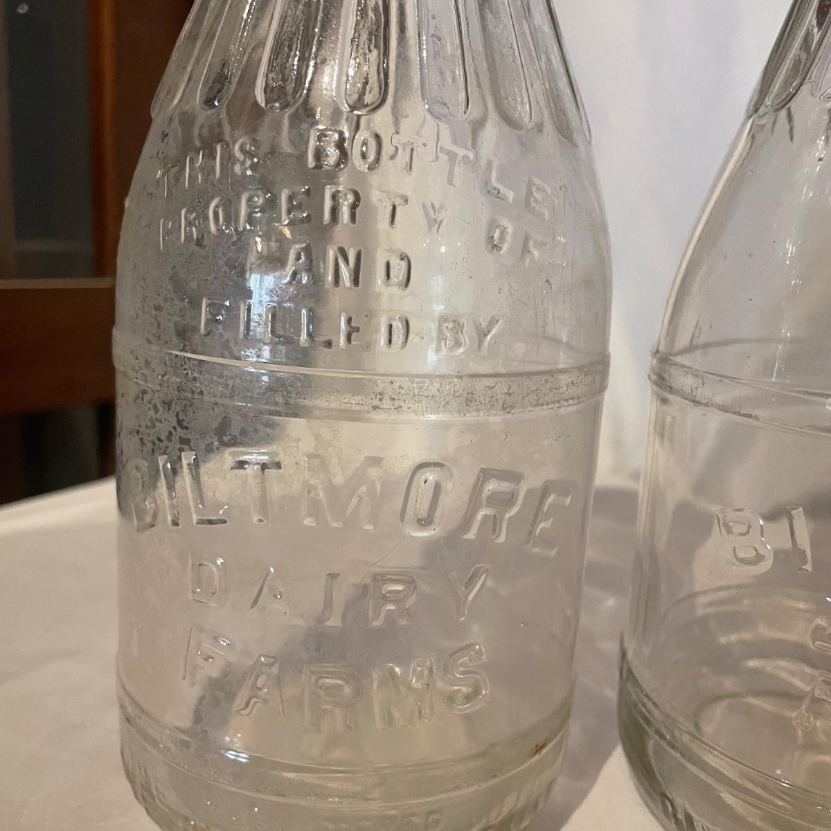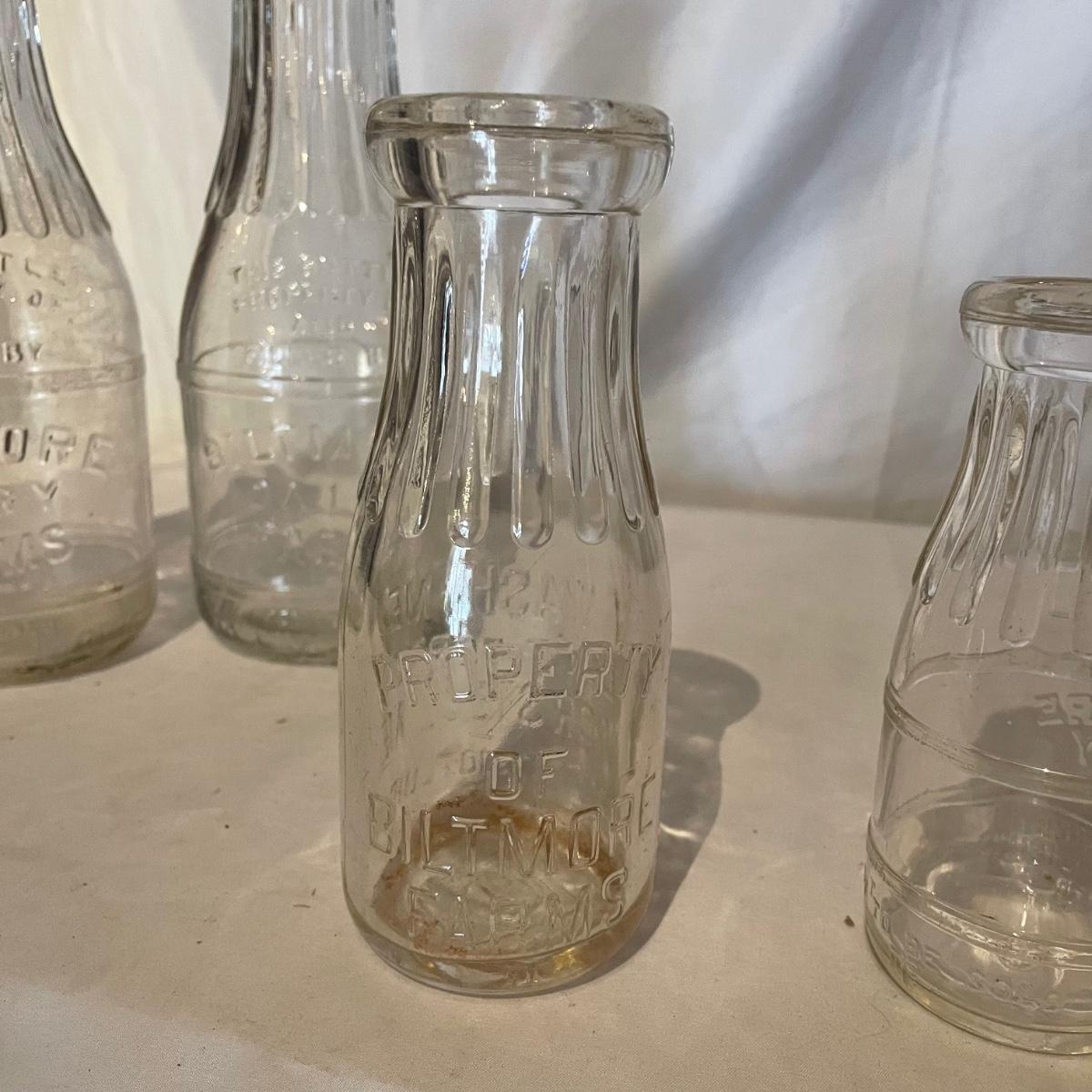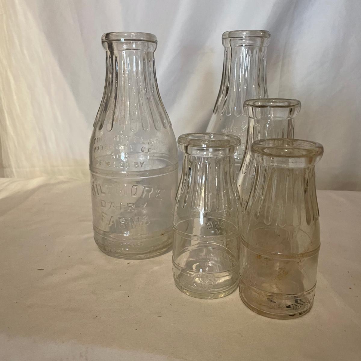 Five glass bottles from Biltmore Diary that all have matching grooves in the bottles necks that includes two one quart bottles, two half pints and a slightly taller and heavier small bottle that says “Wash me, don’t borrow nor steal me.” They are all from Biltmore Dairy.