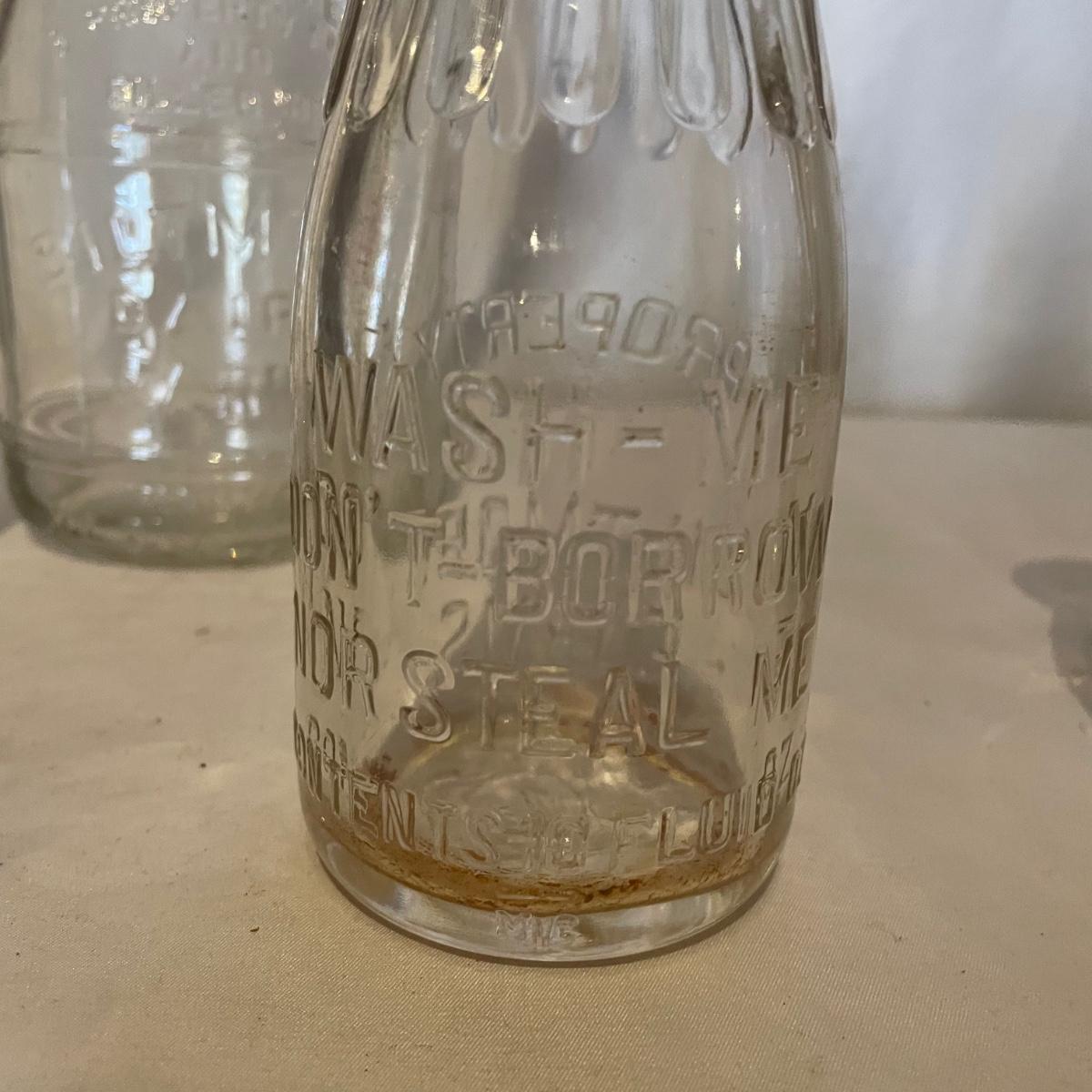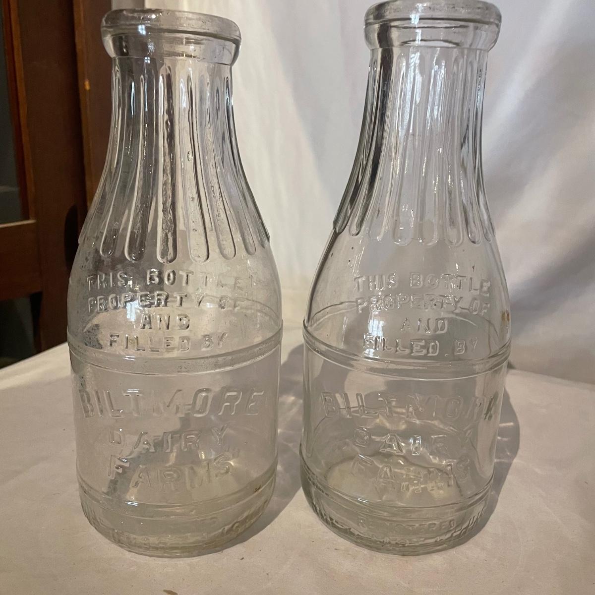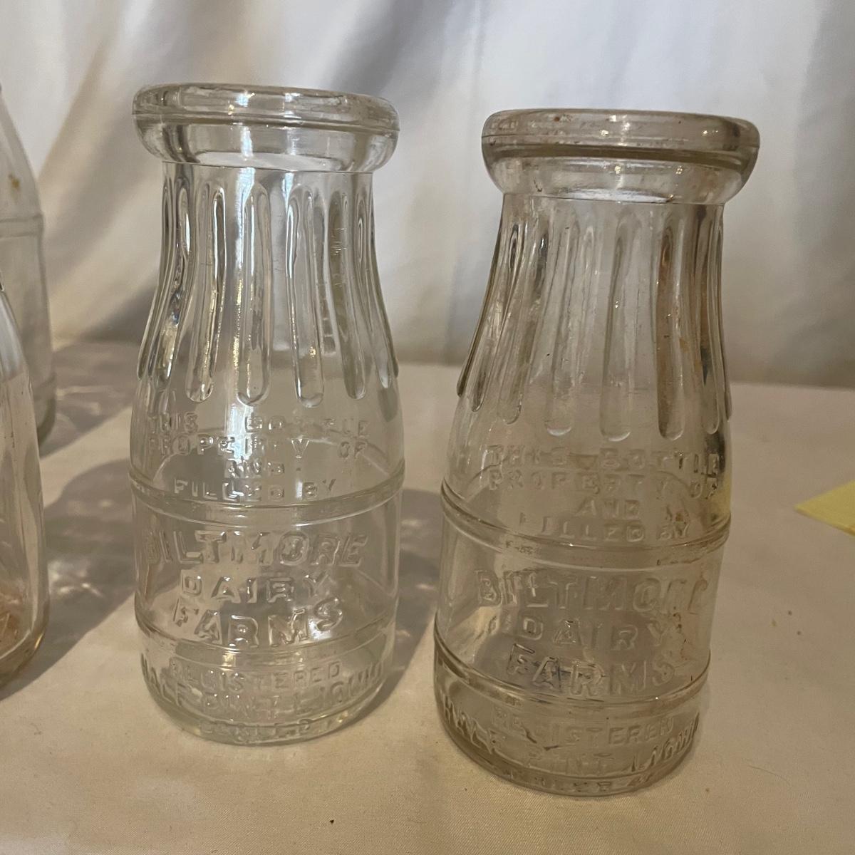 Five glass bottles from Biltmore Diary that all have matching grooves in the bottles necks that includes two one quart bottles, two half pints and a slightly taller and heavier small bottle that says “Wash me, don’t borrow nor steal me.” They are all from Biltmore Dairy.