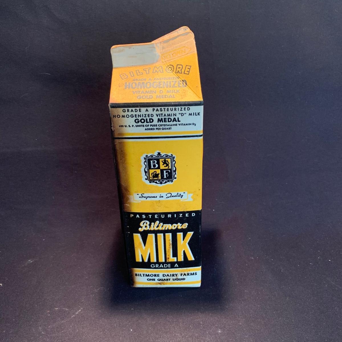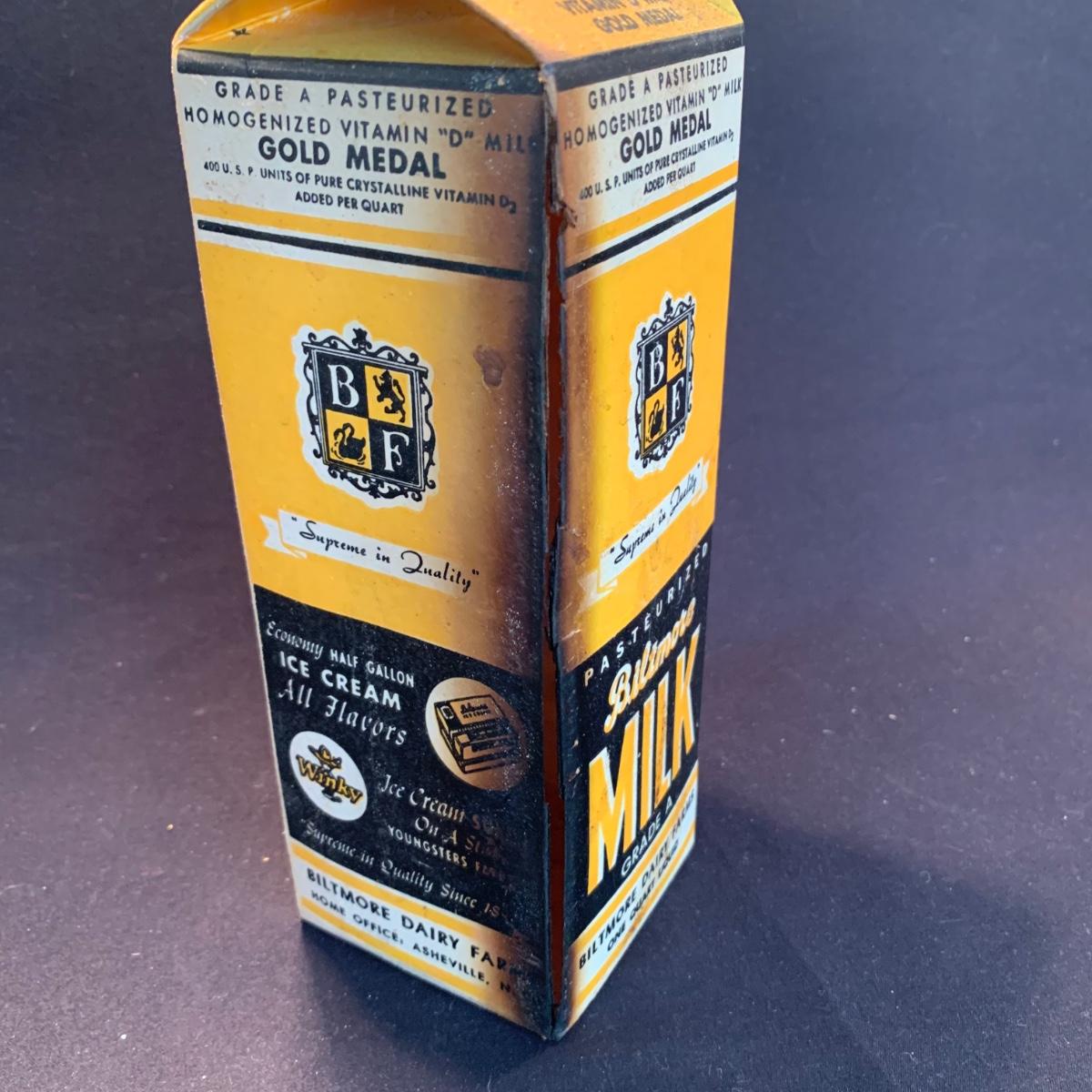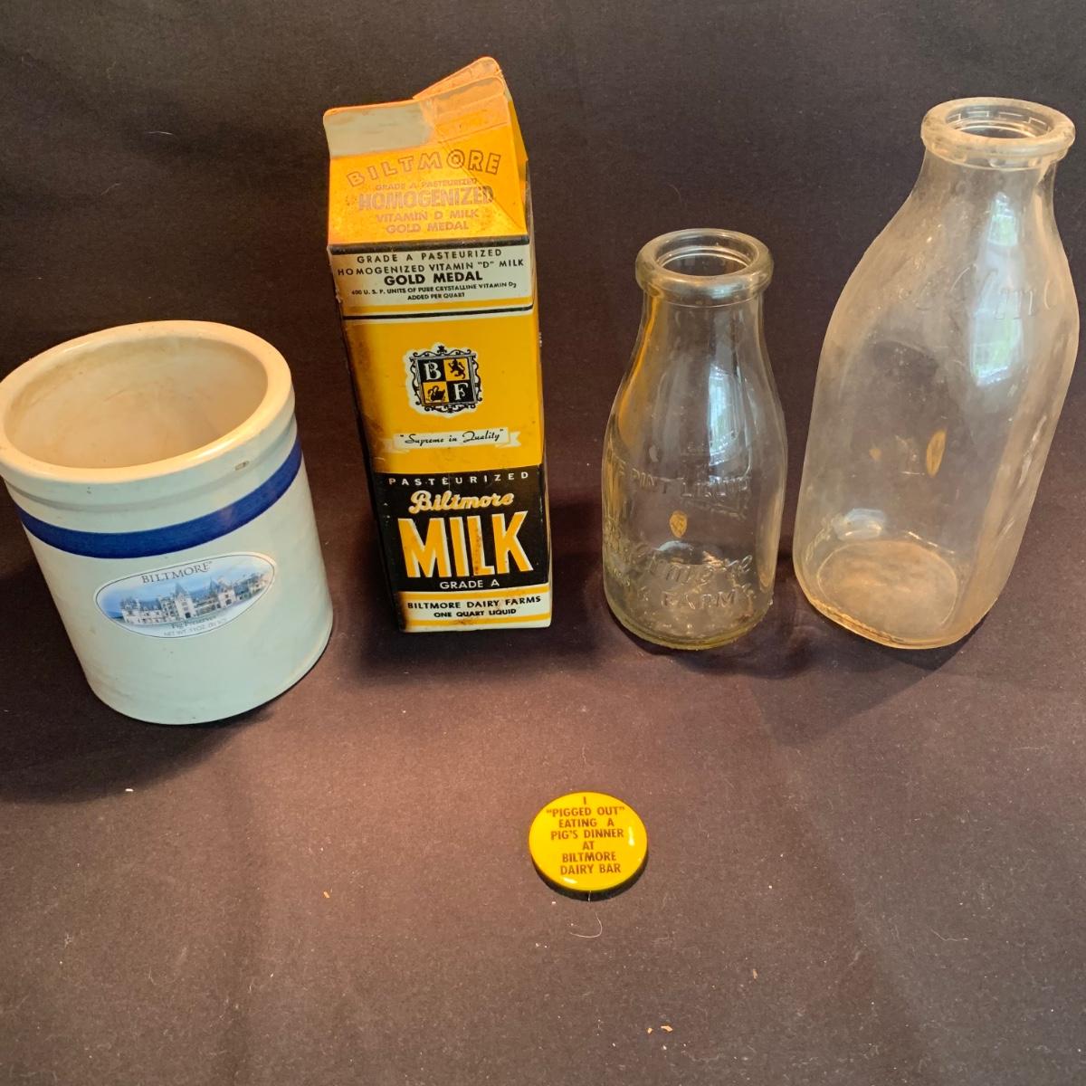 This lot includes two glass Biltmore milk jugs, one vintage Biltmore milk carton, one Biltmore pot, and one Biltmore pin. The milk jugs have some residue and need to be cleaned. The milk carton is in fair condition as it is coming apart on the side and shows signs of aging (see photos). The pot has a small chip in it and the Biltmore logo is starting to peel off. The largest piece measures about 9.5in. Shipping available