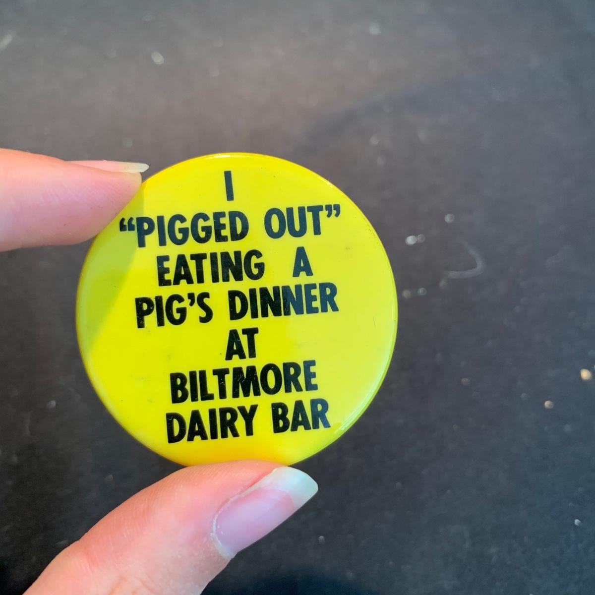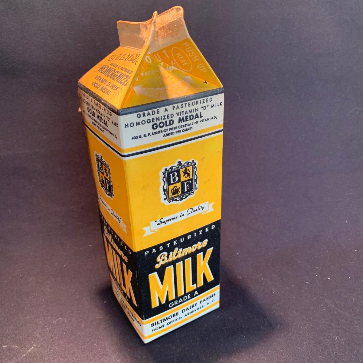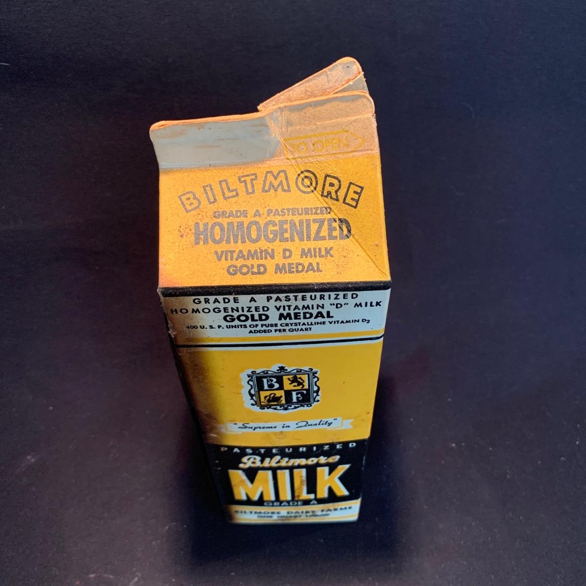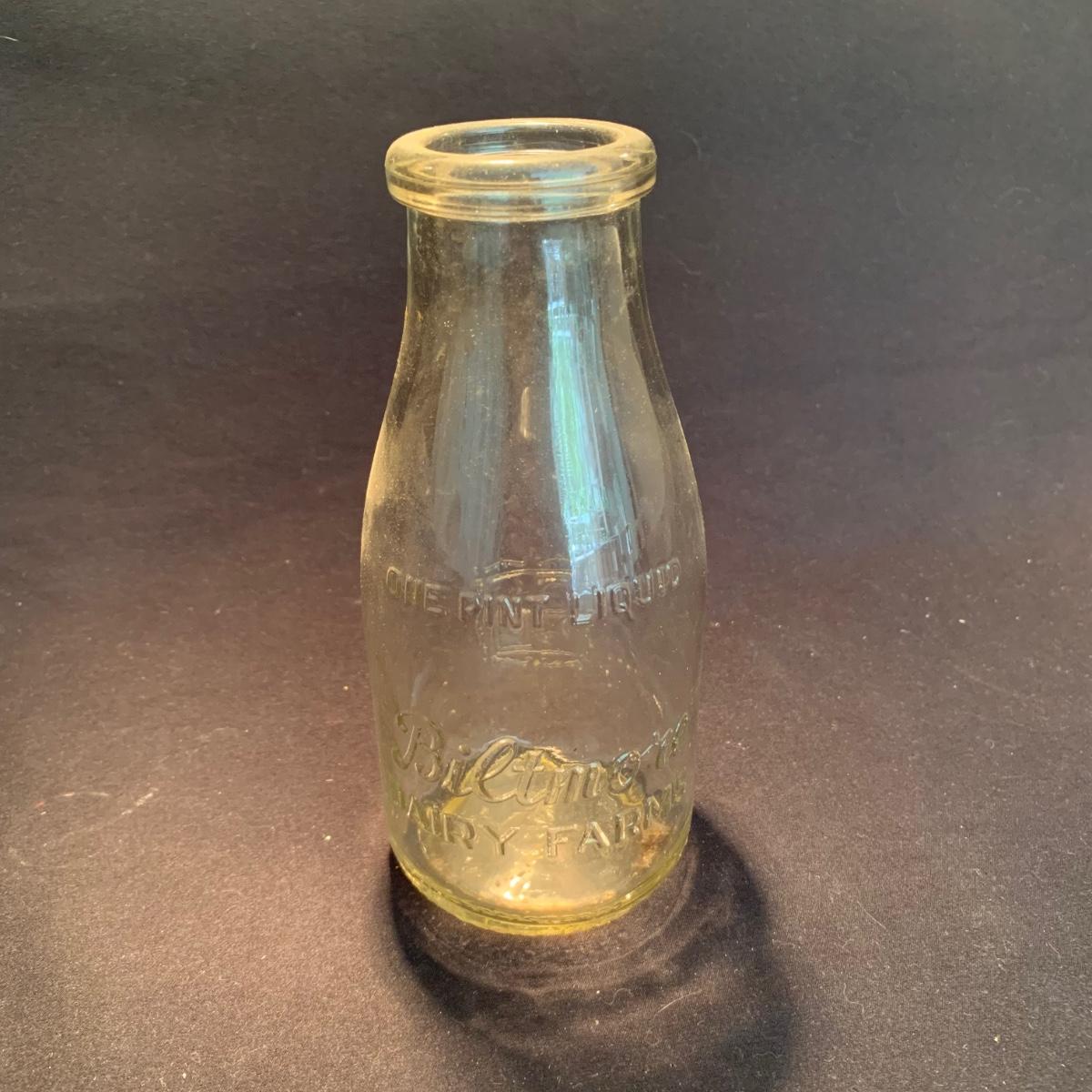 This lot includes two glass Biltmore milk jugs, one vintage Biltmore milk carton, one Biltmore pot, and one Biltmore pin. The milk jugs have some residue and need to be cleaned. The milk carton is in fair condition as it is coming apart on the side and shows signs of aging (see photos). The pot has a small chip in it and the Biltmore logo is starting to peel off. The largest piece measures about 9.5in. Shipping available