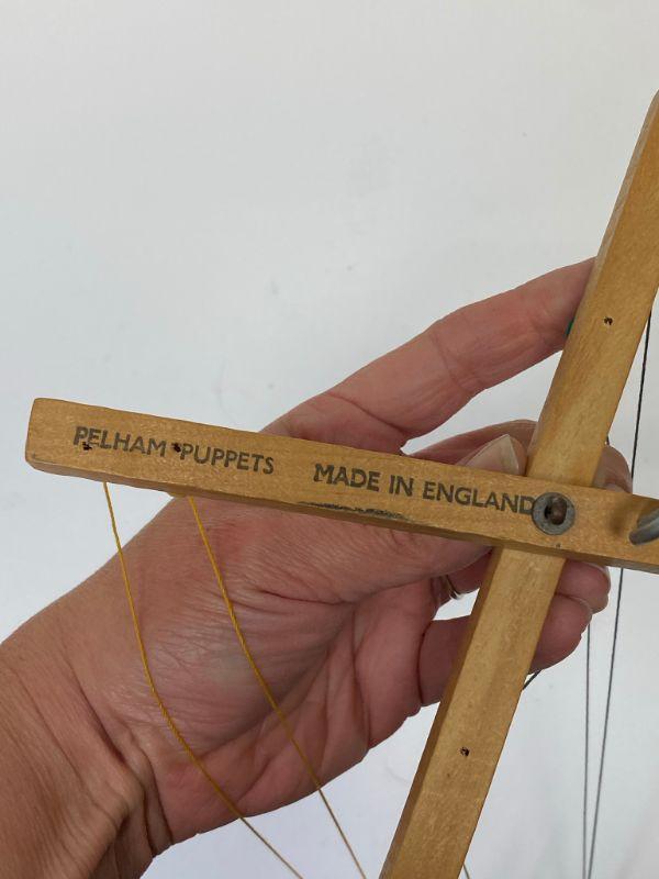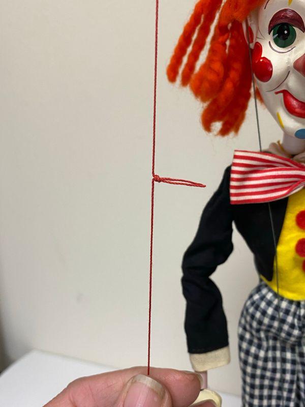 Vintage Bimbo the Clown marionette puppet. Made by Pelham Puppets in England. Has all original parts and strings. The red string has been tied back together. In very good vintage condition. Measures about 16" without strings and is over 36" with strings.