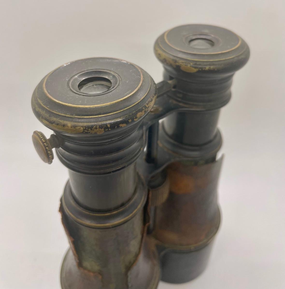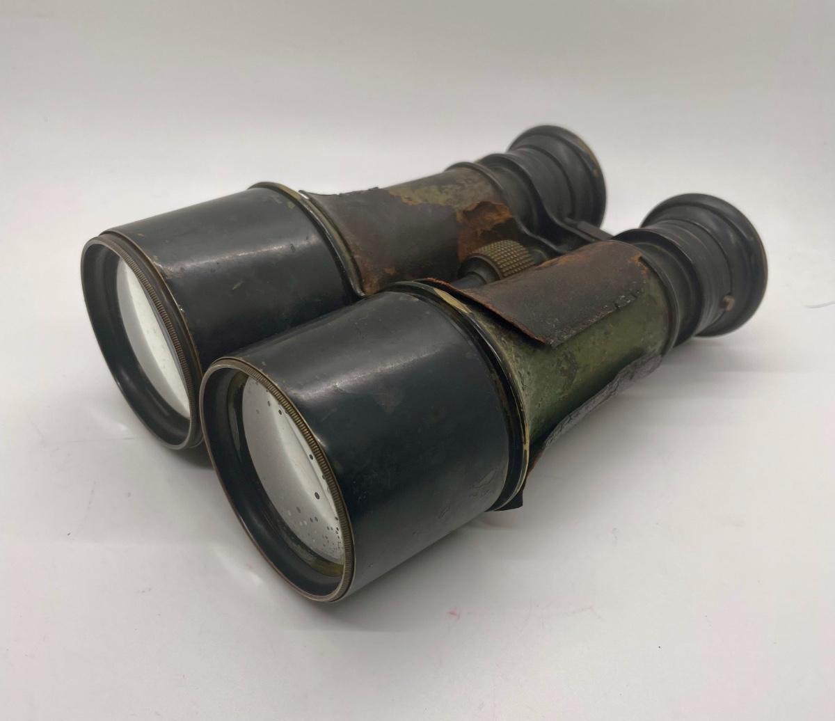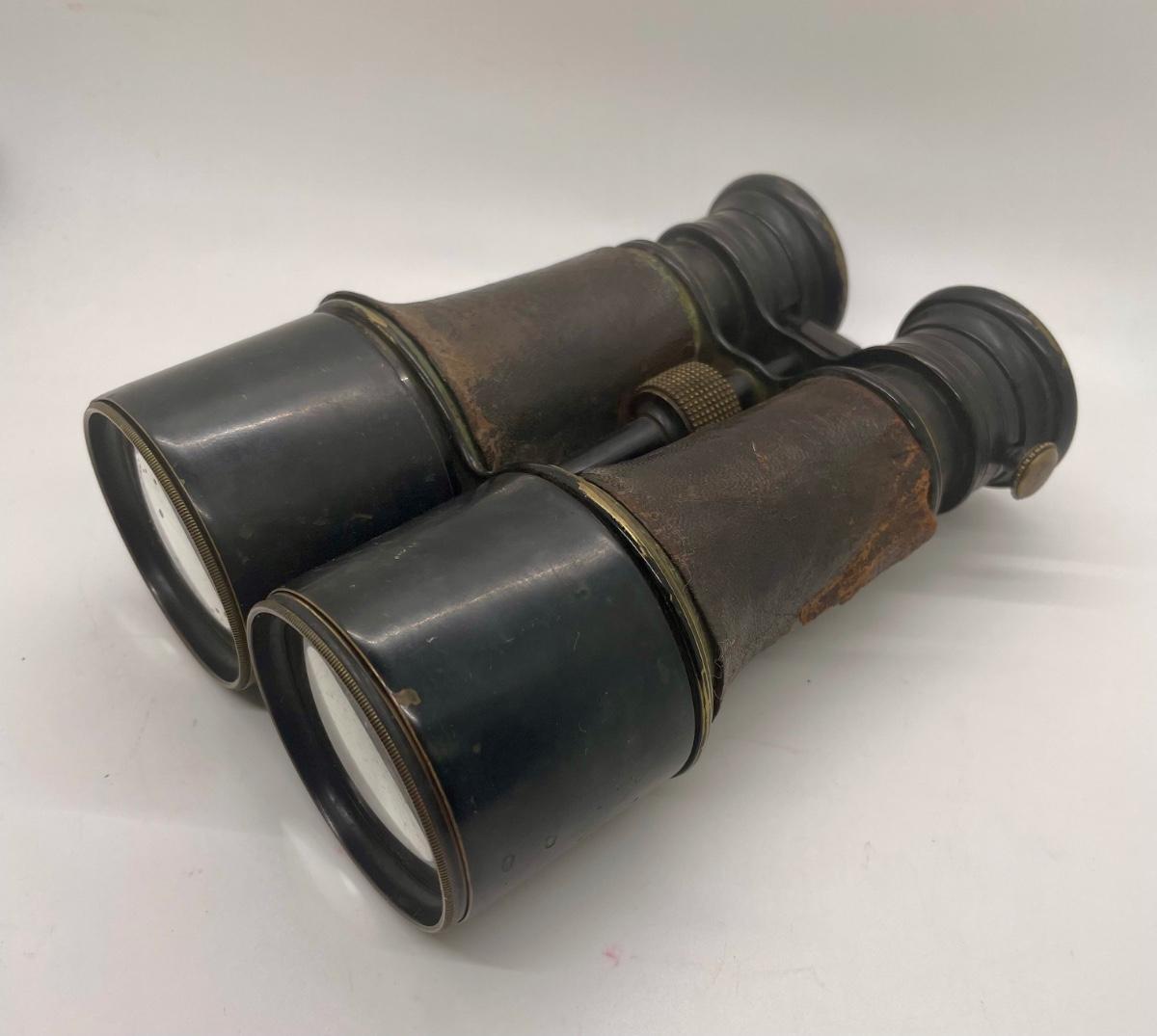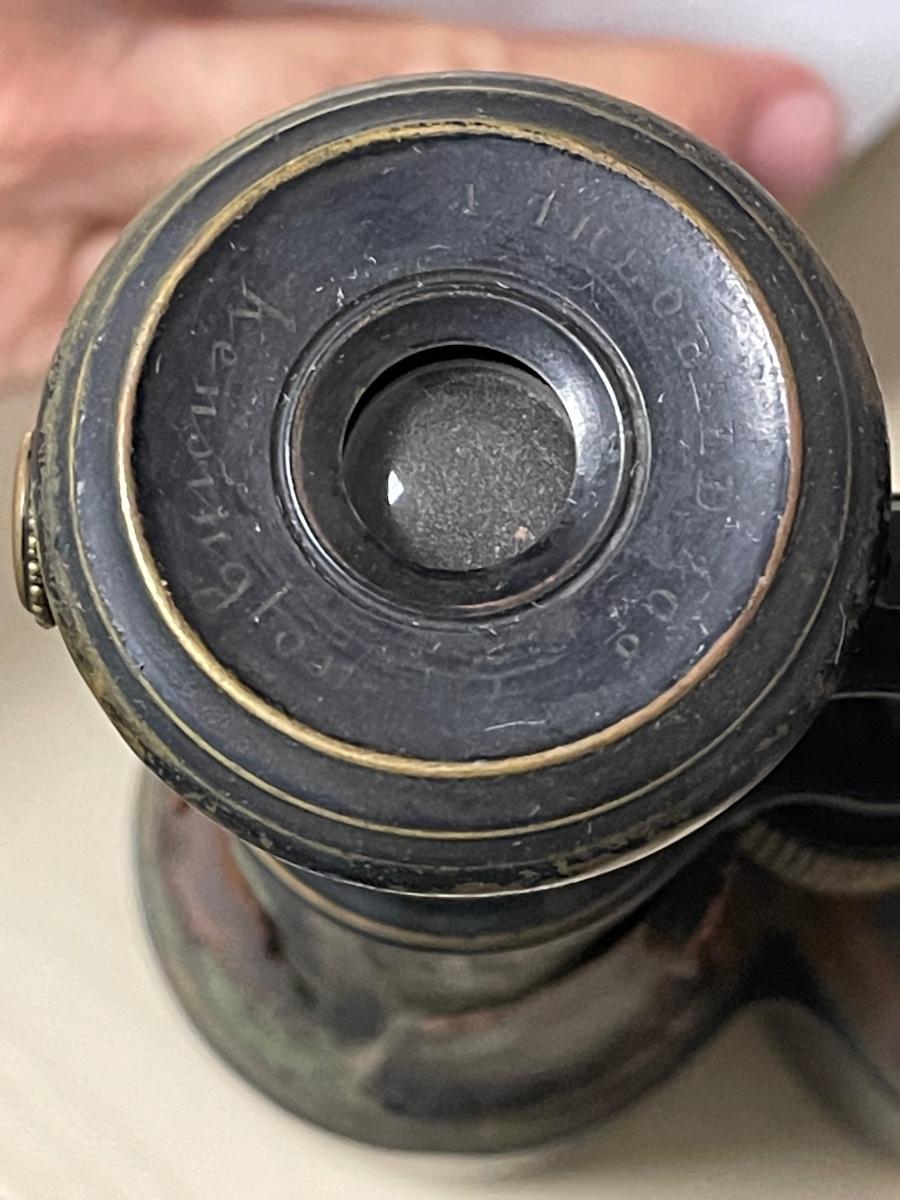 From J. Theobald & Co. Kensington England. Company closed before WW1. In good vintage condition, leather wrapping on the hand-hold part of the binoculars has dried out and split open, so of it is missing. Lenses are intact, adjustment wheel turns freely to extend and retract the focal length. Sun shades can be extended and retracted mover the front lenses.