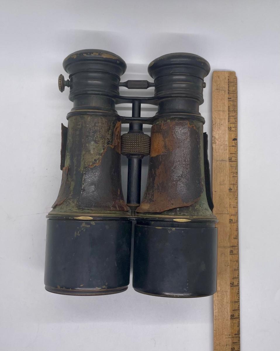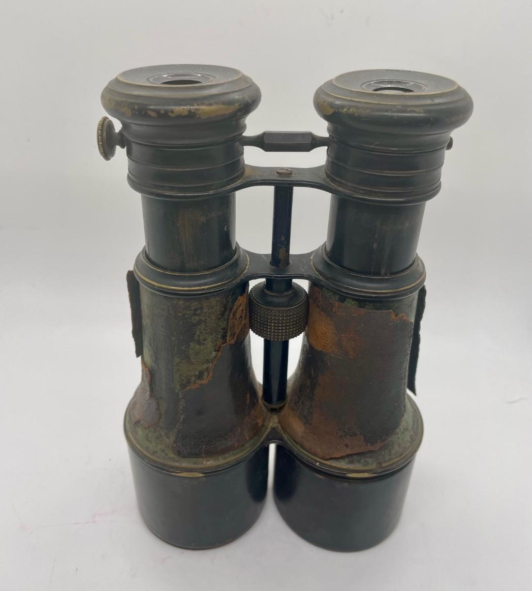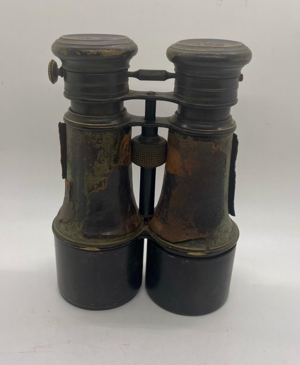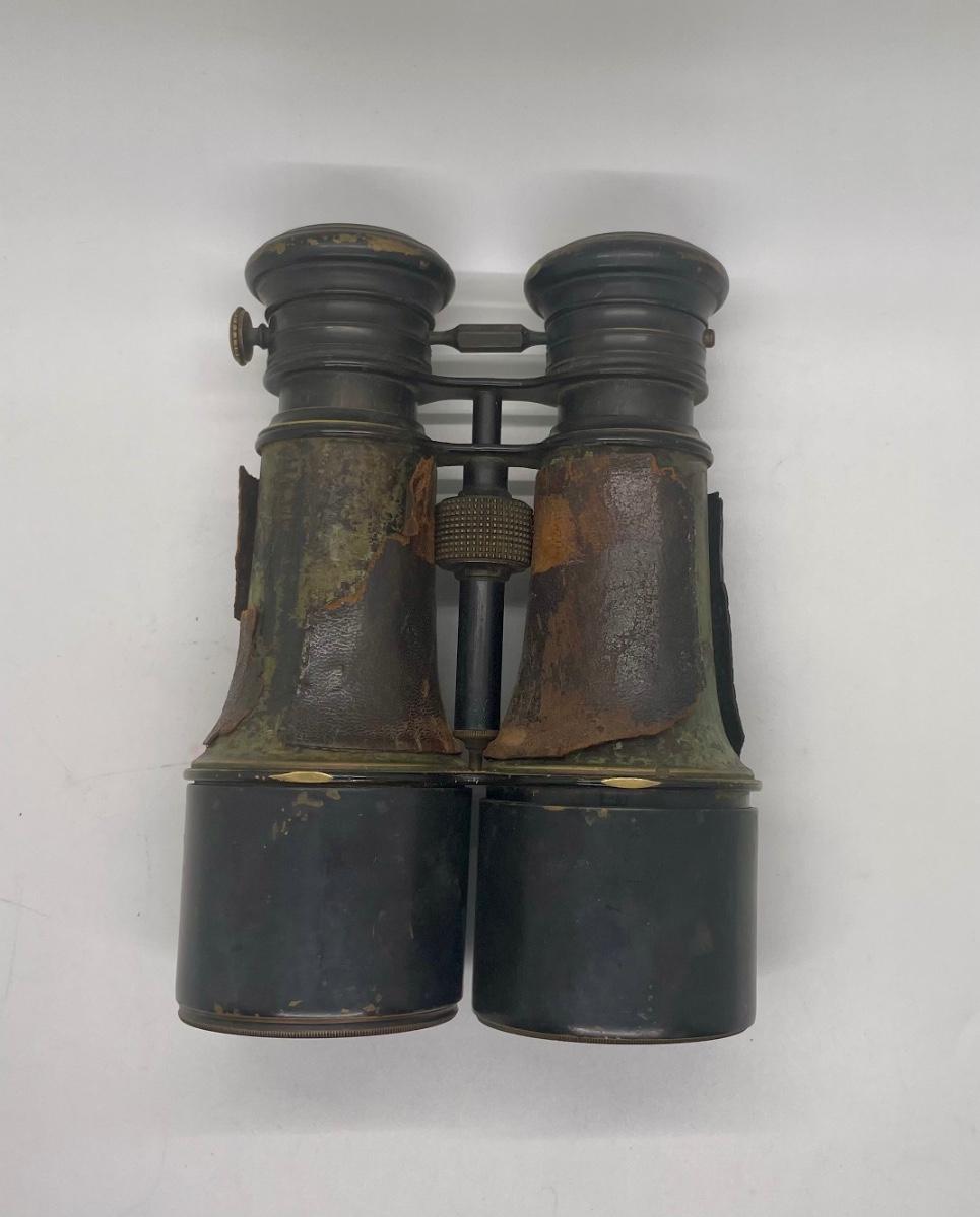 From J. Theobald & Co. Kensington England. Company closed before WW1. In good vintage condition, leather wrapping on the hand-hold part of the binoculars has dried out and split open, so of it is missing. Lenses are intact, adjustment wheel turns freely to extend and retract the focal length. Sun shades can be extended and retracted mover the front lenses.