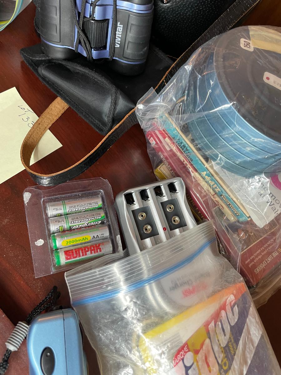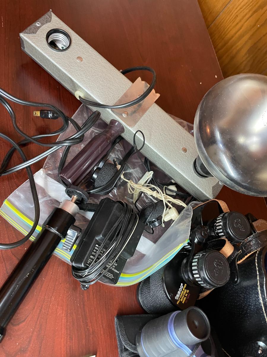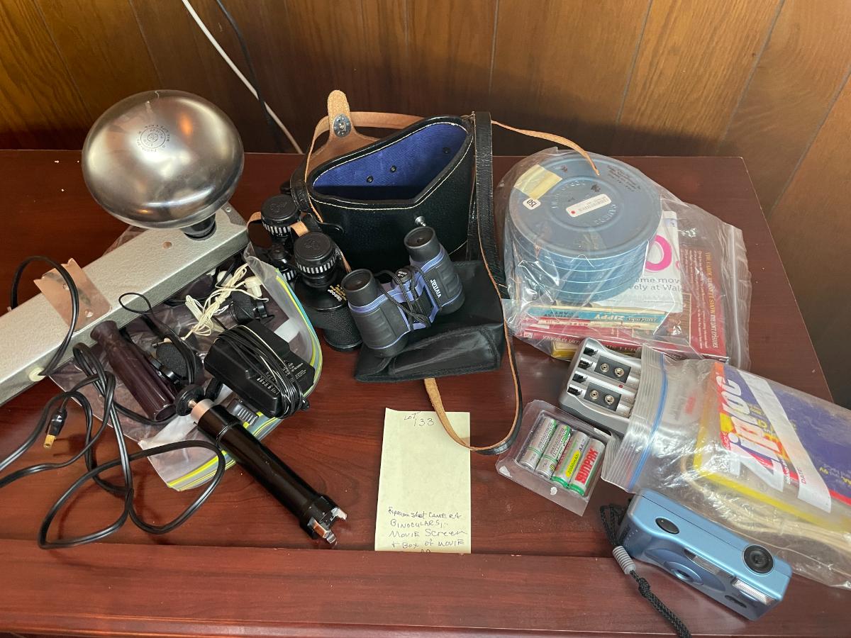 Vintgage Binoculars, 8mm film, Projector screen & ligh