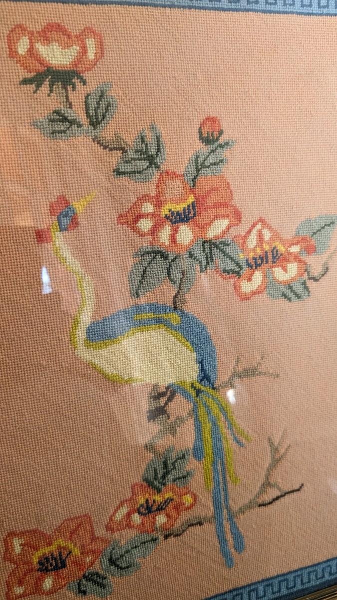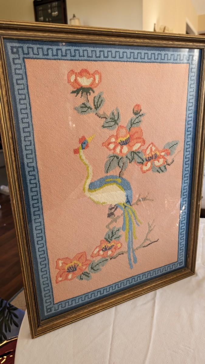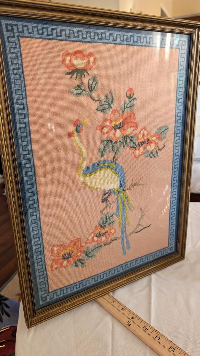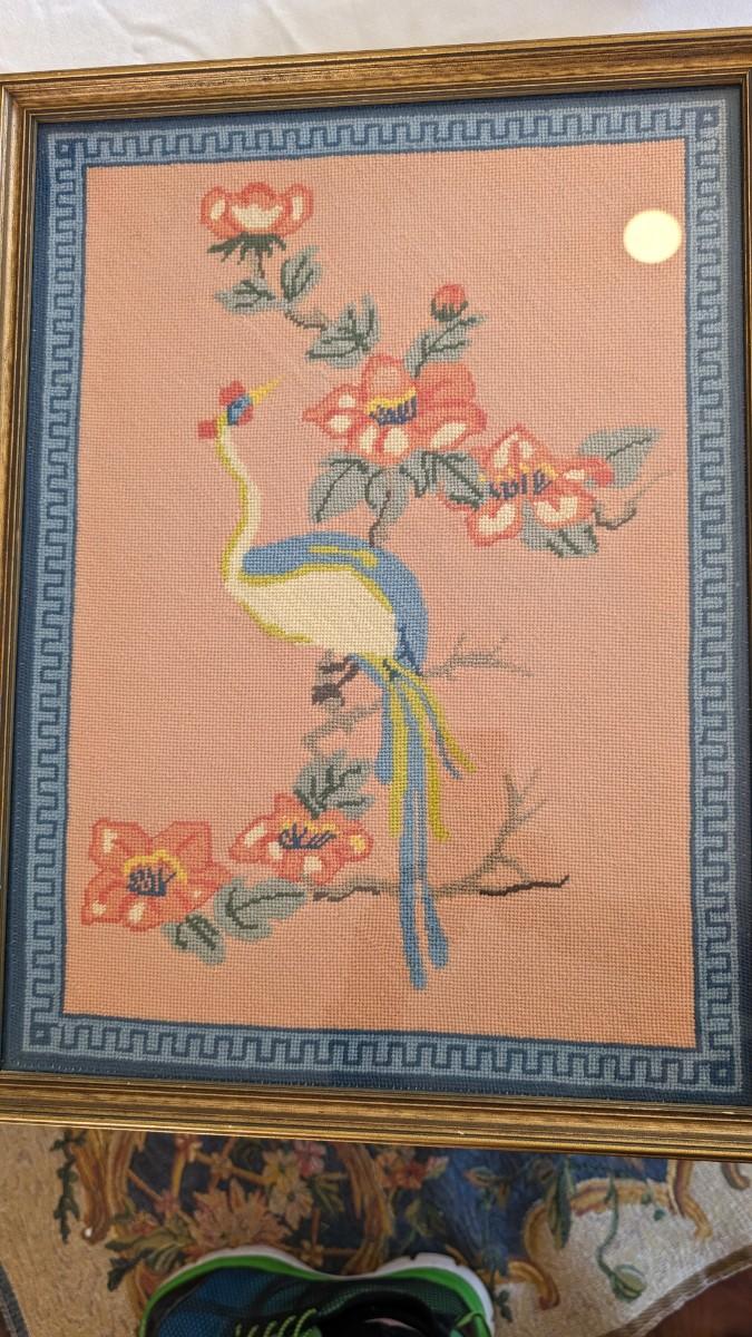 This is a nice vintage hand-made fiber art picture of a bird and flowers on a pink background with a blue border. Approximately 14.5" x 19.25" x 1" frame size