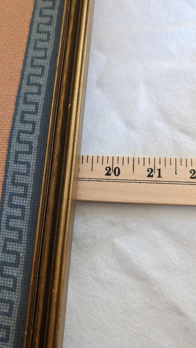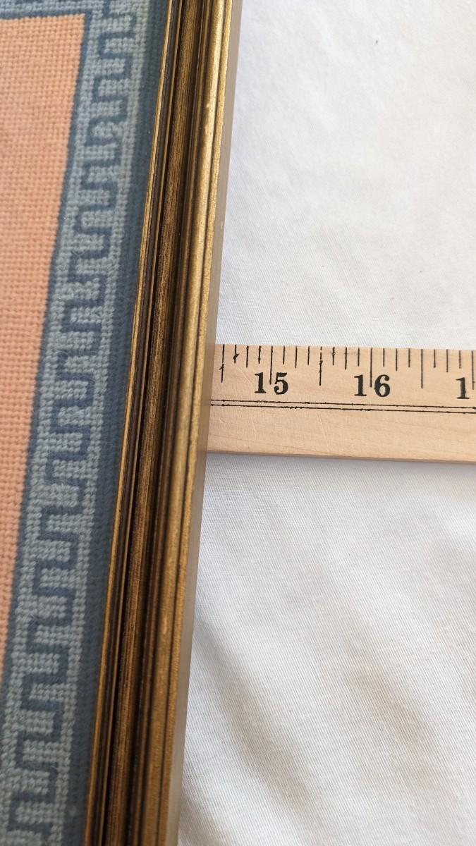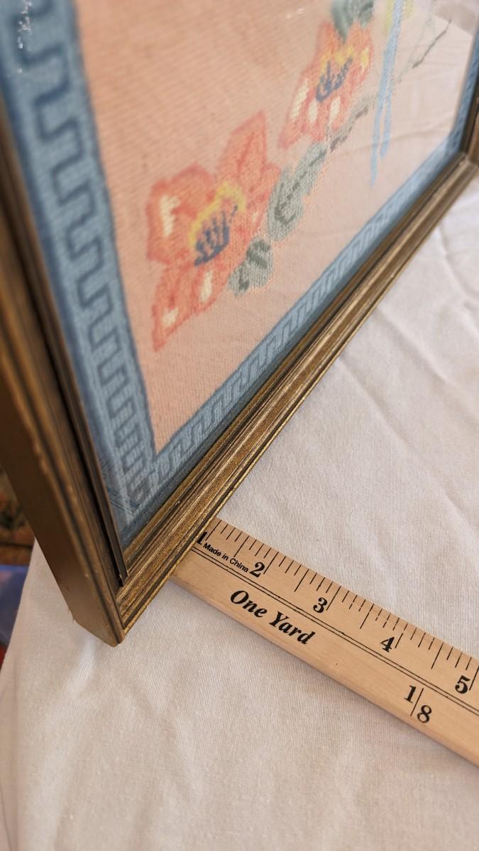 This is a nice vintage hand-made fiber art picture of a bird and flowers on a pink background with a blue border. Approximately 14.5" x 19.25" x 1" frame size