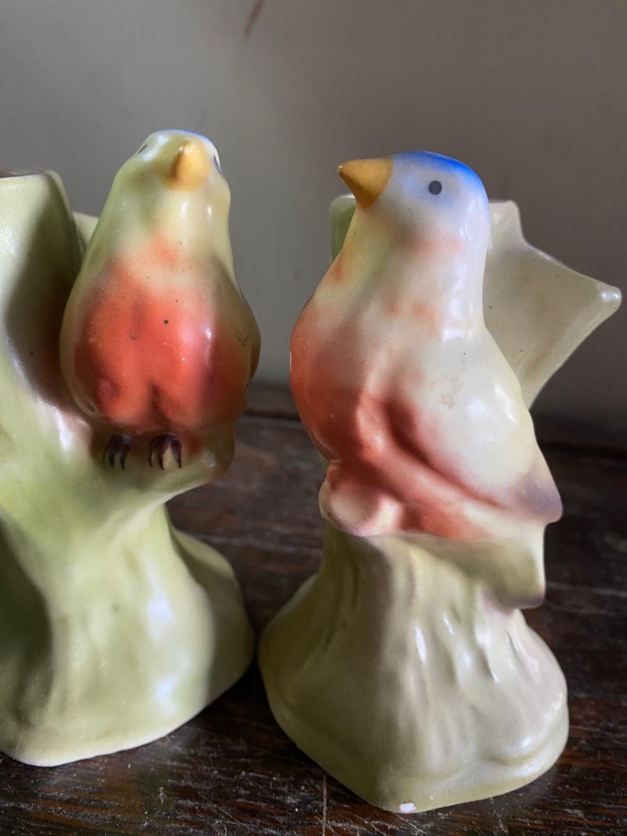 Pair of vintage bird shaped flower frogs, 5”high, small chip on one.