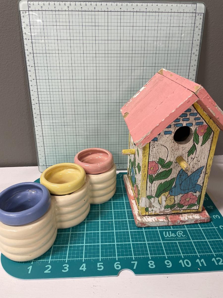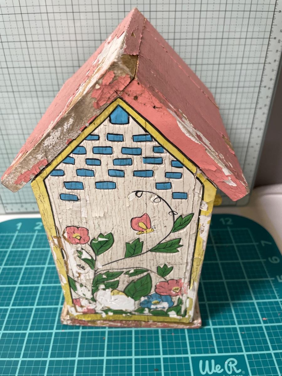 Vintage bird house with flowers and planter