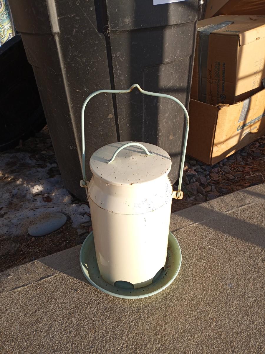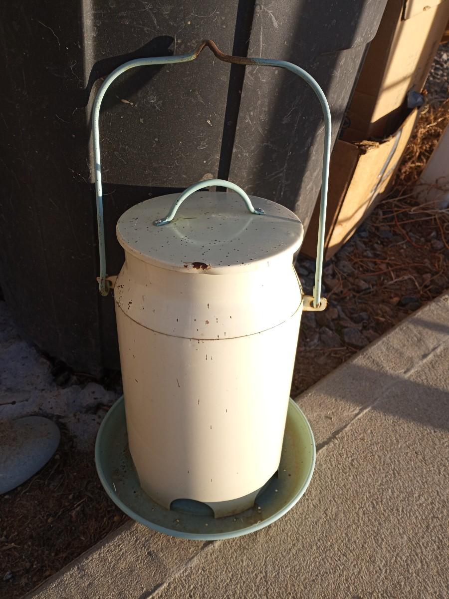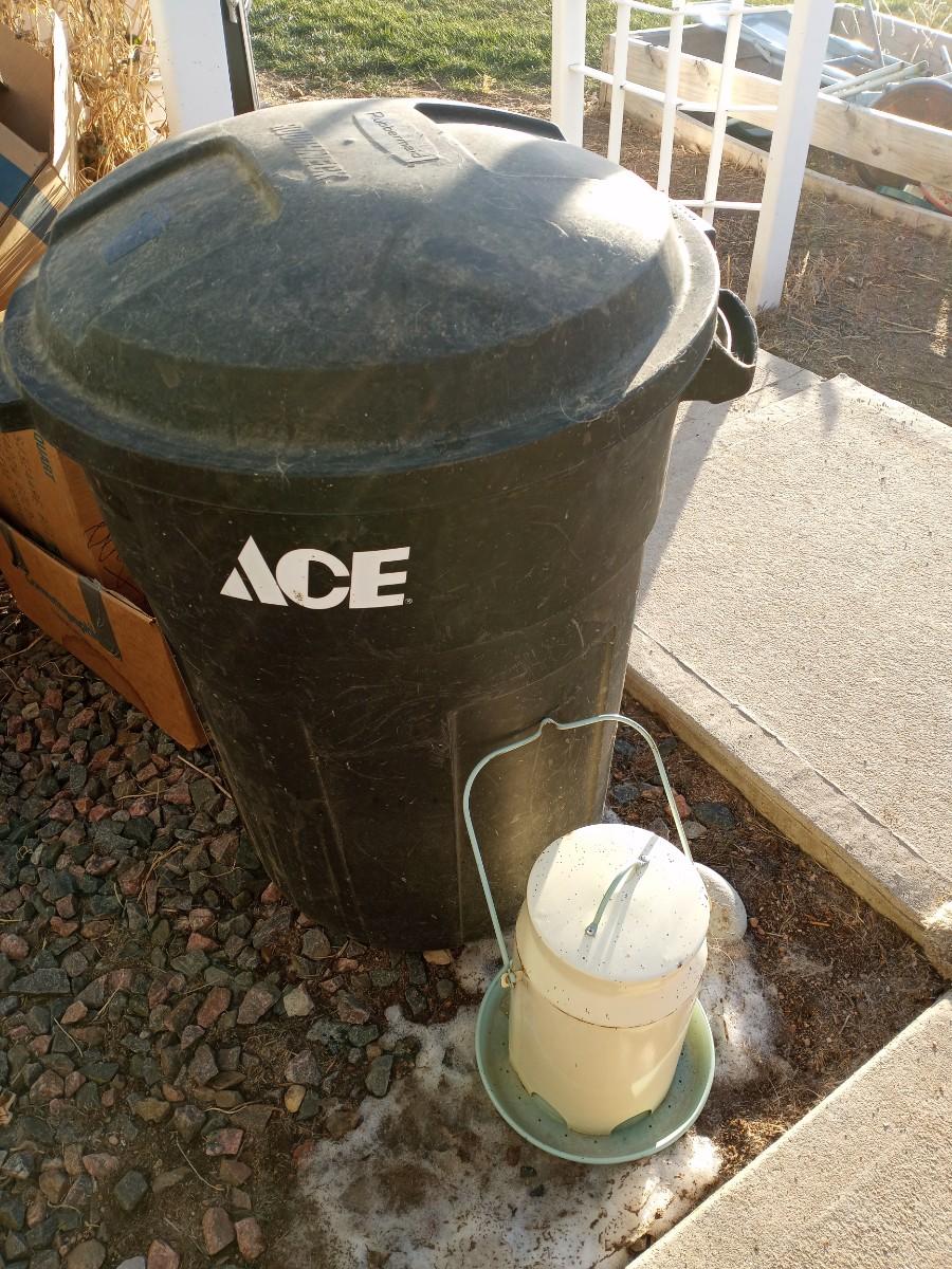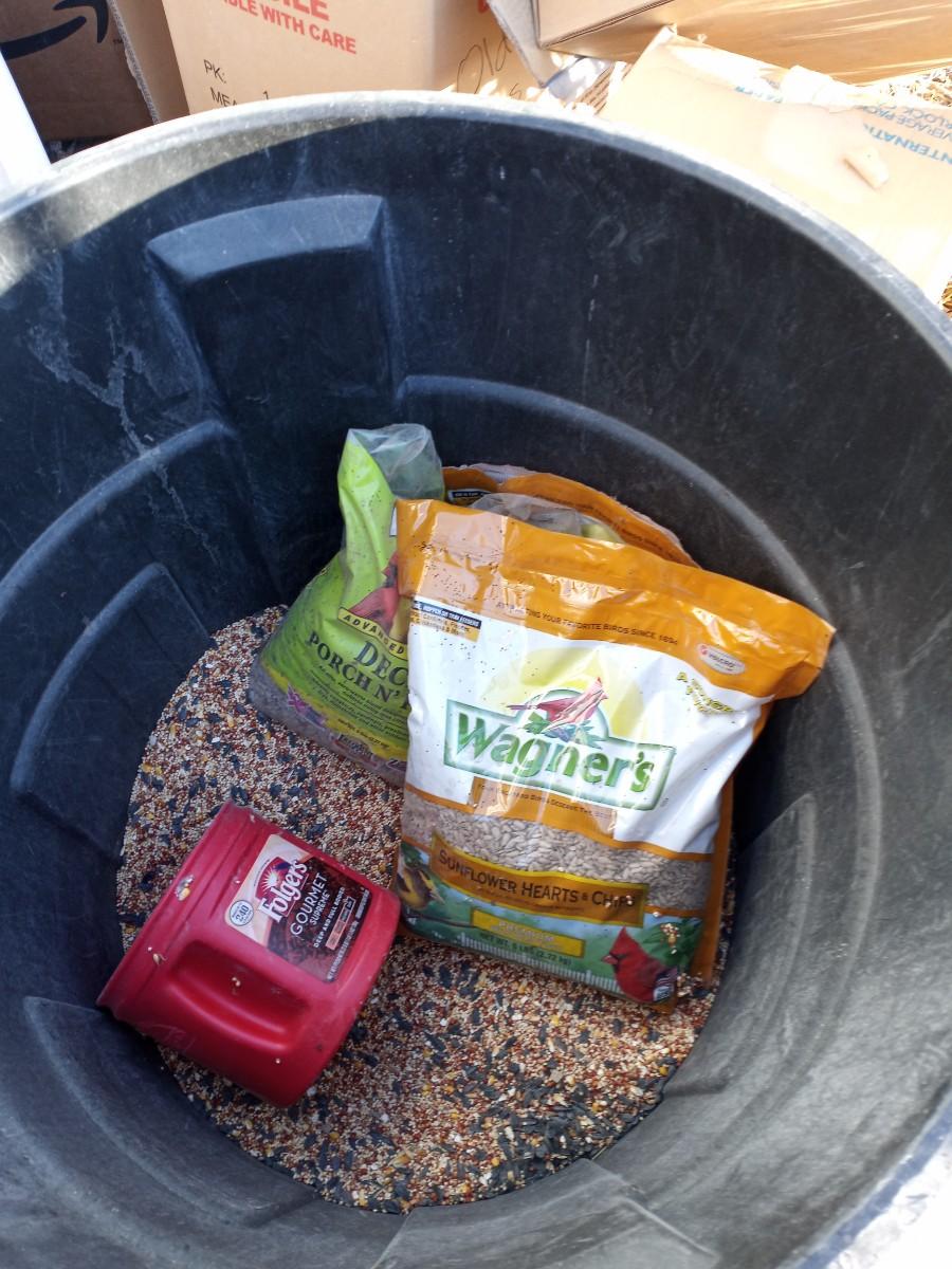 VINTAGE BIRDFEEDER AND RUBBERMAID TRASHCAN WITH BIRDSEED