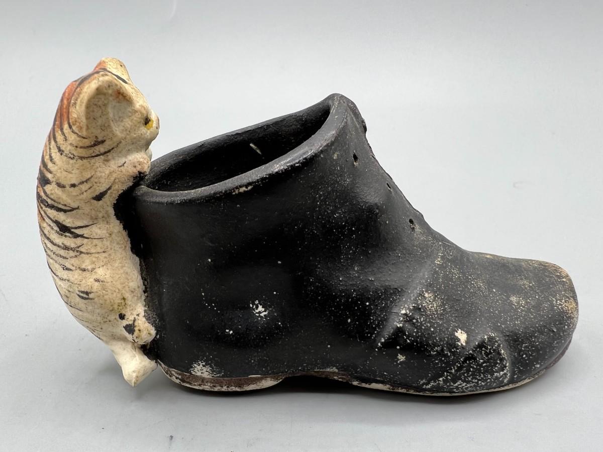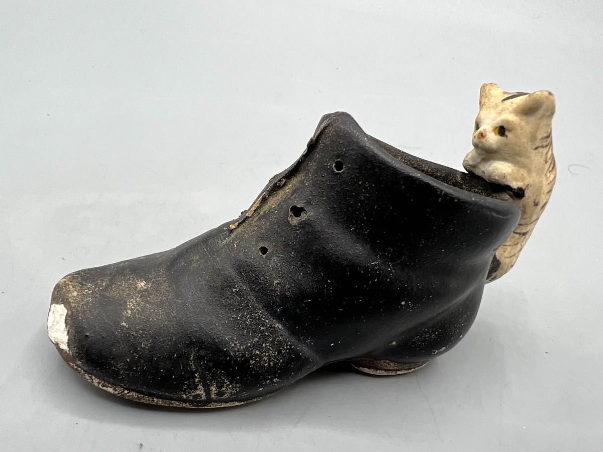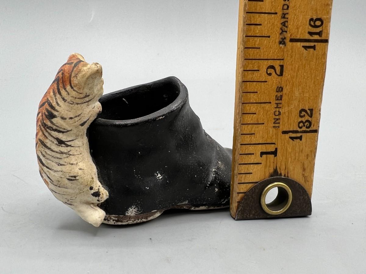 Vintage Bisque Ceramic Vesta Match Holder Shoe with Curious Kitten