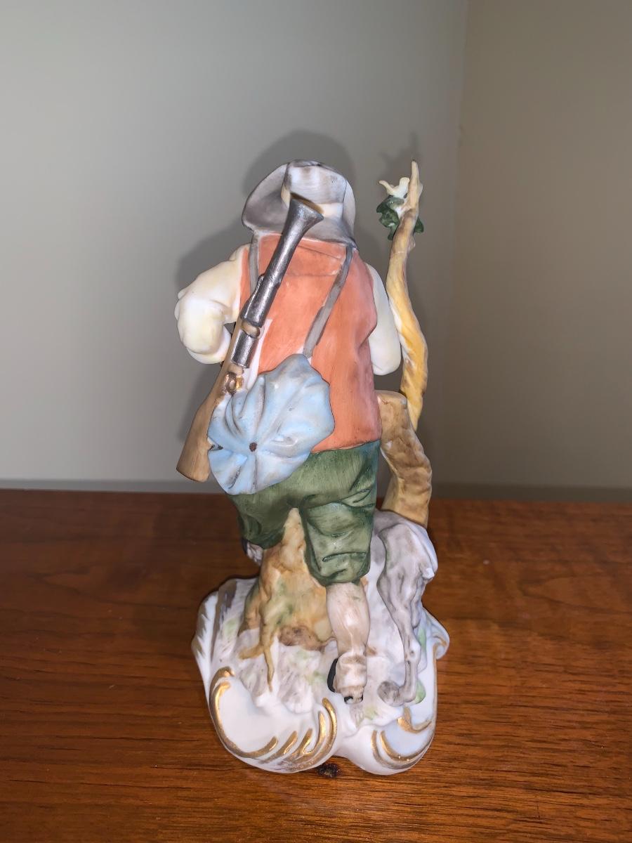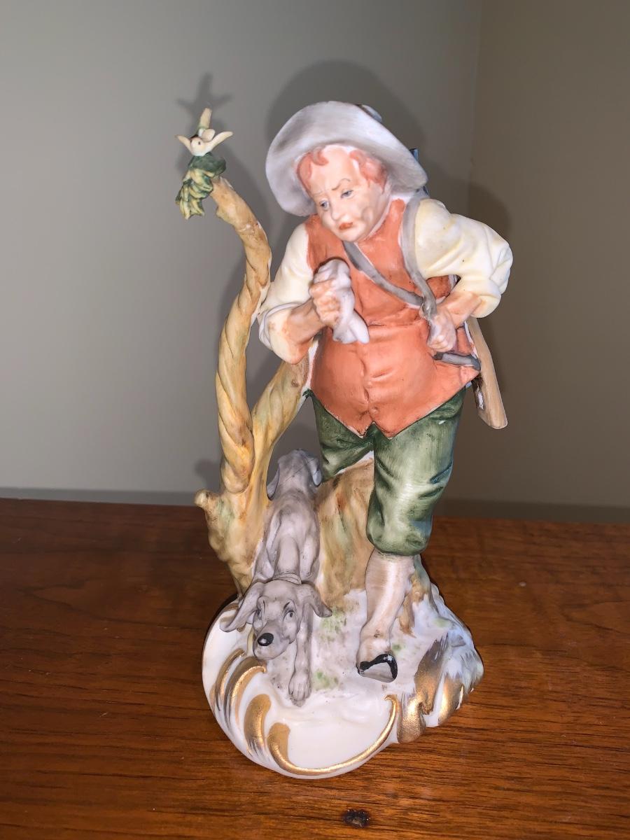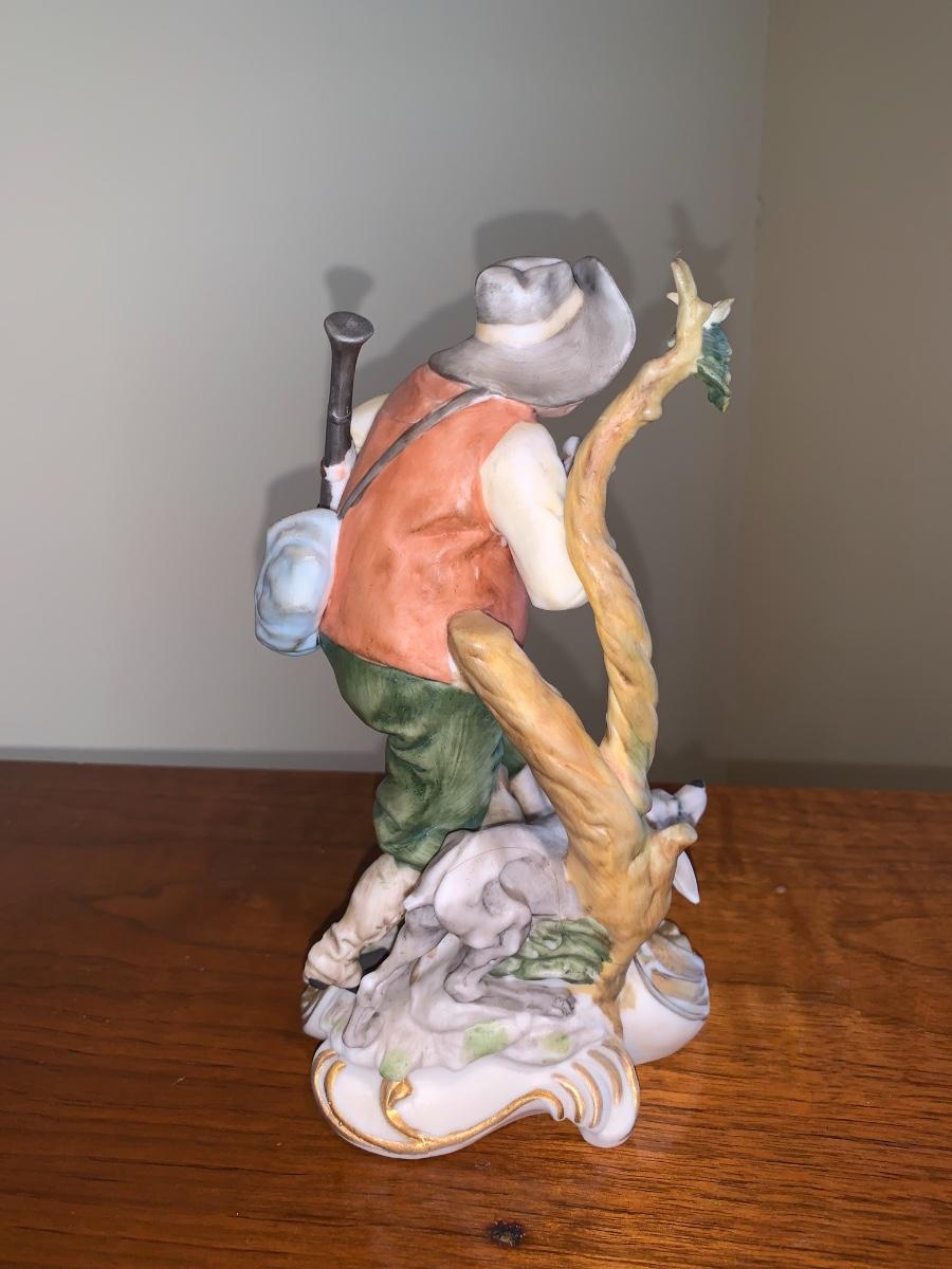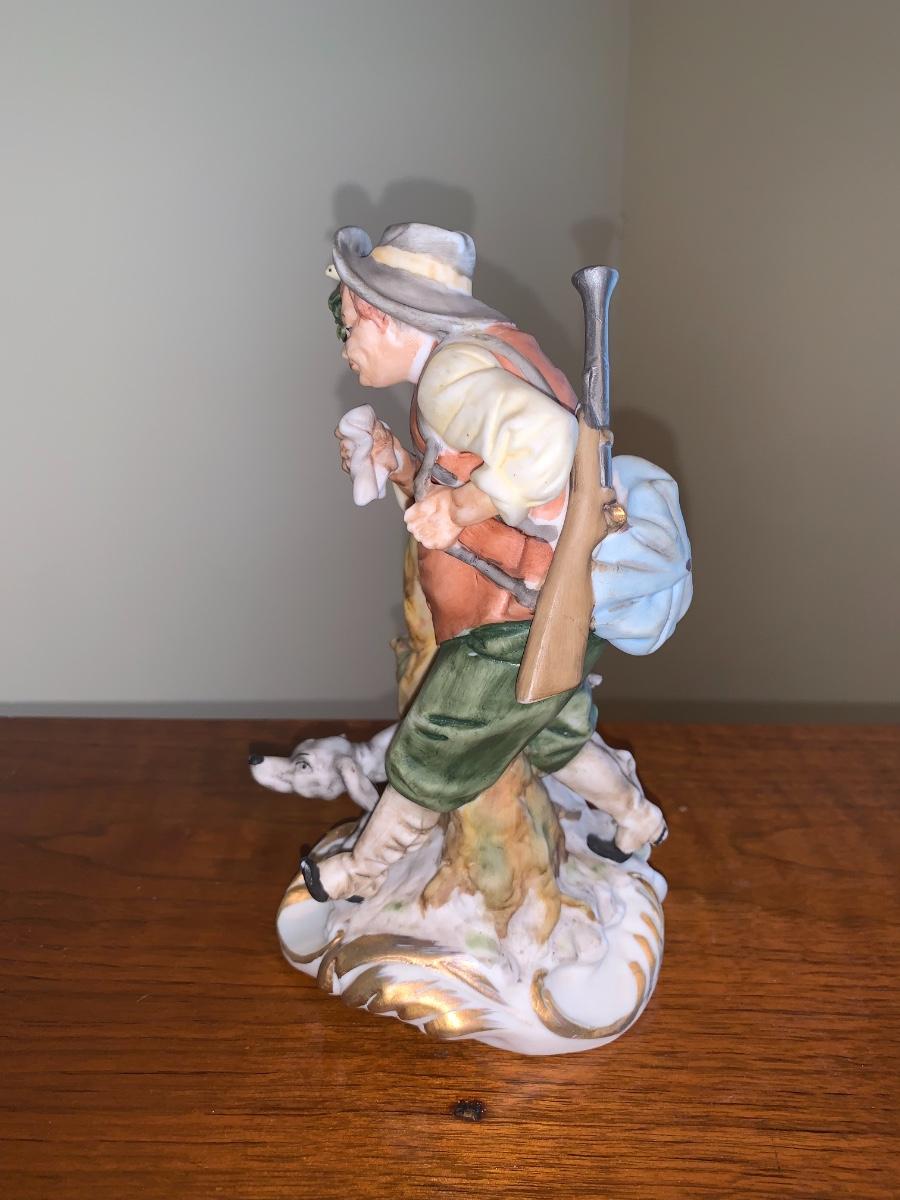 Unsigned bisque figure of hunter with dog in the woods. No damage