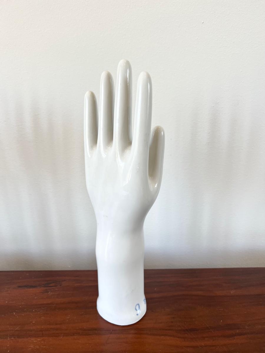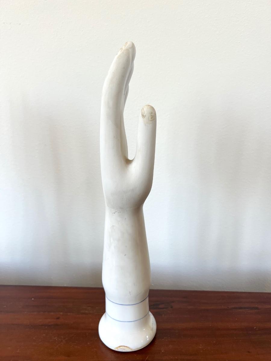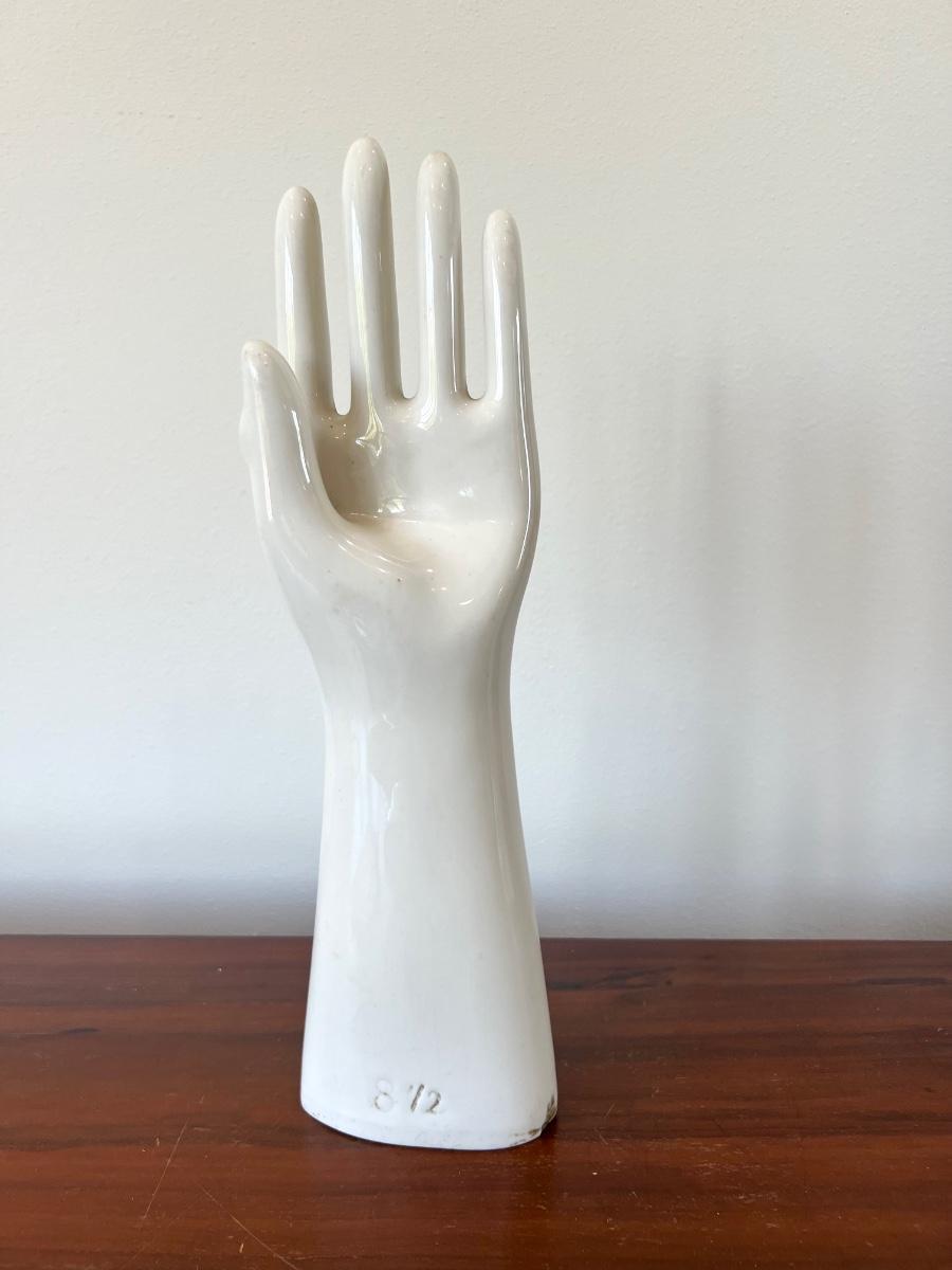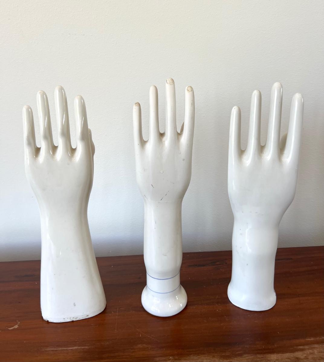 Three piece Vintage Bisque Porcelain Glove Mold USA. size 7 1/2 mold measures 14 inches tall and 4 inches wide. Size 8 1/2 mold measures 14 inches tall and 4 inches wide. Size 9 mold measures 14 inches tall and 4 inches wide.