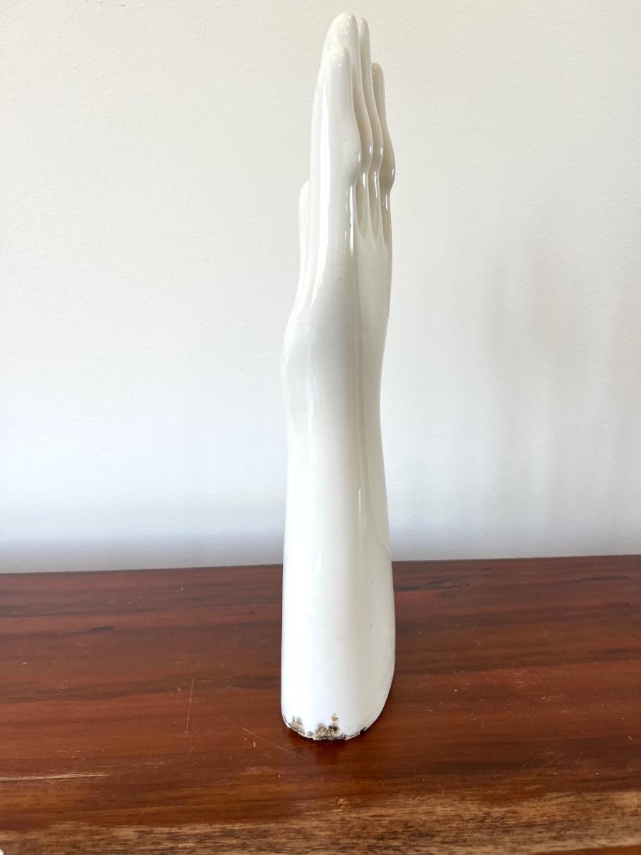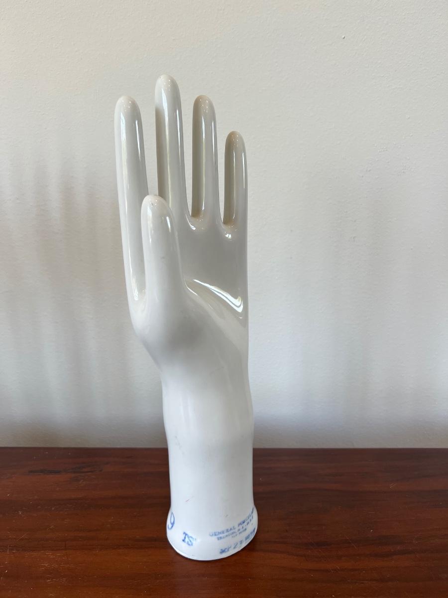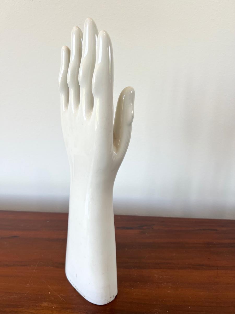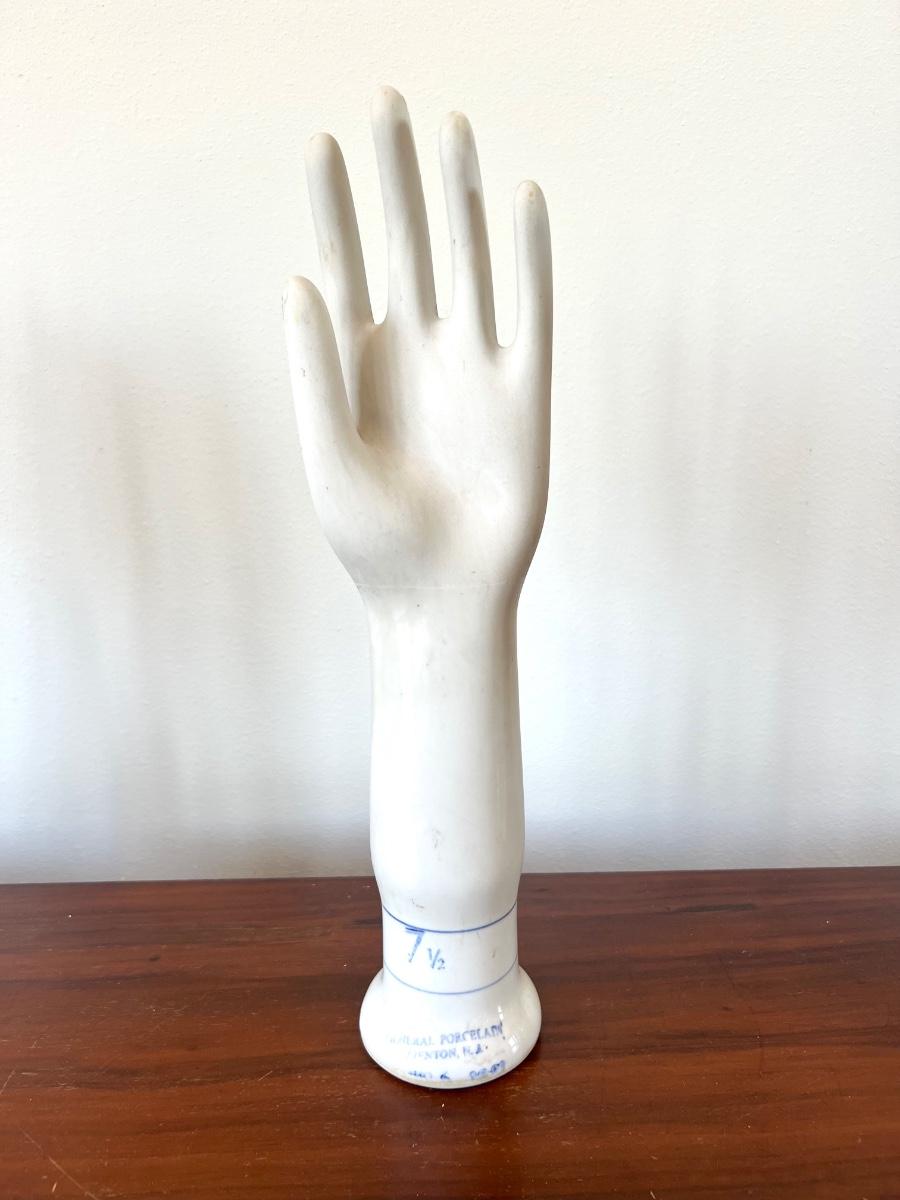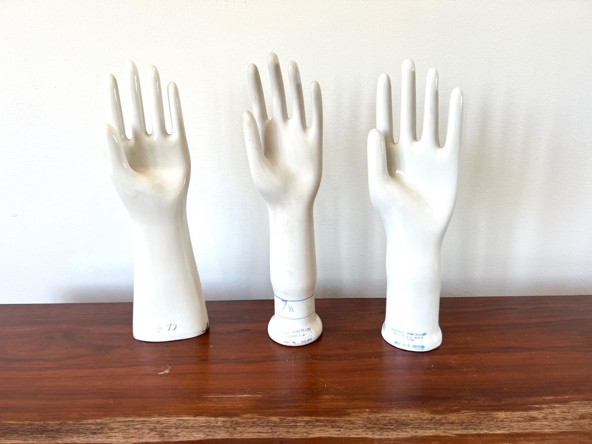 Three piece Vintage Bisque Porcelain Glove Mold USA. size 7 1/2 mold measures 14 inches tall and 4 inches wide. Size 8 1/2 mold measures 14 inches tall and 4 inches wide. Size 9 mold measures 14 inches tall and 4 inches wide.