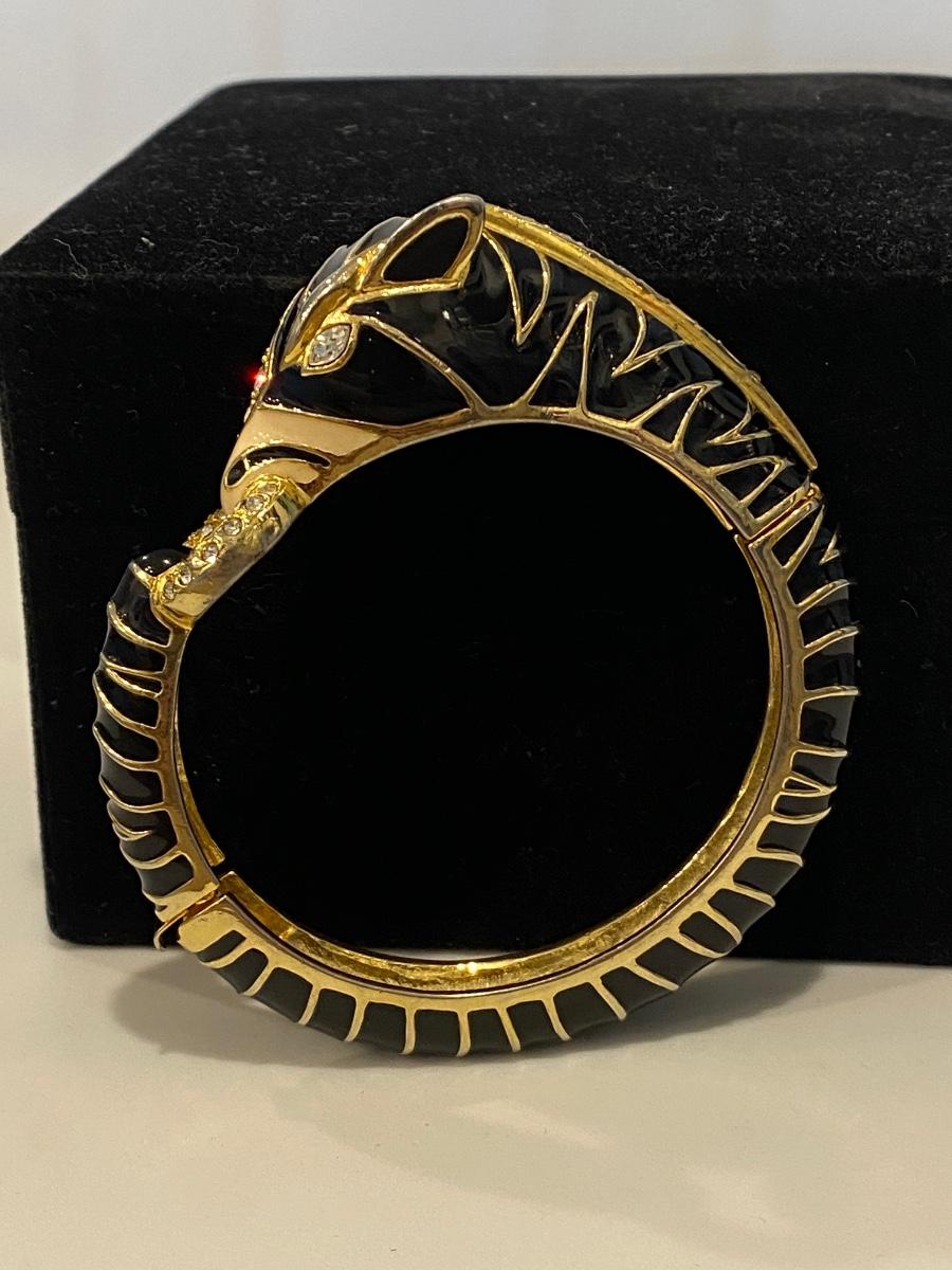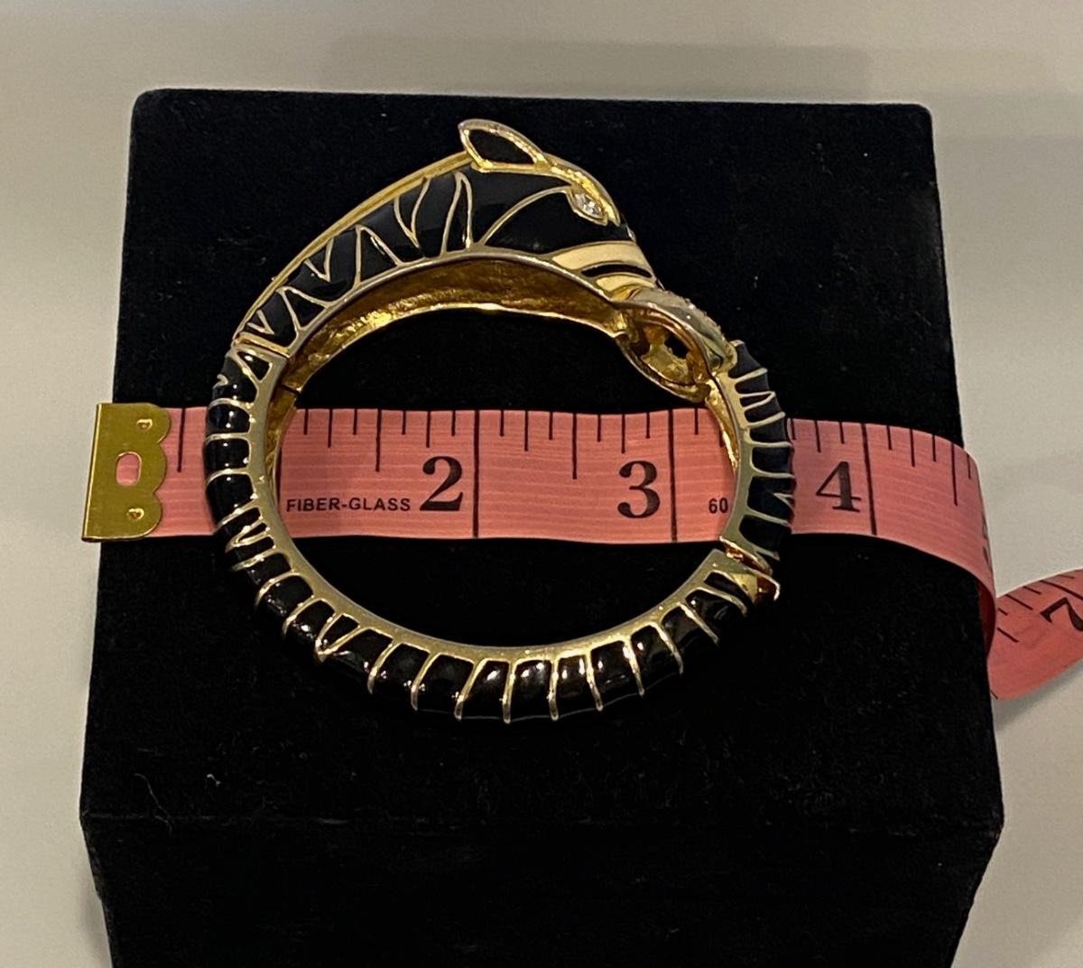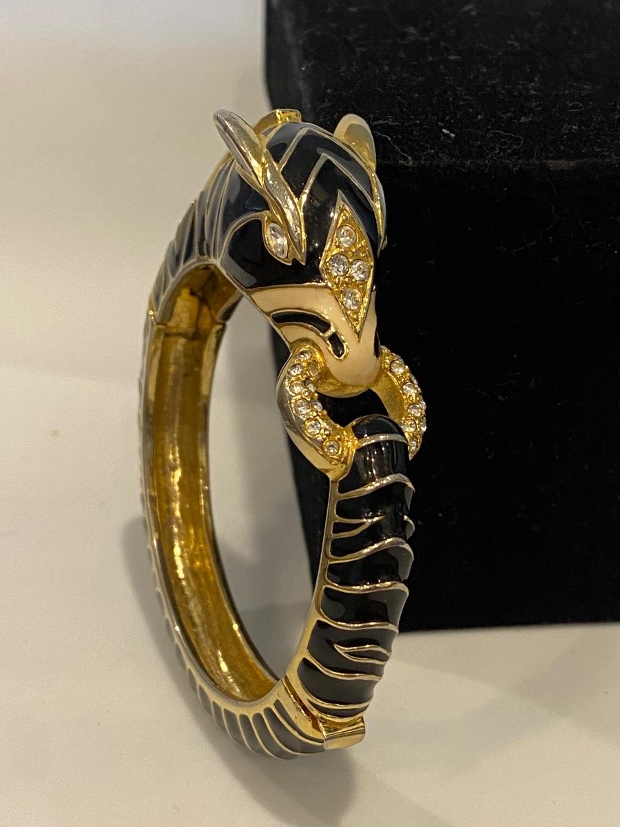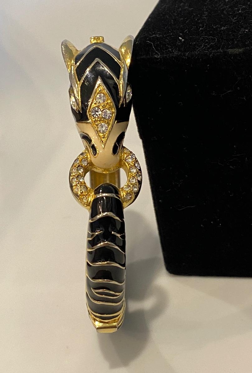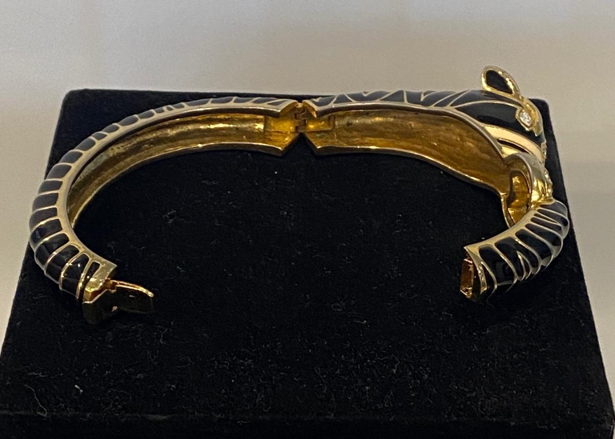 Vintage Black and Gold Enamel Zebra Bracelet with Crystals is a Hinged Bangle Bracelet with Push-In Clasp.