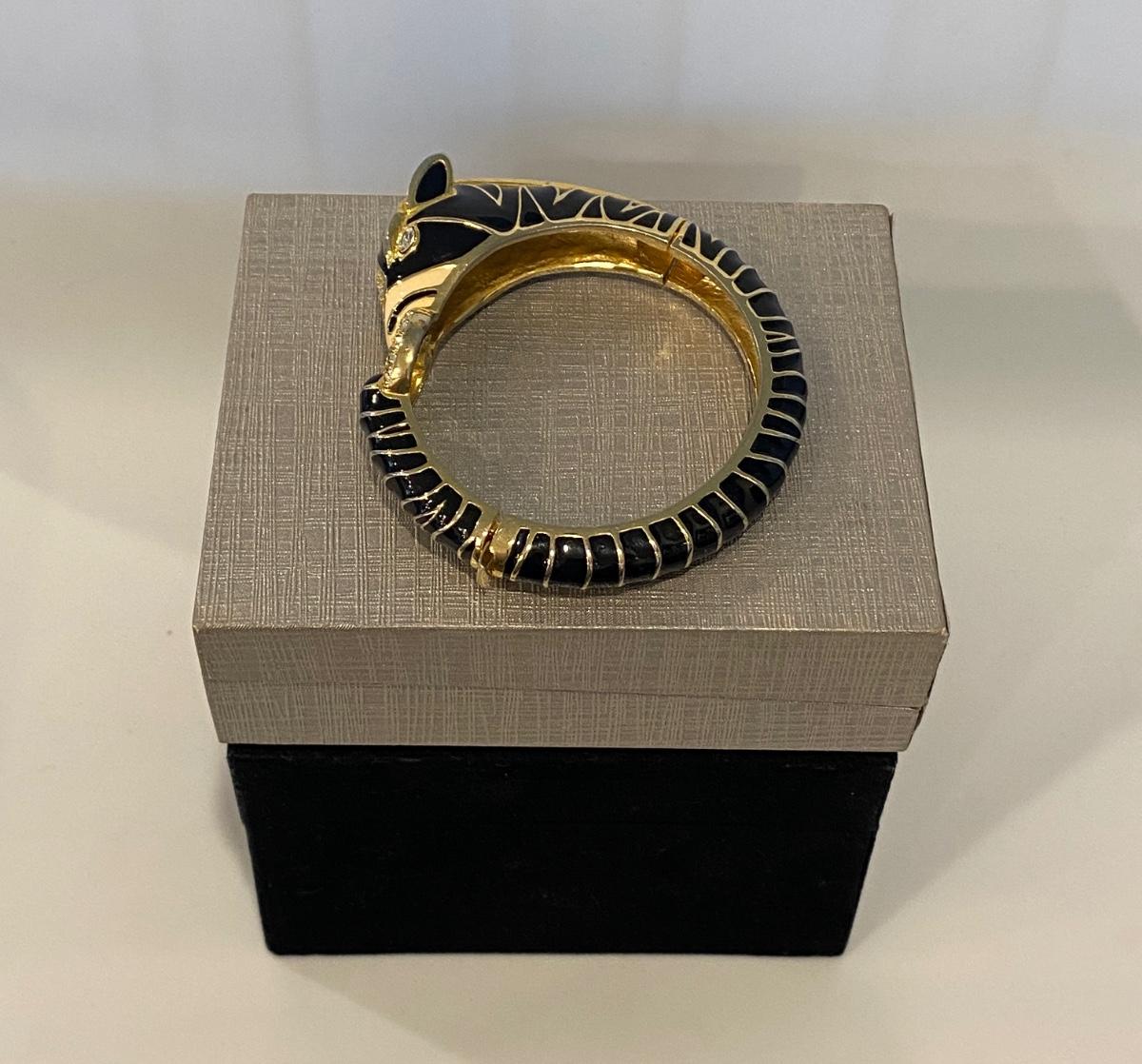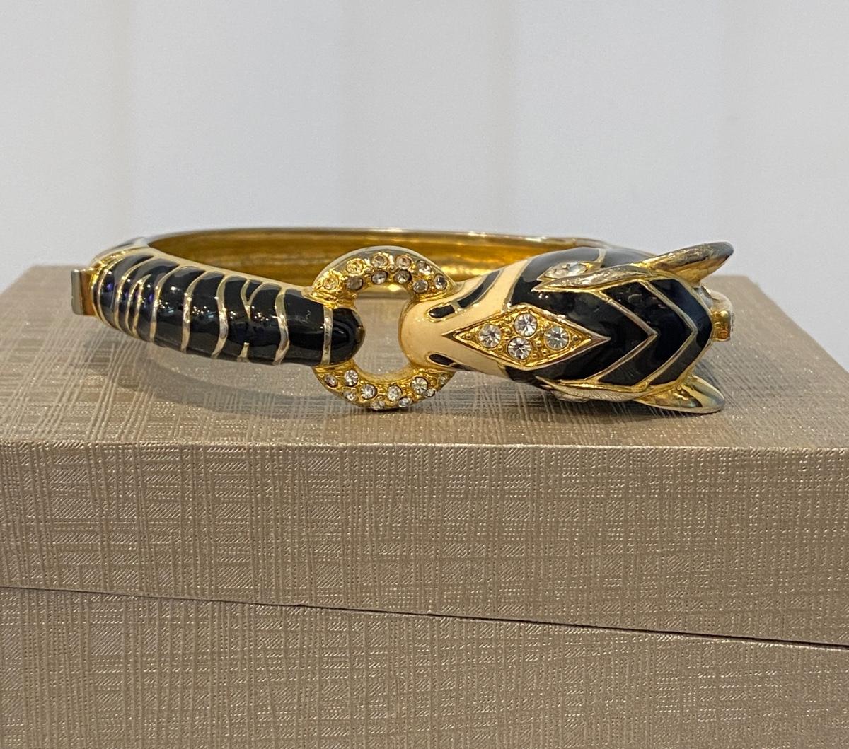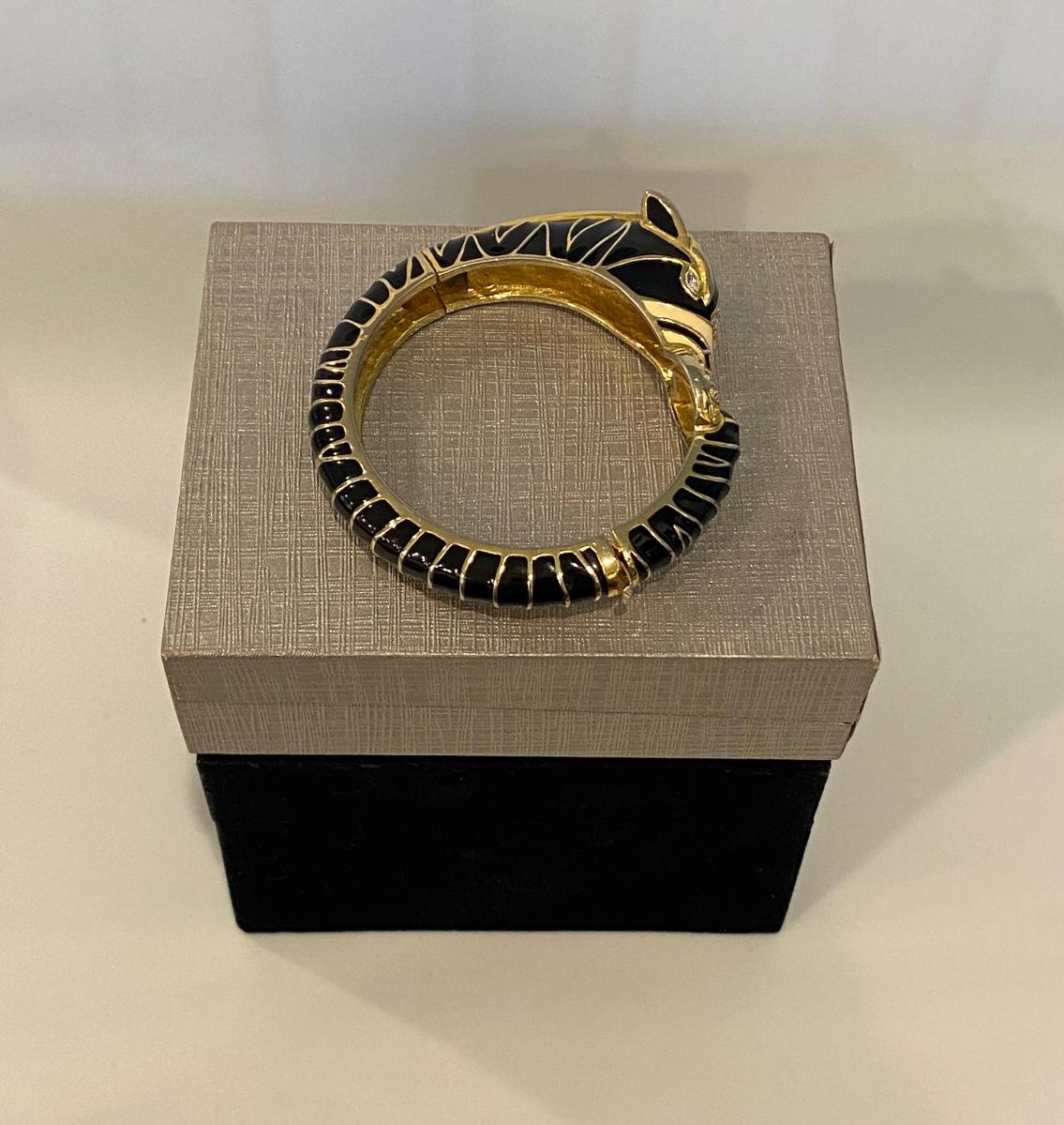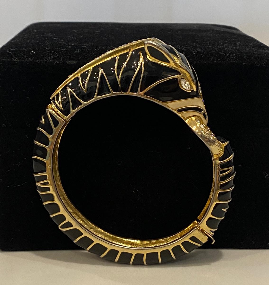 Vintage Black and Gold Enamel Zebra Bracelet with Crystals is a Hinged Bangle Bracelet with Push-In Clasp.