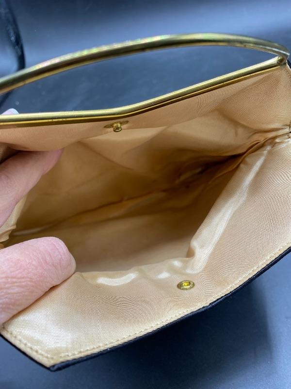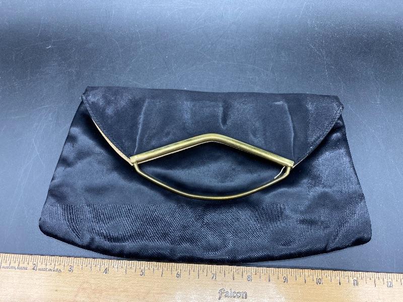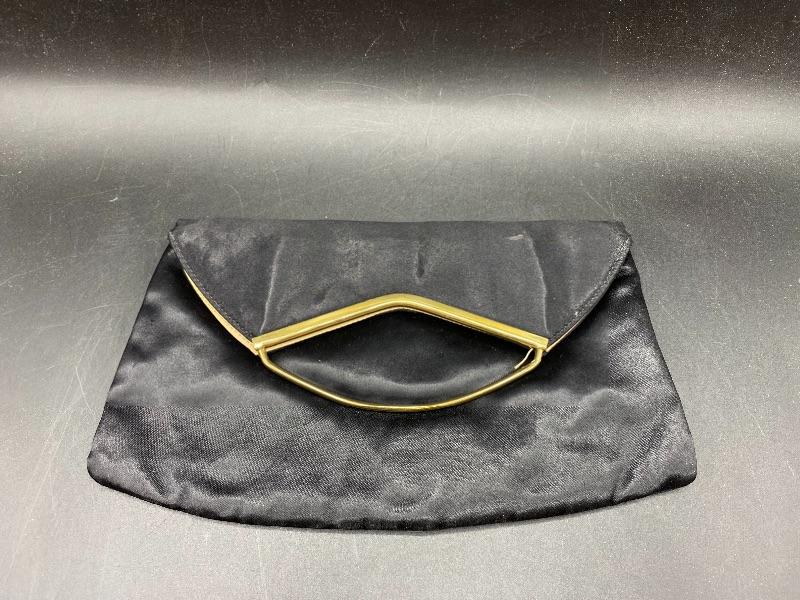 Vintage black satin clutch. Gold tone metal work accent. Fold over snap closure. Outside pocket. Pale gold inner lining. There is some signs of light wear and use inside and out.