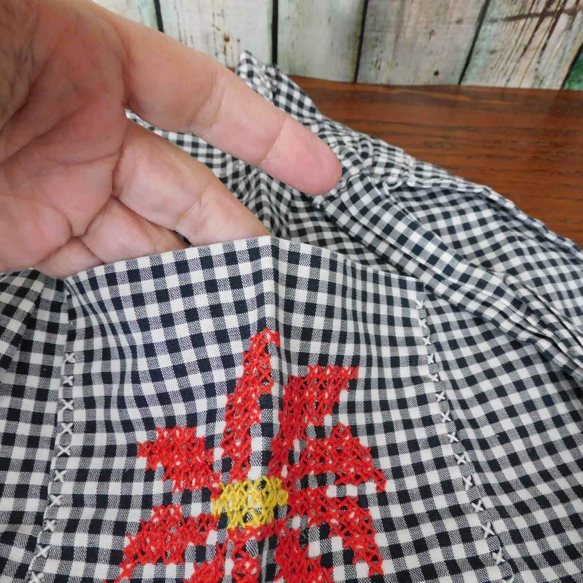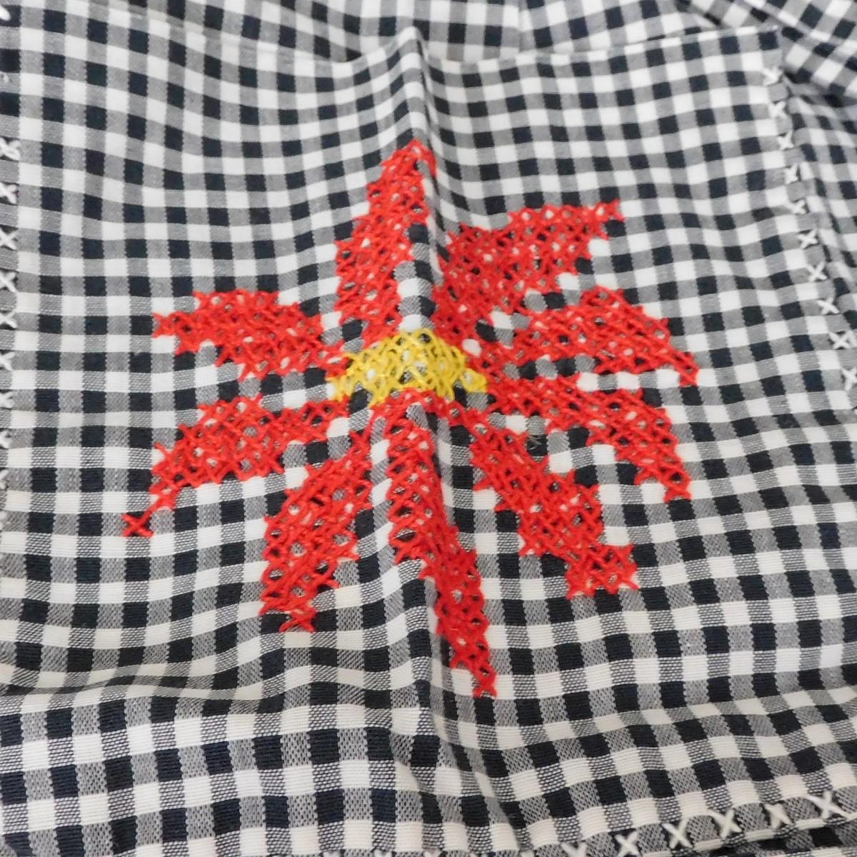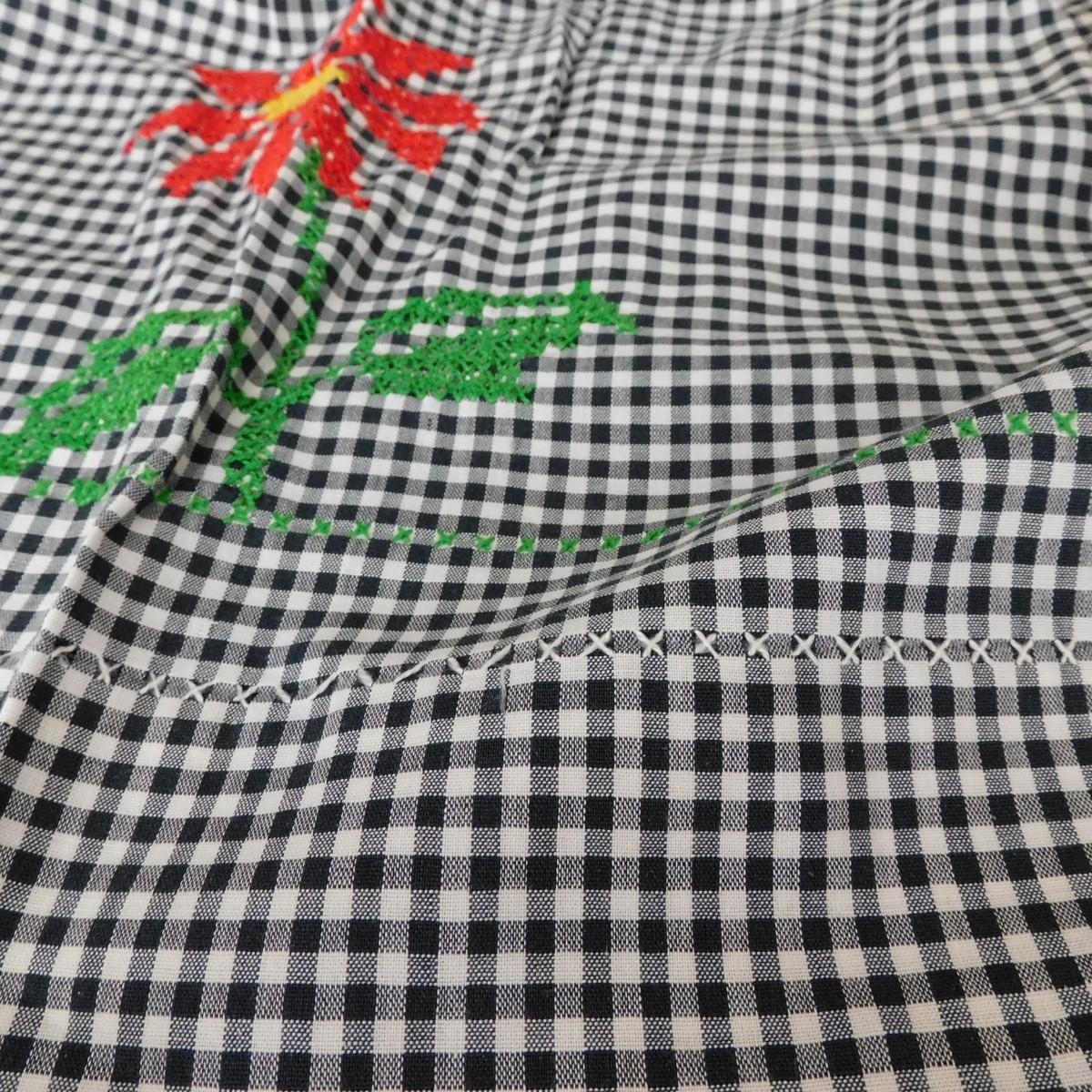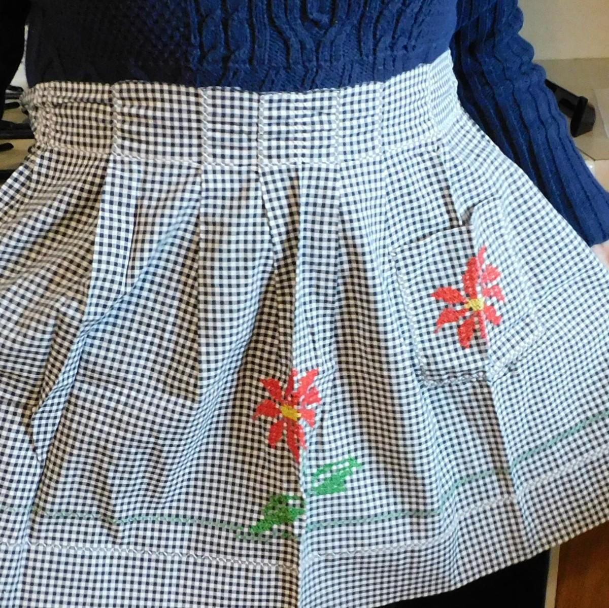 This is a vintage half apron that is black and white checks. It has cross stitch design. It is about 32" x 18".