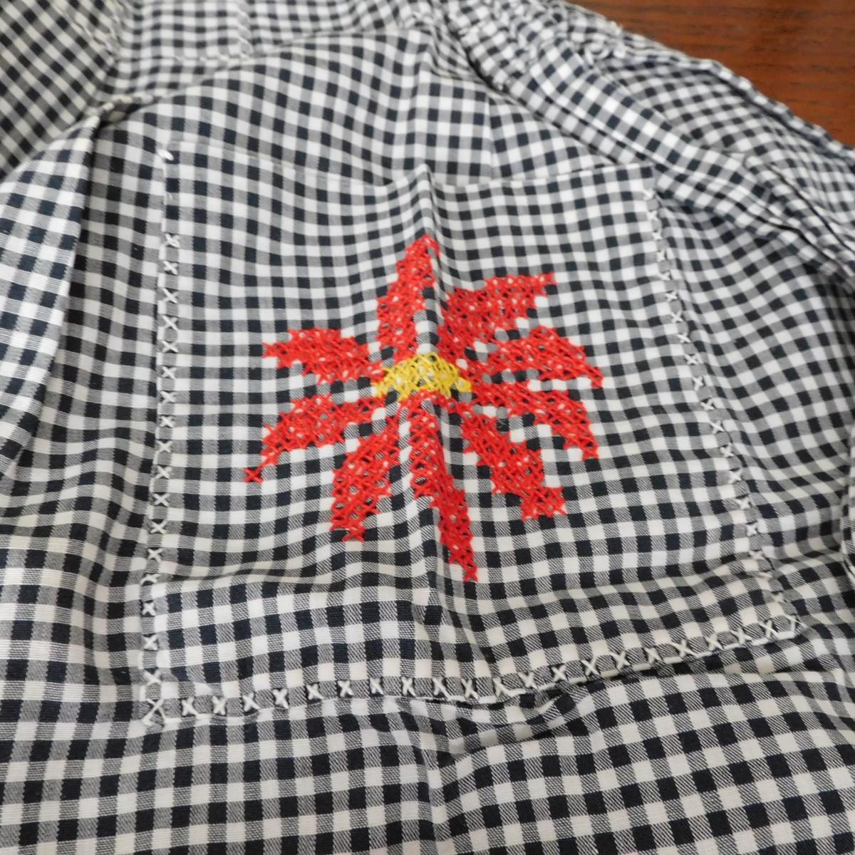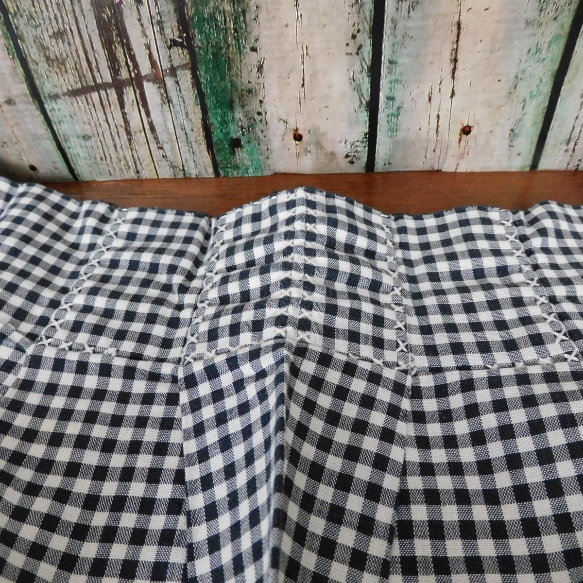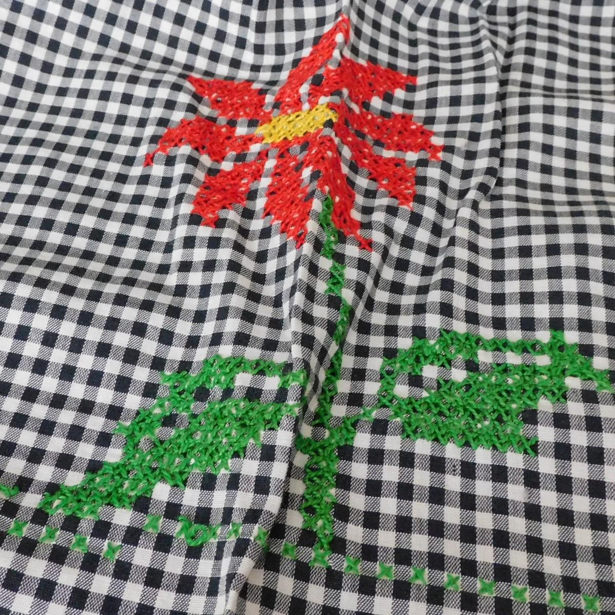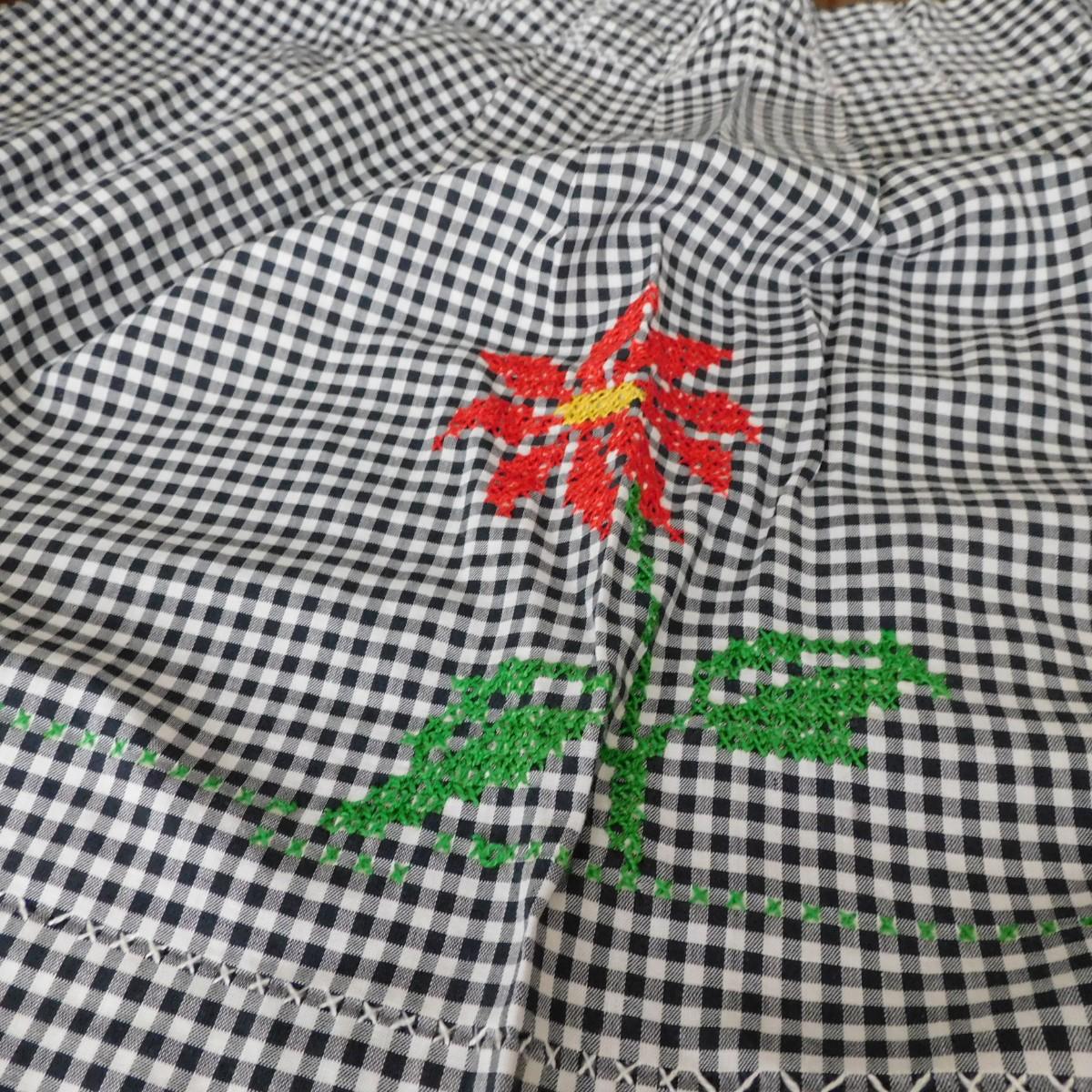 This is a vintage half apron that is black and white checks. It has cross stitch design. It is about 32" x 18".