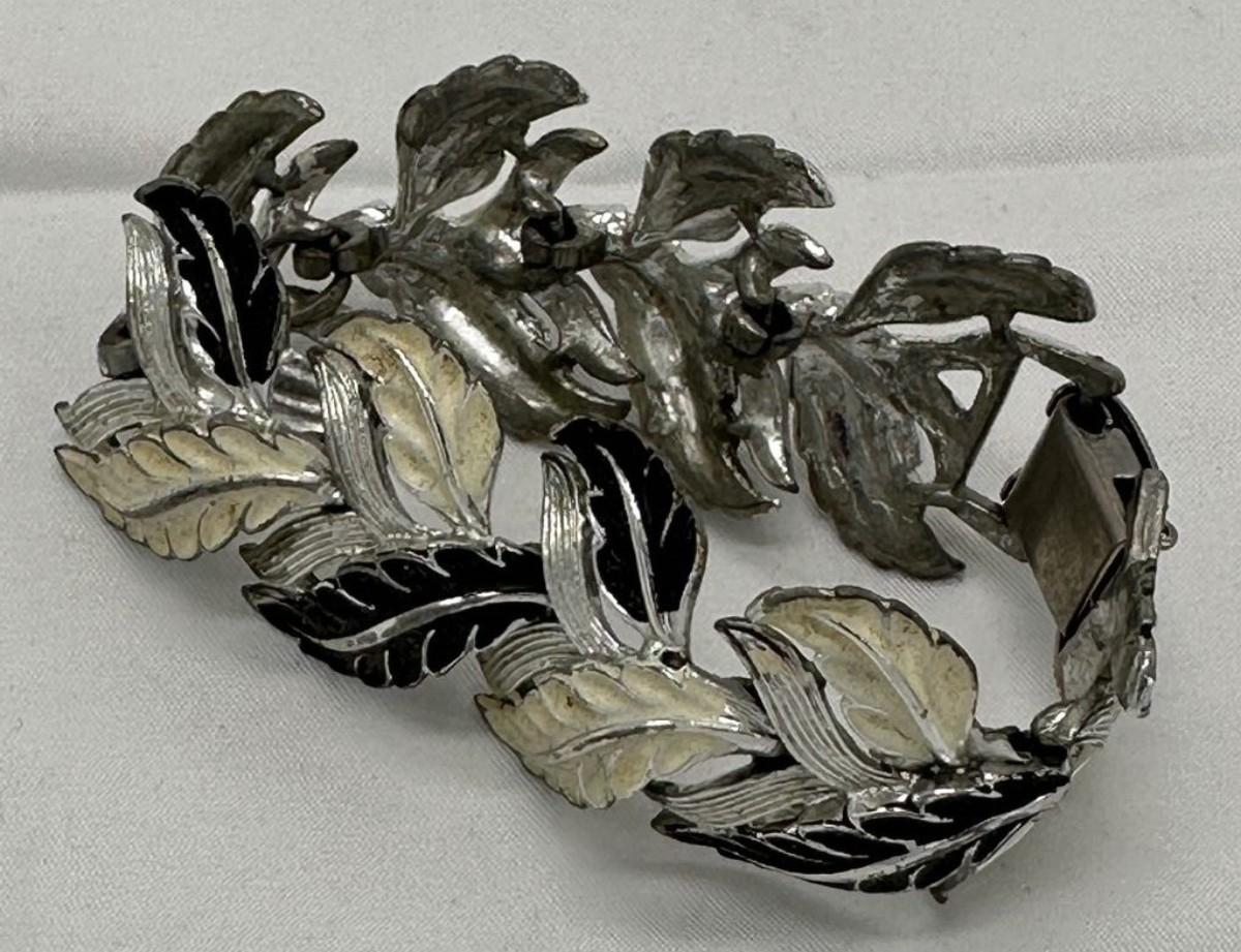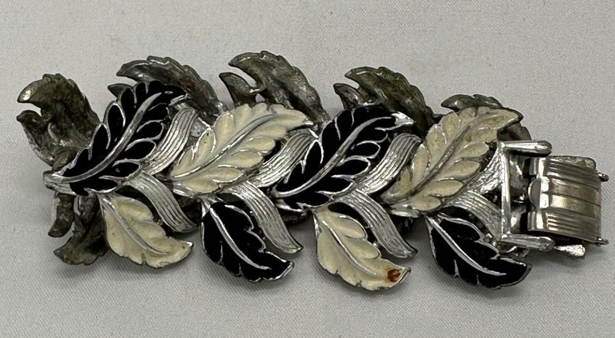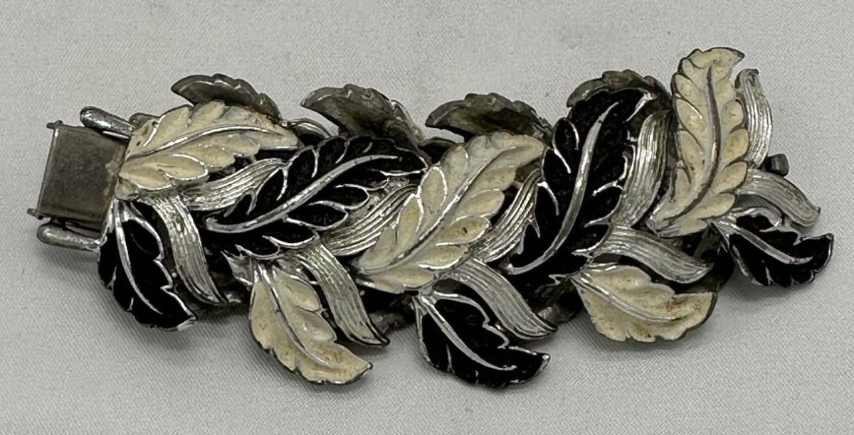 Vintage Black and White enamel leaves bracelet Wide silver tone leaf bracelet Statement leaf link bracelet for woman