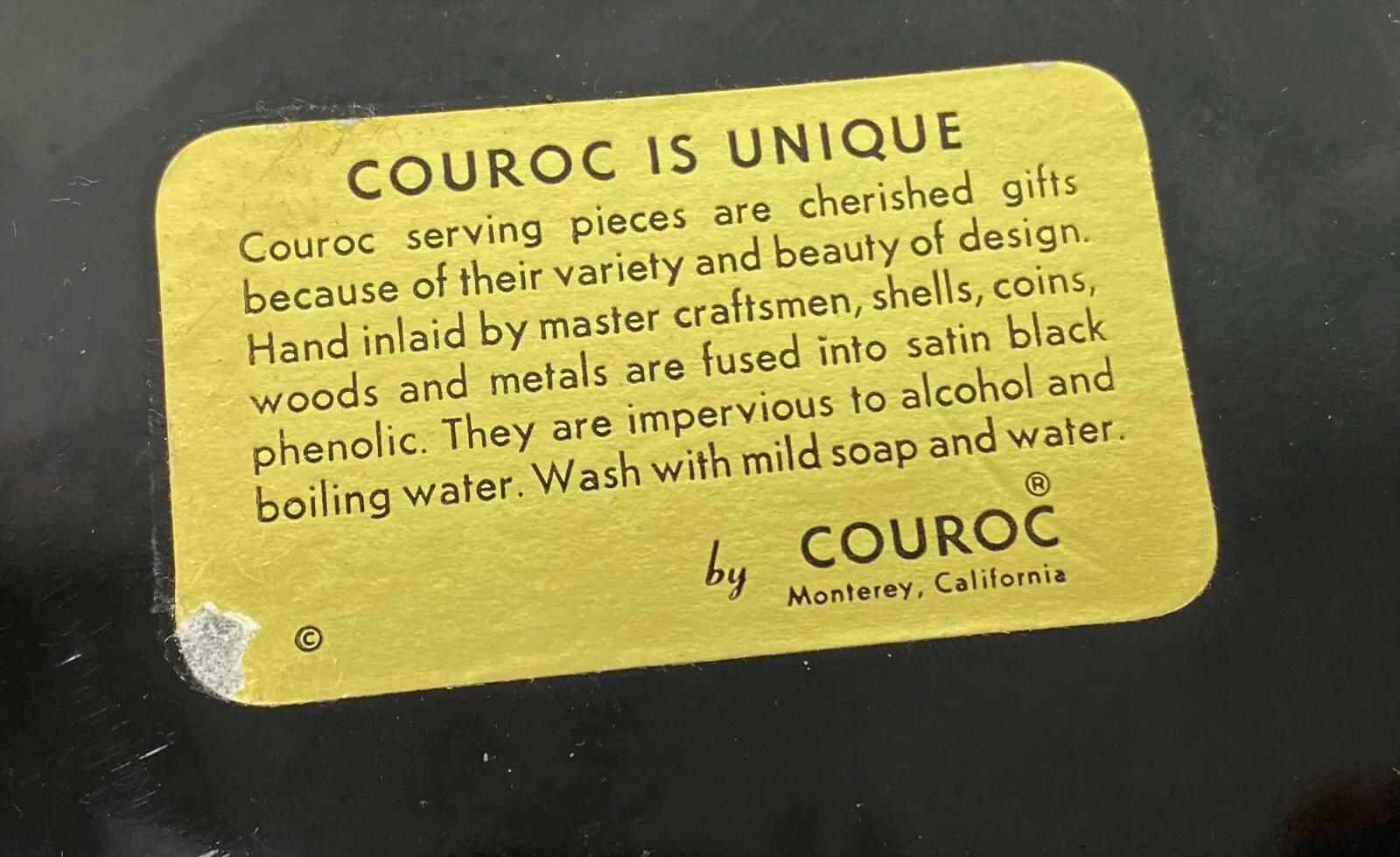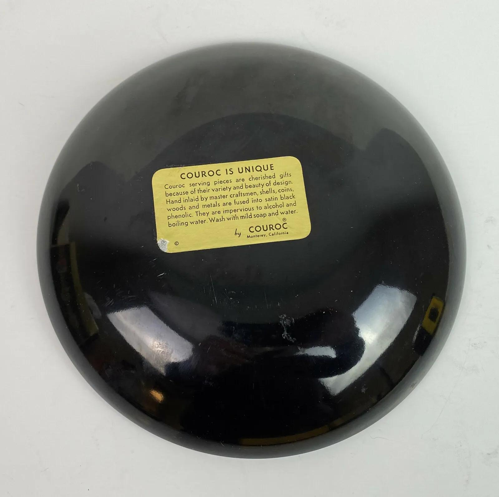 In very good condition here is a vintage decorative bowl with an inlaid image of a Roadrunner...from Couroc of Monterey...Measures 7 3/4" in diameter...Retains its original foil label explaining the process for these art plates..