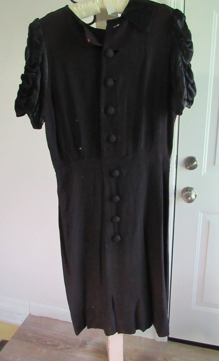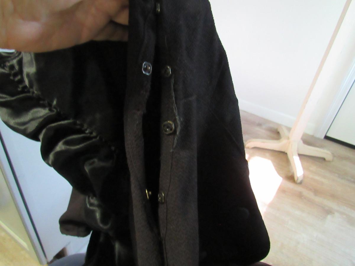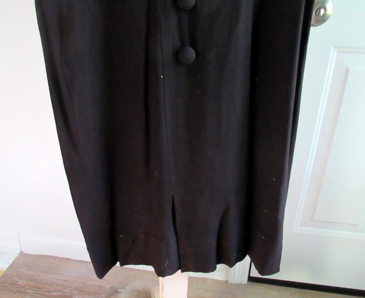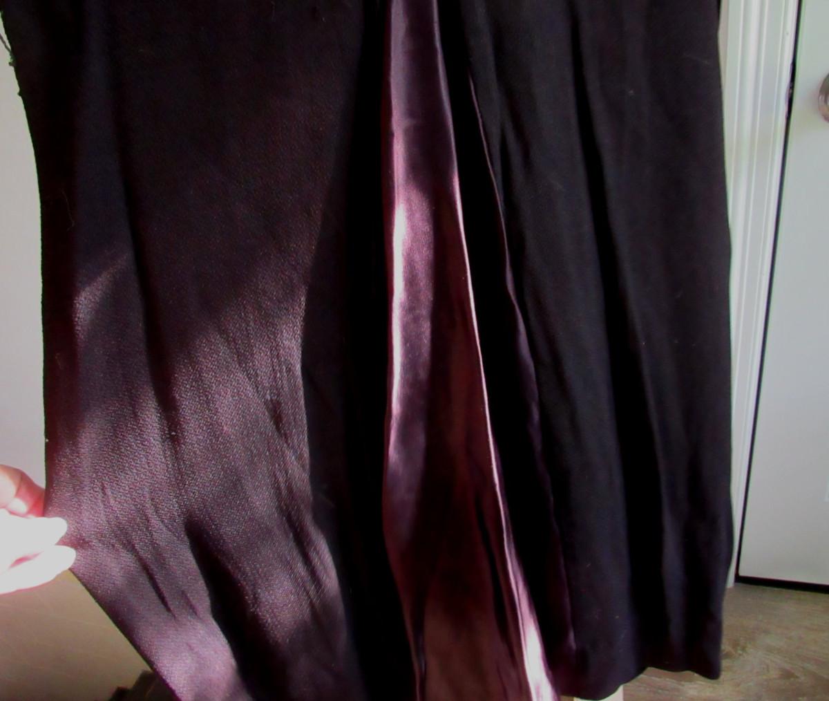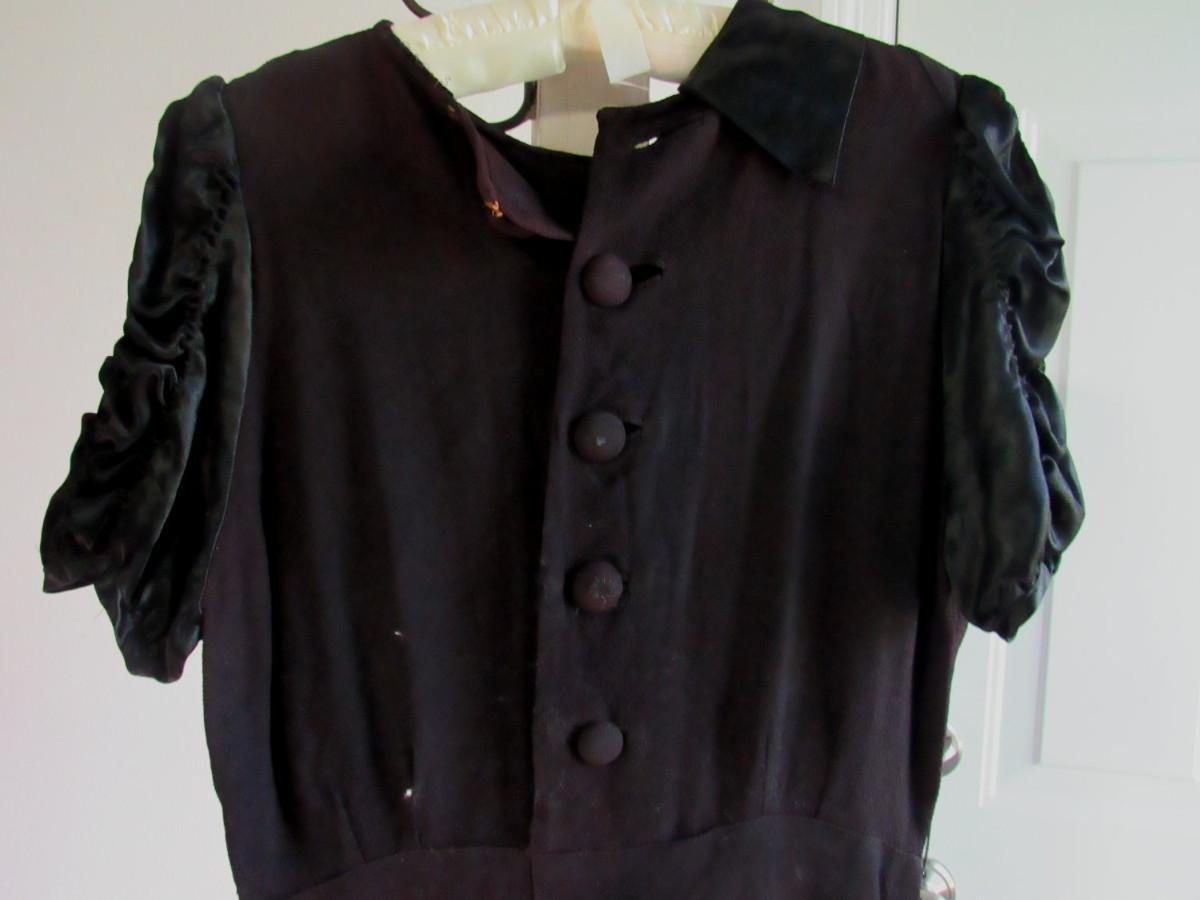 Note, it is black, not black and purple. Just lighting issues. Fabric covered buttons on back, snaps at side seam, 1 snap missing. No makers labels, size unknown. Puffy sleeves with fabric inset from waist to hem. Partially machine and hand stitched. Shipping available at shipping cost plus $5.00 per box handling fee. No returns or refunds. See our terms for details.