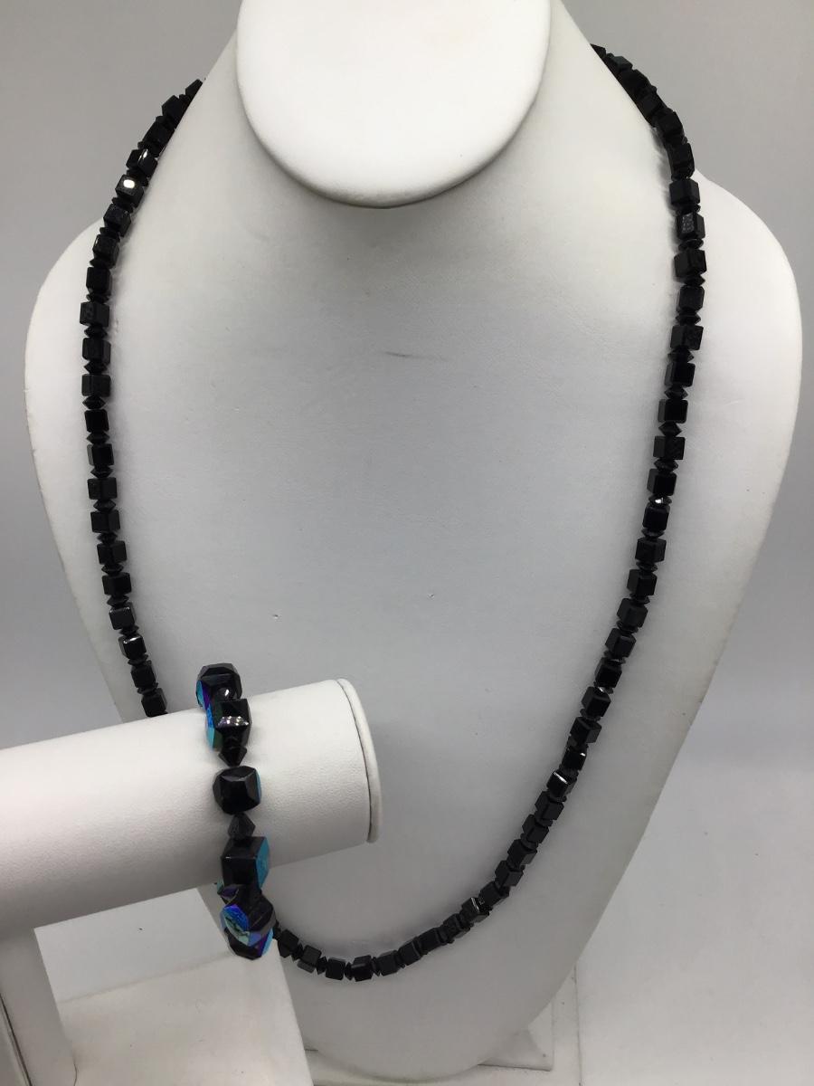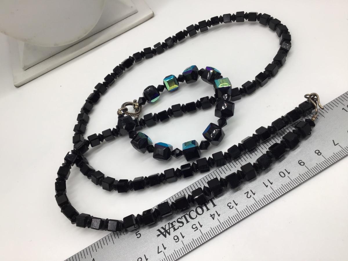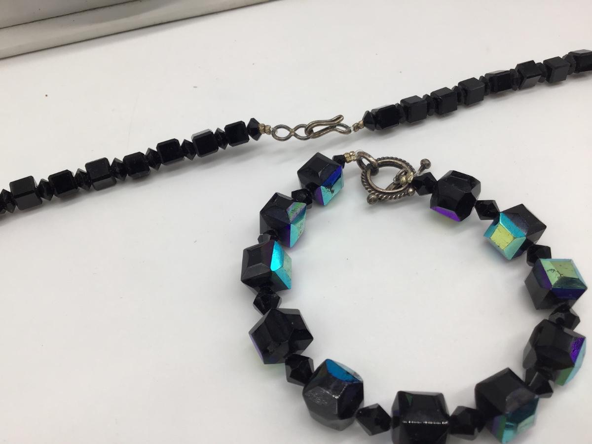 VINTAGE BLACK FACETED CRYSTAL GLASS BEAD NECKLACE & Black Glass Bracelet