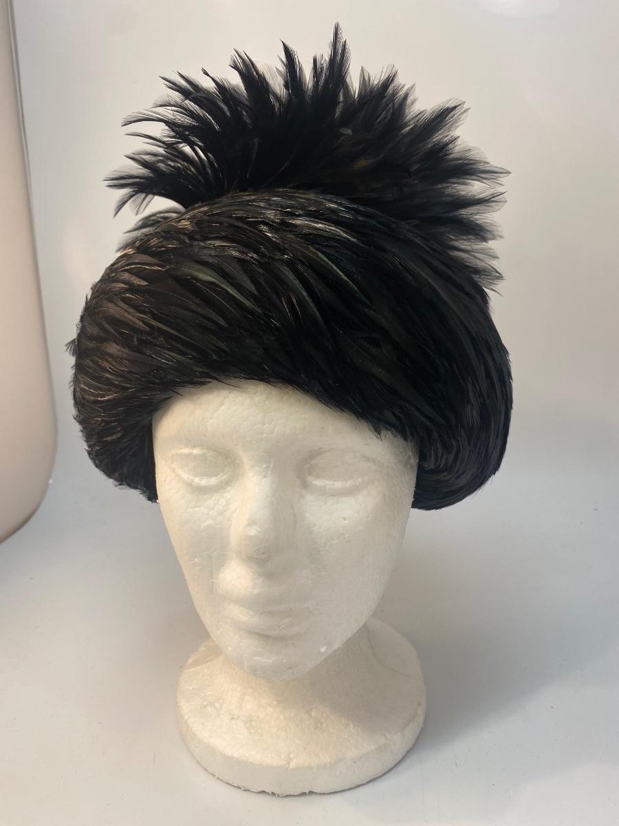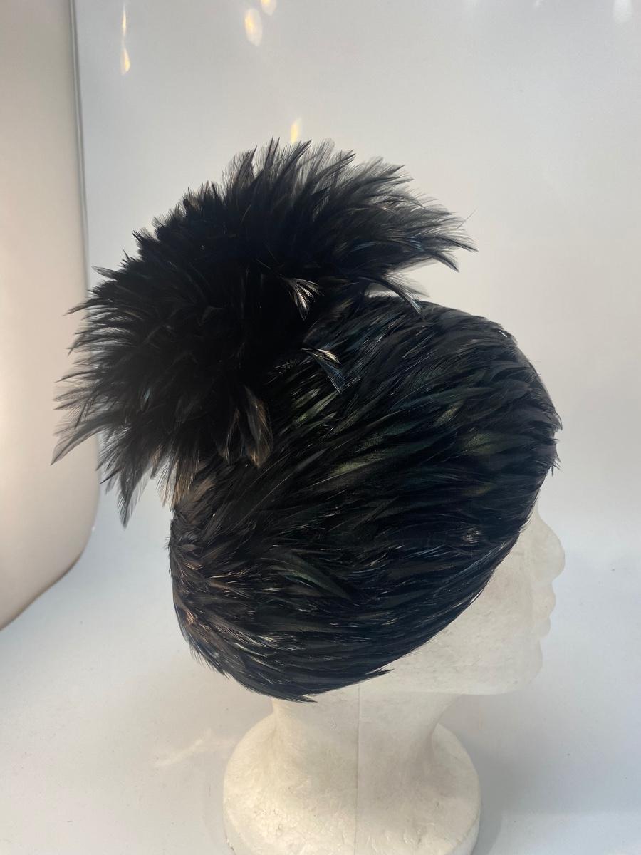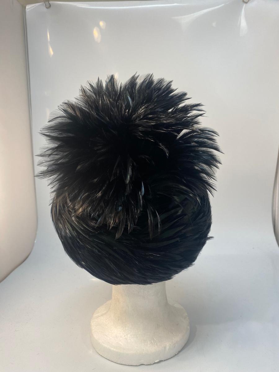 Vintage Black Feather Covered Bubble Hat with Fluffy Plume. In excellent condition. Feathers are black with an iridescent green sheen to them when turned in the light. Tag inside just says Patrice.