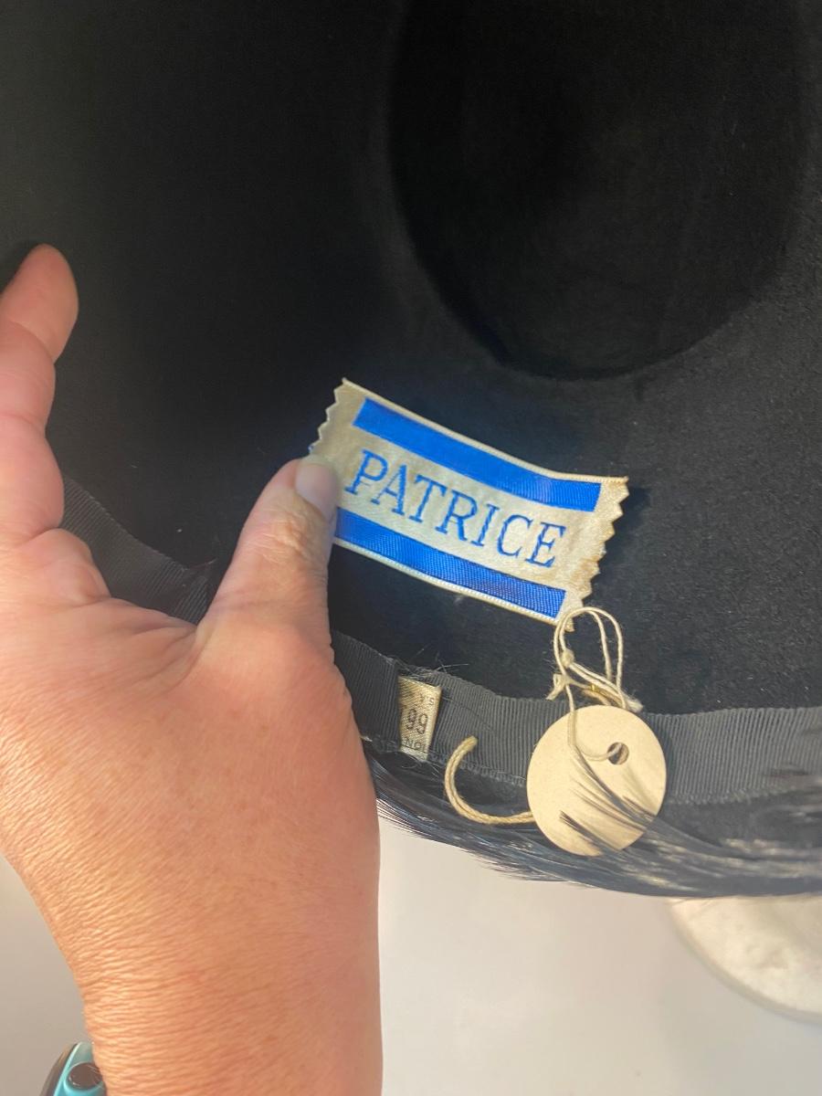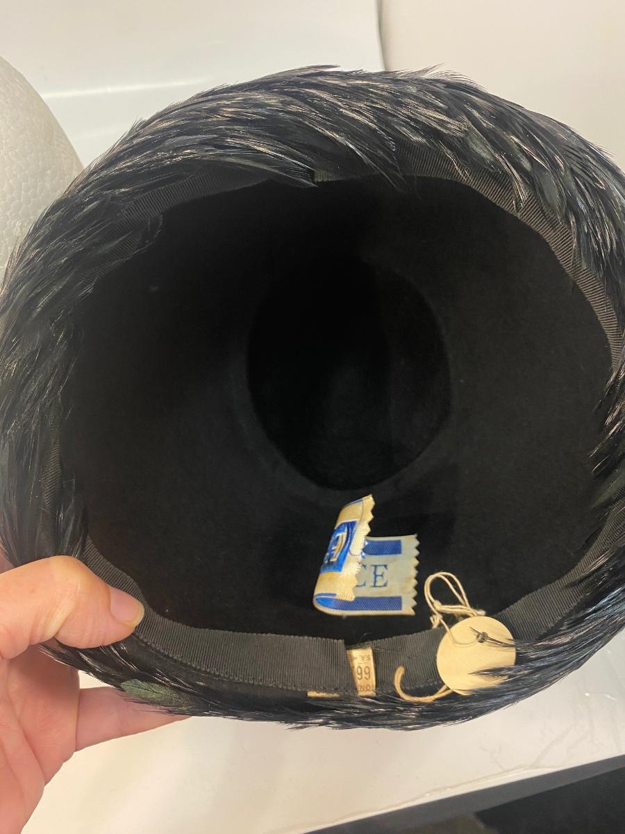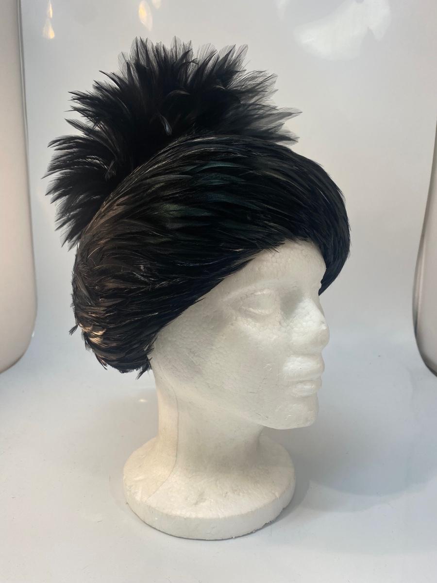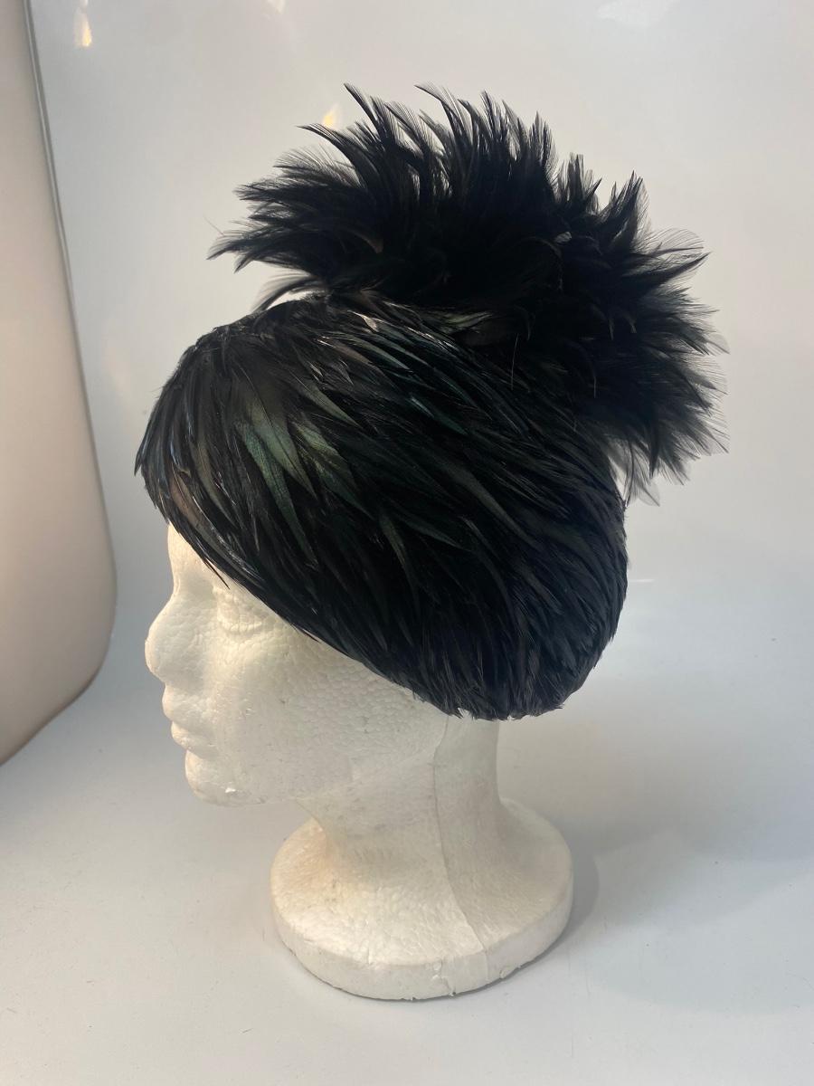 Vintage Black Feather Covered Bubble Hat with Fluffy Plume. In excellent condition. Feathers are black with an iridescent green sheen to them when turned in the light. Tag inside just says Patrice.
