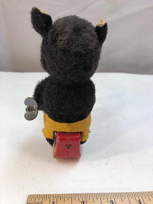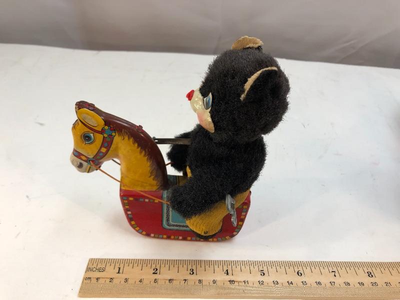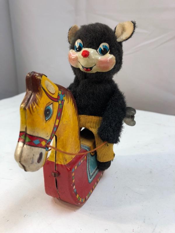 Vintage fuzzy black bear riding a rocking horse mechanical tin toy. WORKS. Made in Japan.