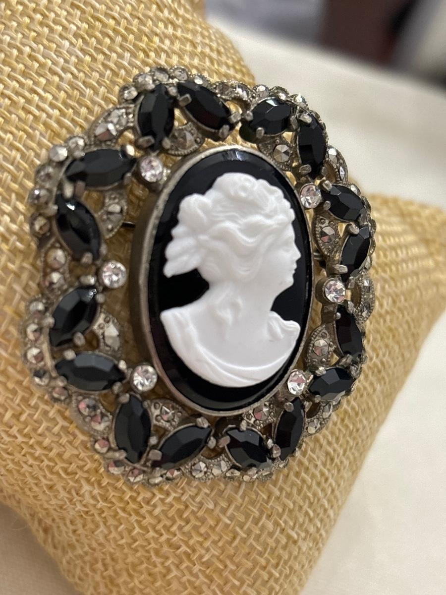 Vintage black glass cameo brooch