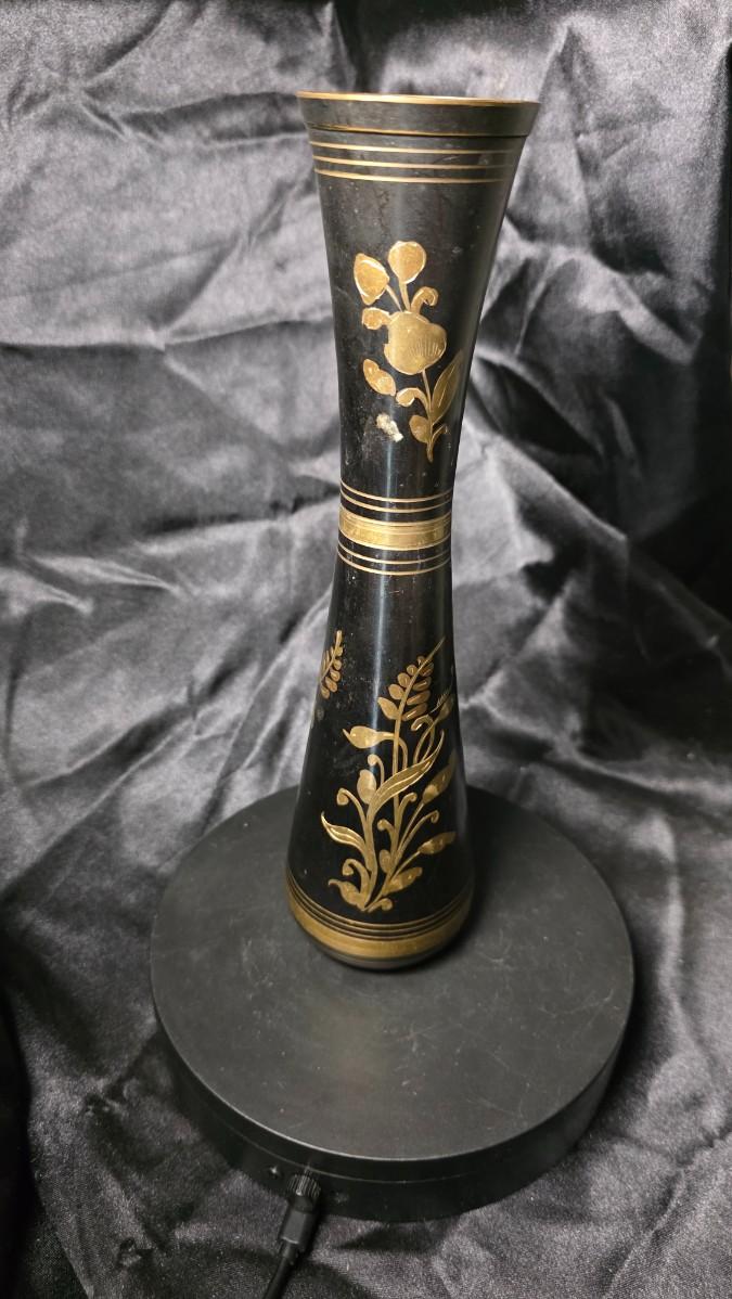 Vintage Black & Gold Hand-Etched Brass Vase – Indian Floral Motif
