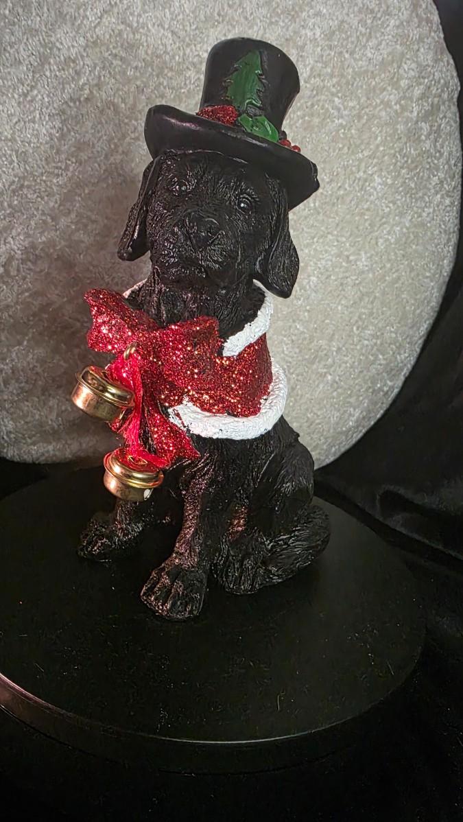 Vintage Black Labrador Christmas Figurine – Resin Holiday Dog Statue with Top Hat, Red Glitter Bow & Bells