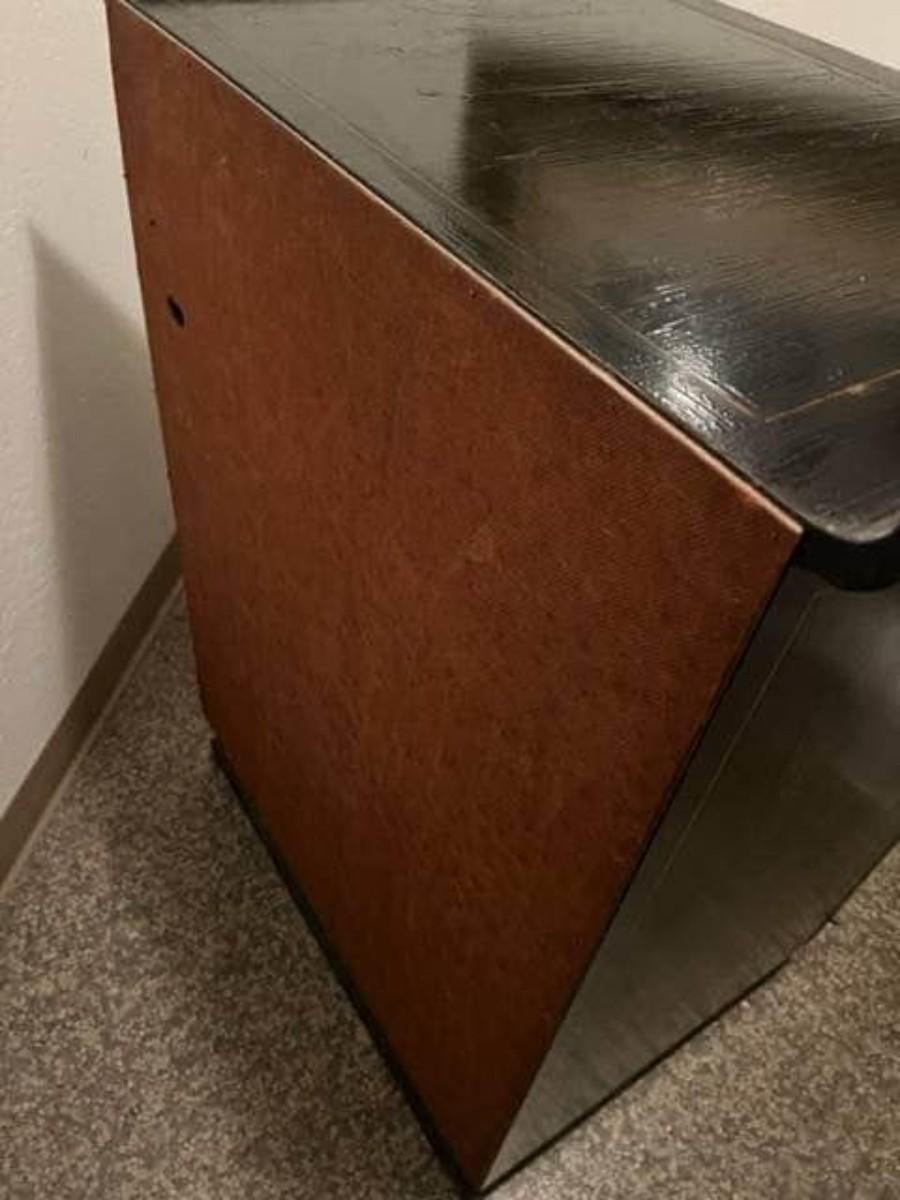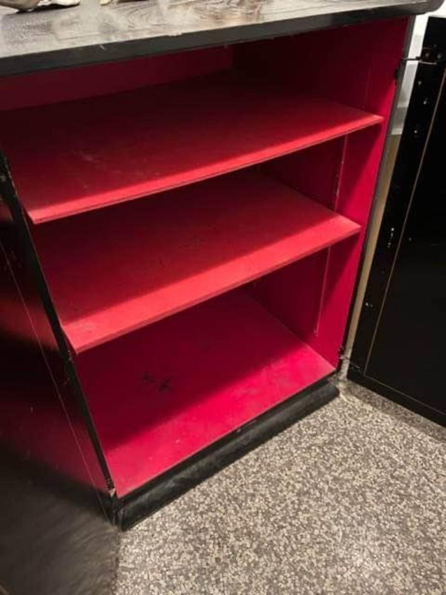 Used, with signs of wear and age (some scratches and scuffs), but it is in overall good condition, and is extremely strong, sturdy, and usable. The doors open and close smoothly, and remain securely closed when closed. It’s missing its knobs, but you can find replacements of your choice and they can easily be acquired and installed (the small holes are already there, but not noticeable if no knobs are ever put in). During the interim, the doors are opened by pulling them from the bottom.