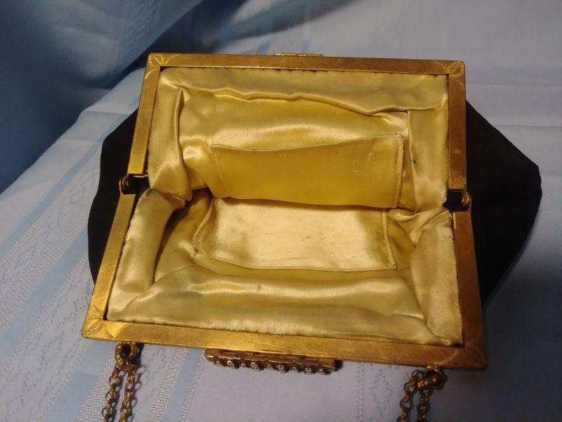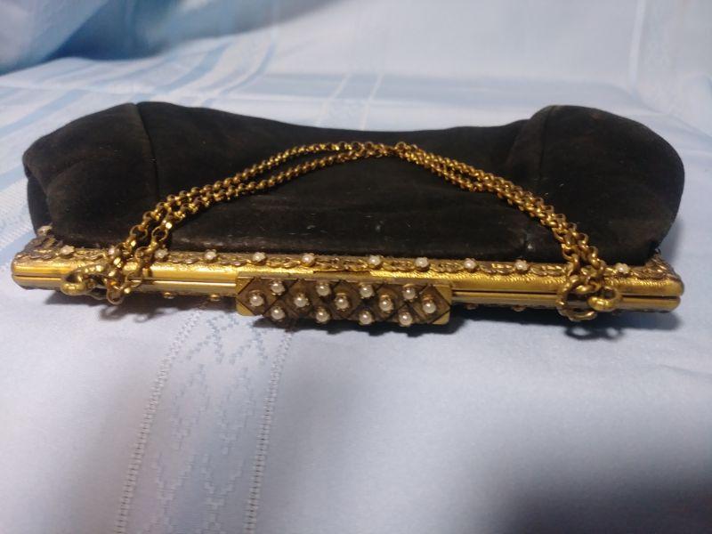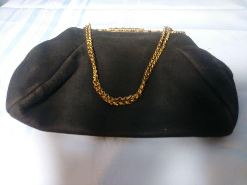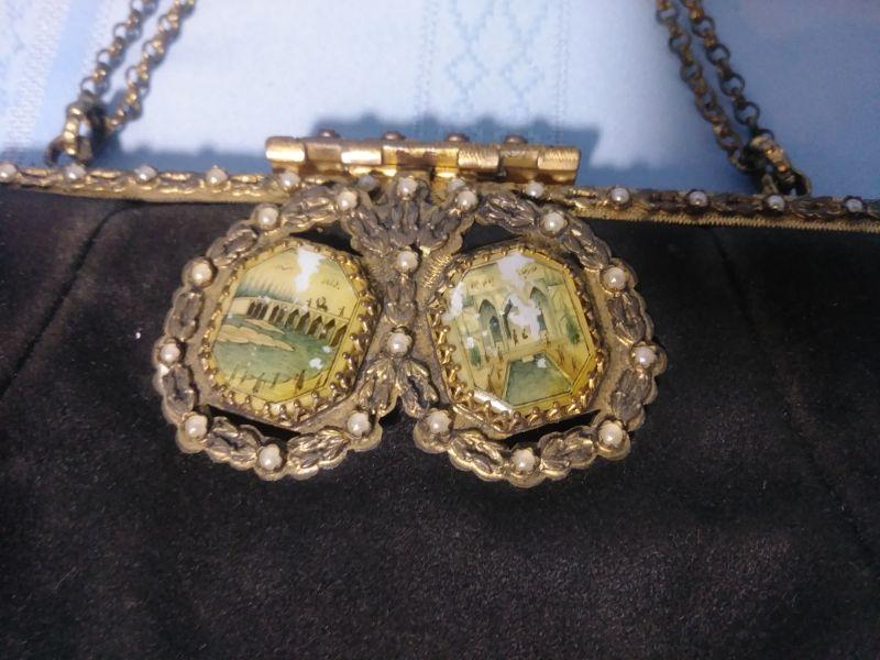 Vintage Black Leather Purse with Brass/ Mother of Pearl Clasp 9"x 6" with 22" Chain