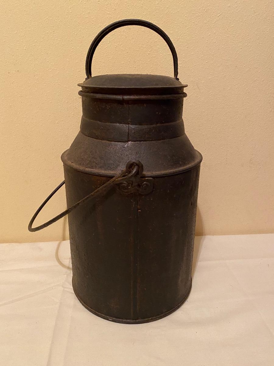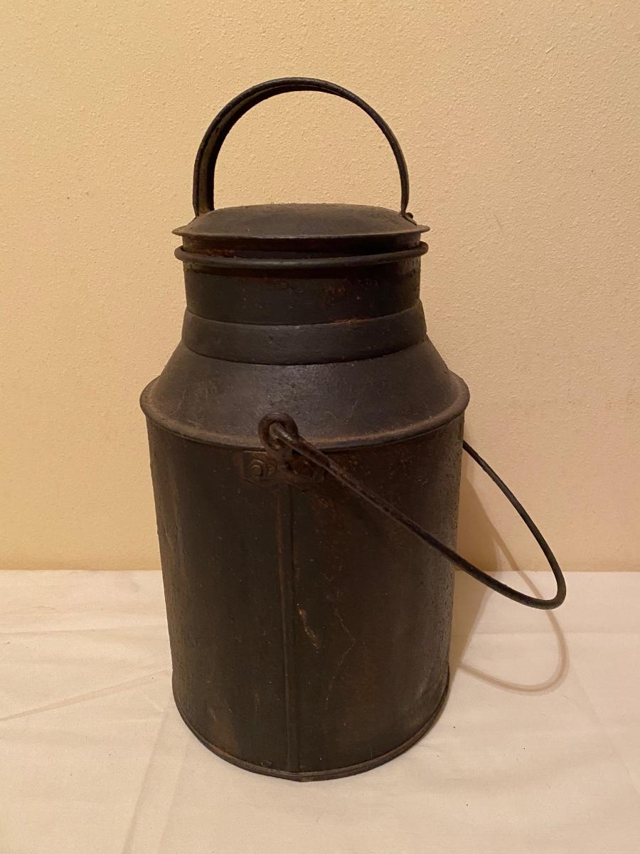 Vintage black milk can with lid and handle Lid is stuck on. In good vintage condition. Approx 15h x 17-3/4w