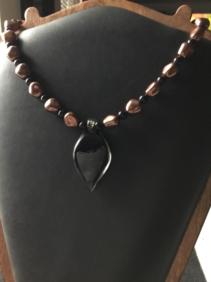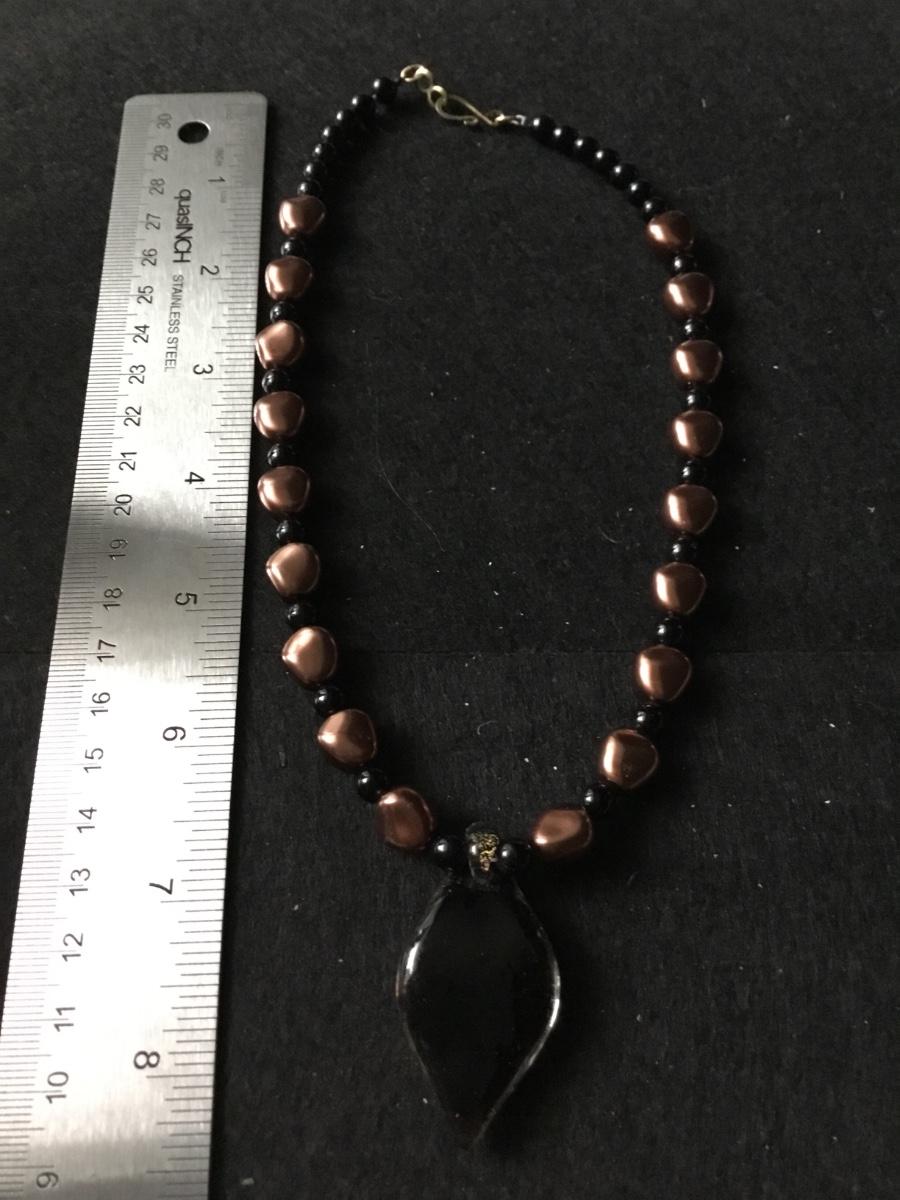 Vintage black onyx beaded necklace with copper colored beads and pendant necklace