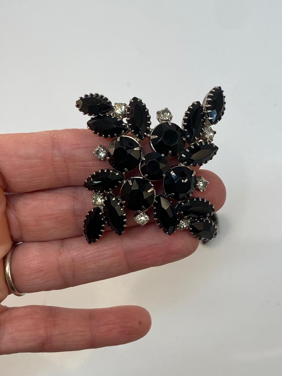 Vintage Black Rhinestone Brooch Pin & Clip Style Earrings. Deep dark black rhinestones with a few small clear rhinestones. Good condition. Unbranded.