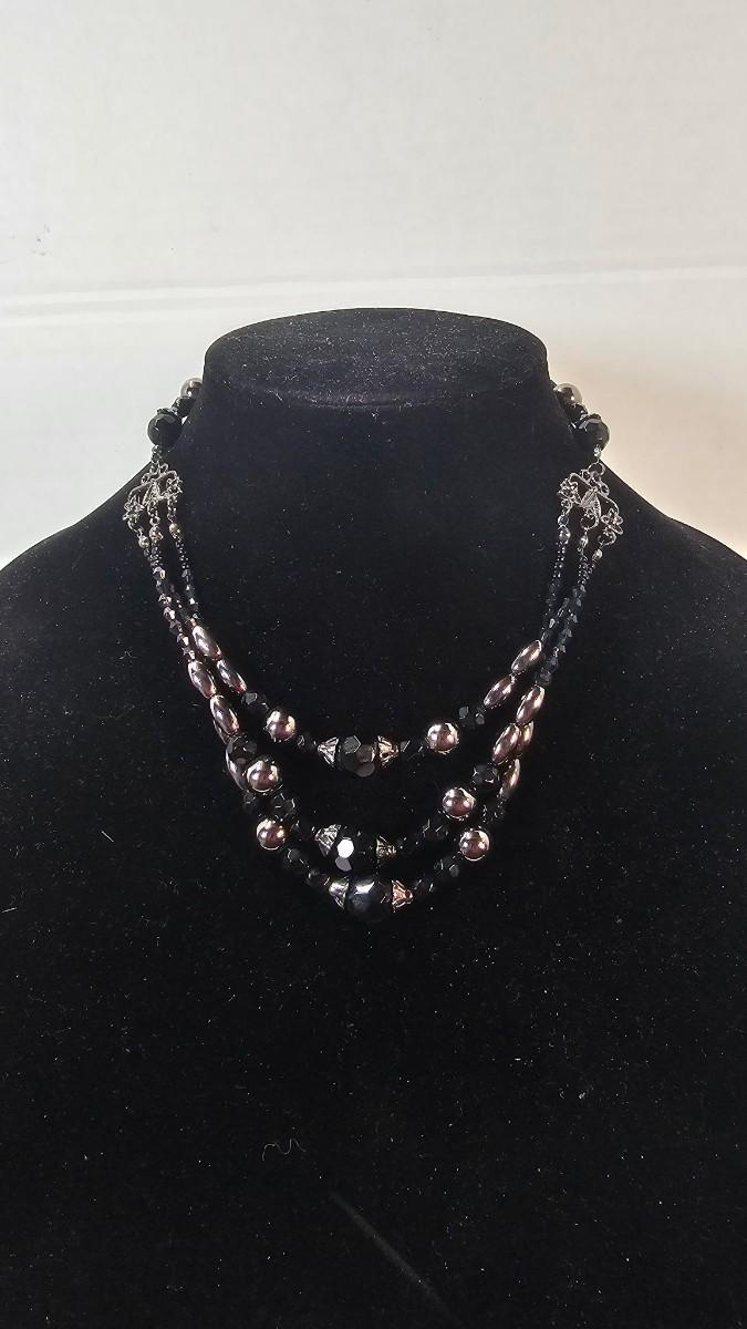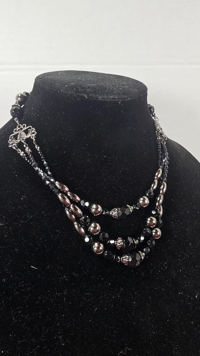 This vintage multi-strand necklace features a dramatic layered construction composed of faceted black glass beads paired with polished silver-tone metallic accents. The design alternates between glossy round beads, elongated metallic ovals, and precision-cut faceted elements, creating depth, contrast, and a visually rich texture across all three strands. The graduated drape sits elegantly along the neckline, offering a bold yet refined statement suitable for evening wear or elevated everyday styling.