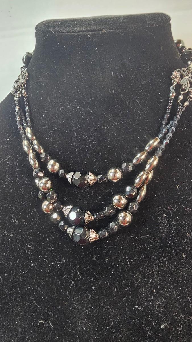 Vintage Black & Silver Multi-Strand Beaded Necklace with Faceted Glass and Metallic Accents