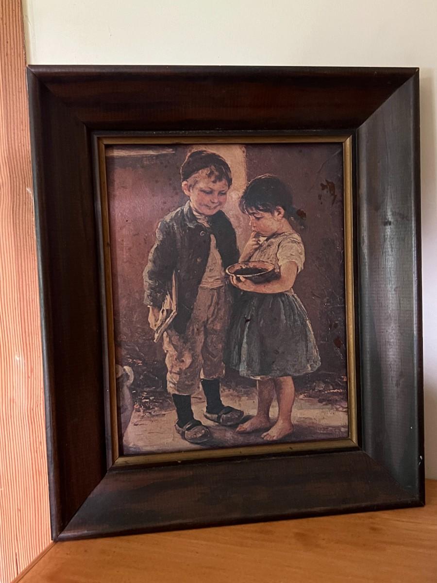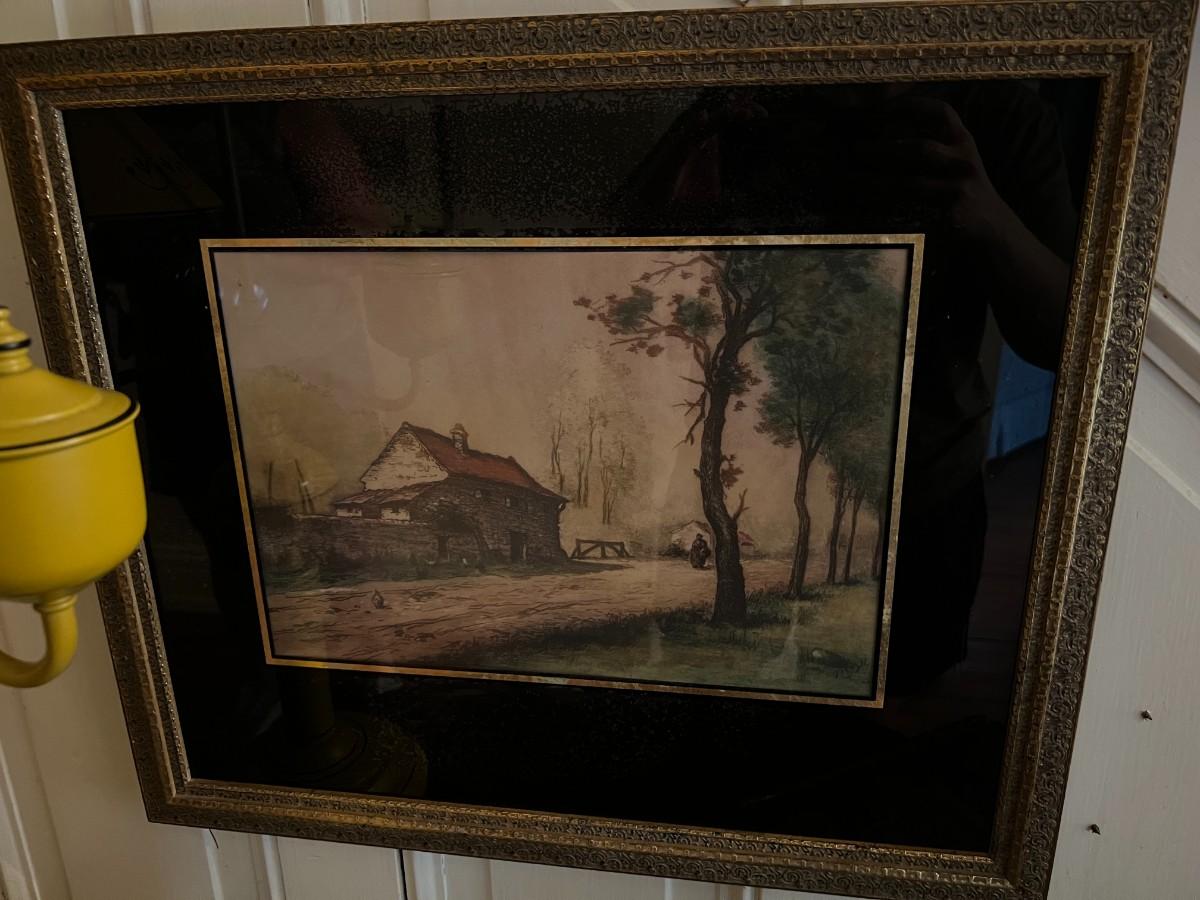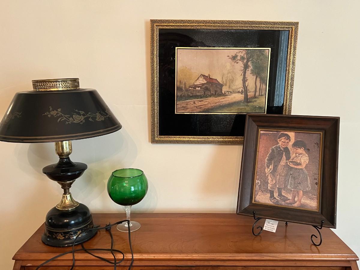 Vintage Black Toleware Table Lamp and Framed Paintings Lot