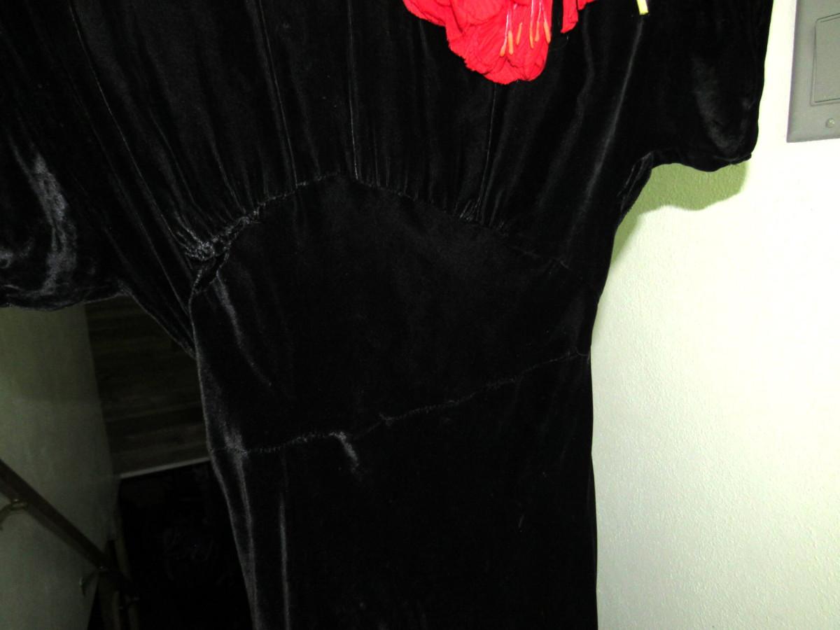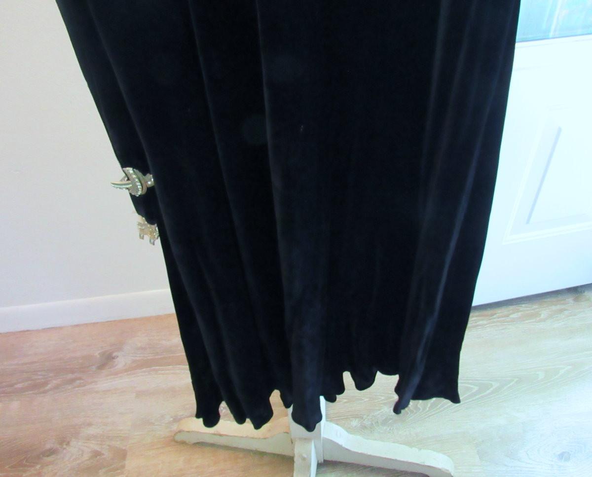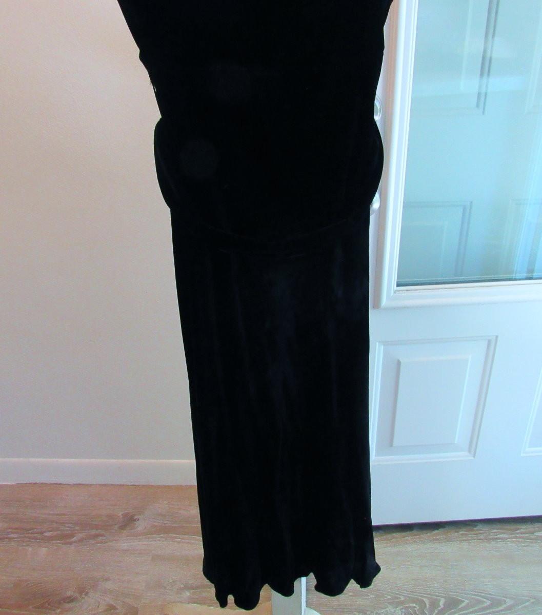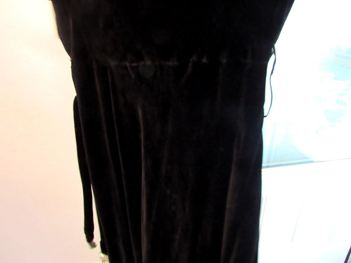 No makers labels, size unknown. Few tiny holds in velvet. Seam separation under bust - easy fix. Good hem. One rhinestone missing on belt. Shipping available at shipping cost plus $5.00 per box handling fee. See our terms for details.