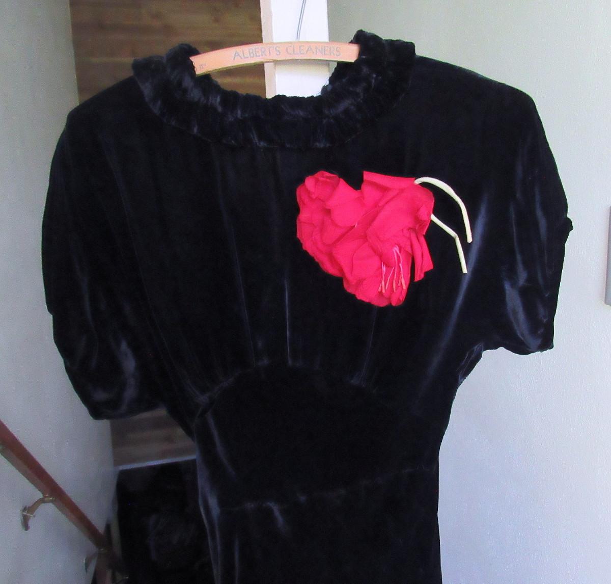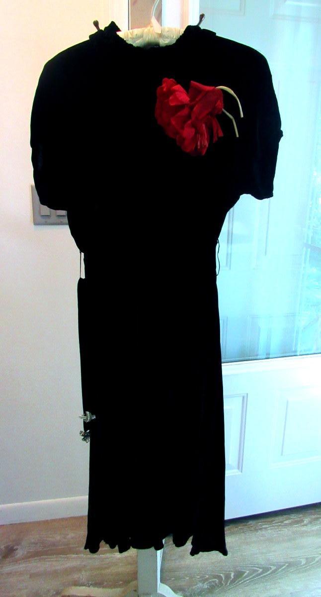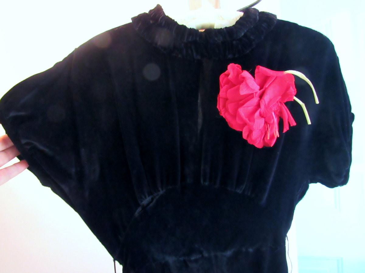 Lot 53:  Vintage Black Velvet Dress With Fabric Flower And Rhinestone Buckle on Belt