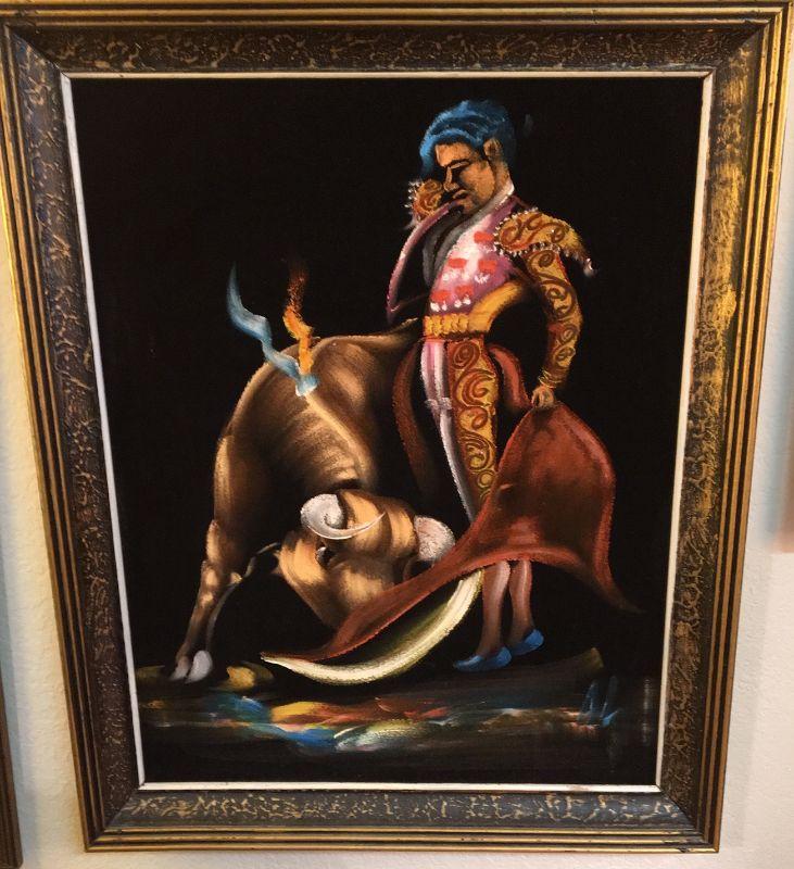 Vintage Black Velvet Painting Bull Fighting Fighter Matador Framed/ No glass. Colors are very, very vivid.