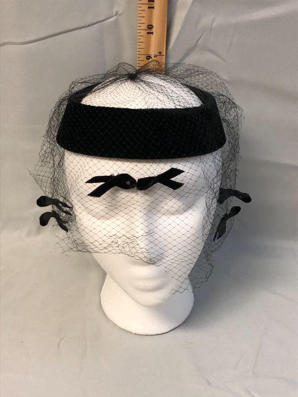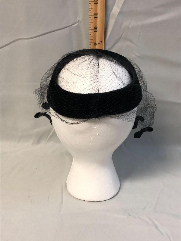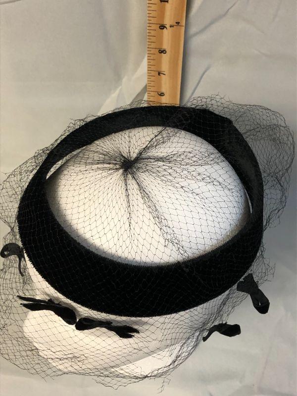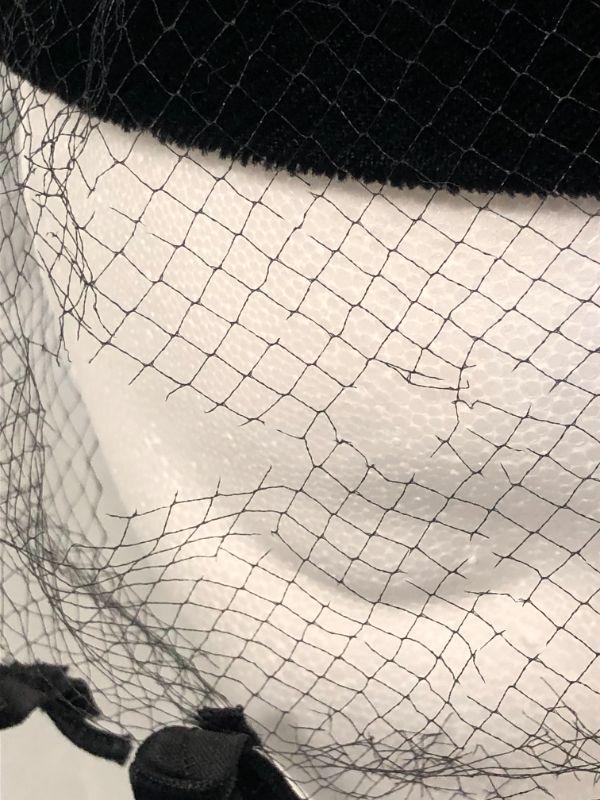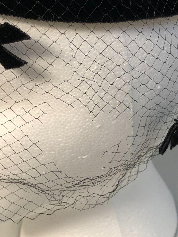 The black velvet hat portion is in very good condition, but the netting has tears. The netting is lightly attached in one place at the back so it could be replaced fairly easily.