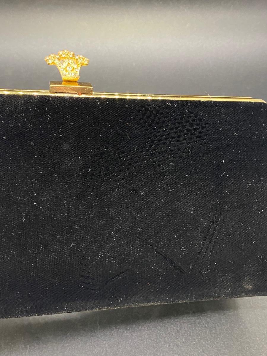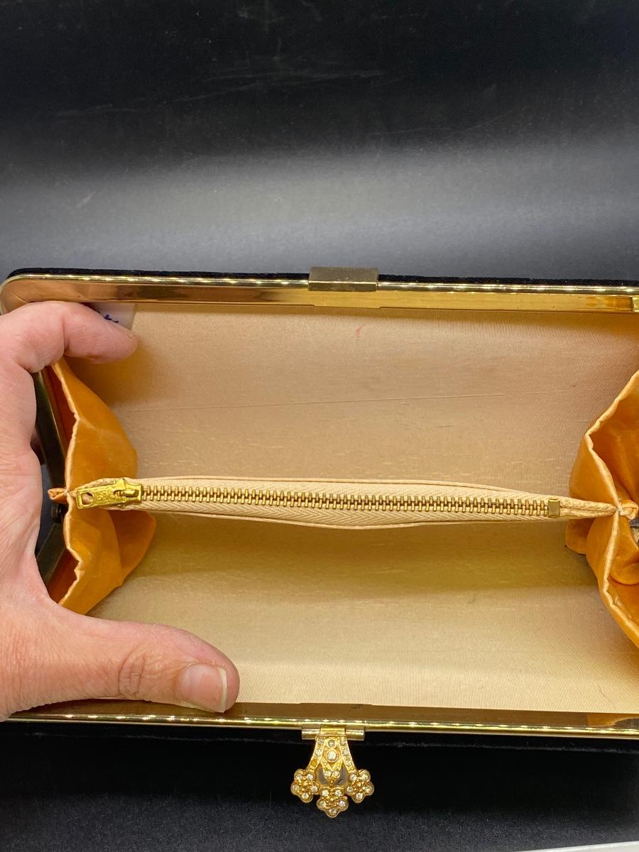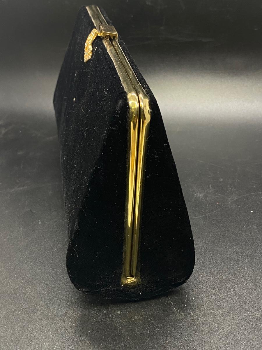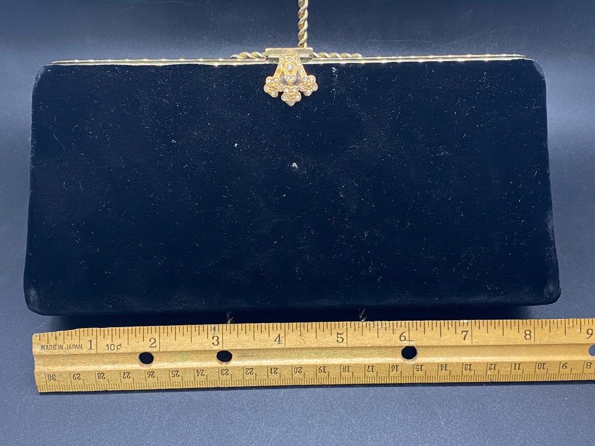 Vintage black velvet rolled clutch purse. Gold tone trim, rhinestone accent latch. Looks to be missing a rhinestone or two, but not all that noticeable. Has some wear/damage to the back, small holes in the velvet, maybe moth damage. In good useable vintage condition.