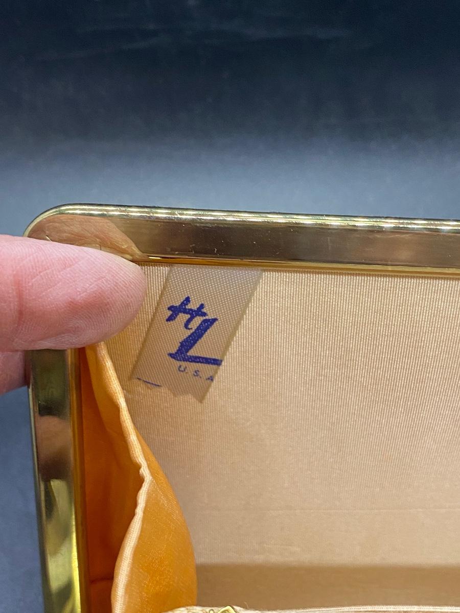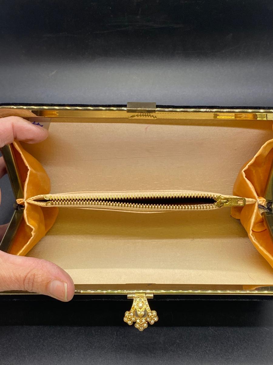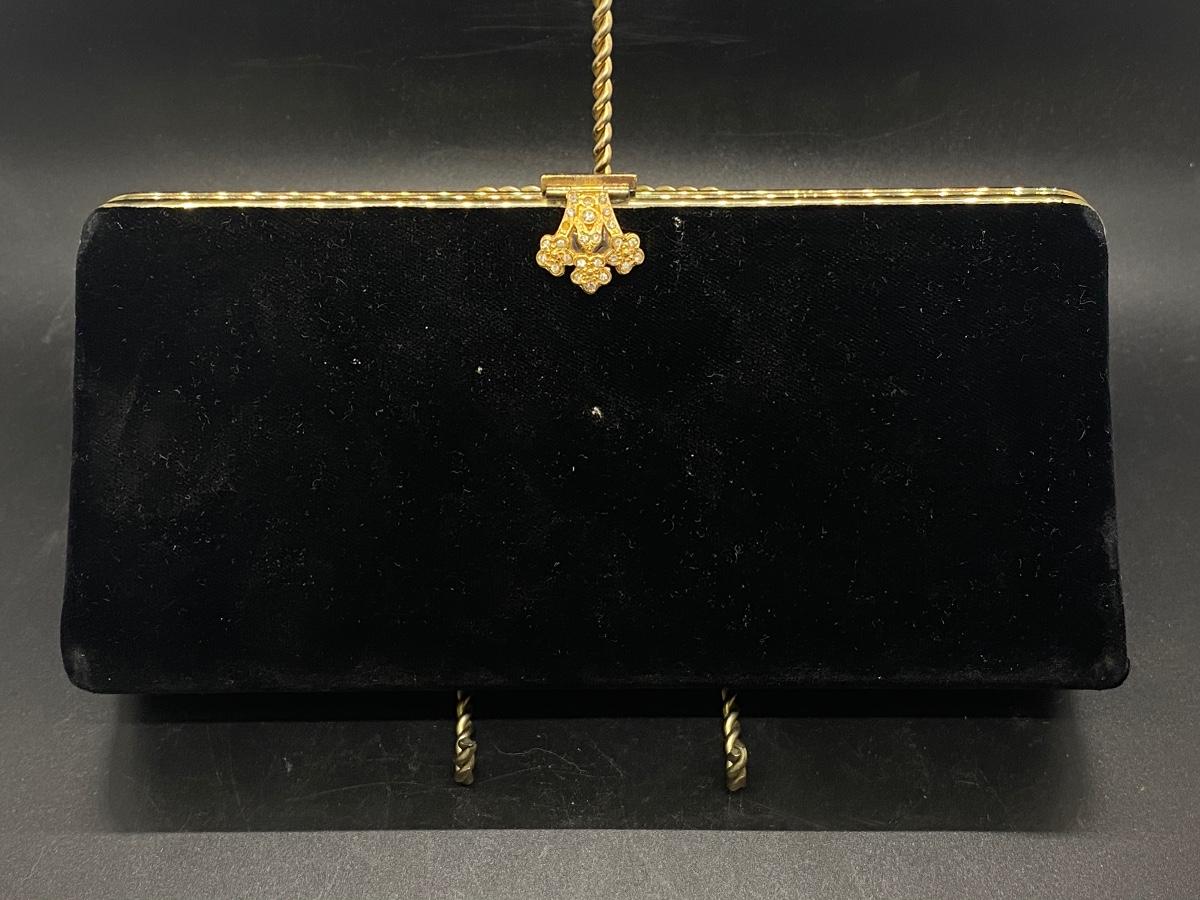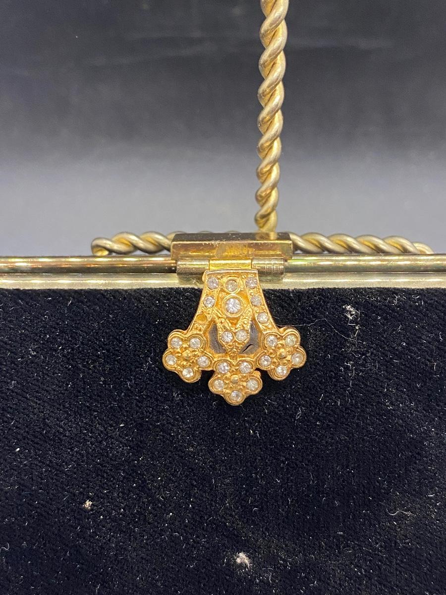 Vintage black velvet rolled clutch purse. Gold tone trim, rhinestone accent latch. Looks to be missing a rhinestone or two, but not all that noticeable. Has some wear/damage to the back, small holes in the velvet, maybe moth damage. In good useable vintage condition.