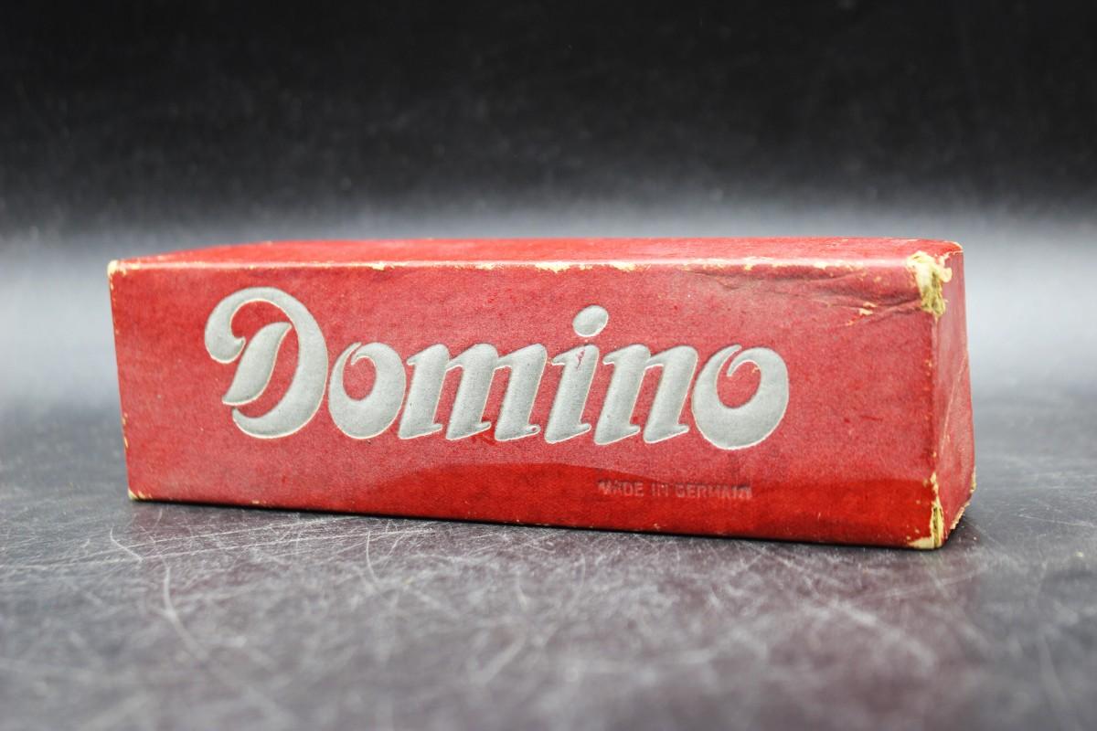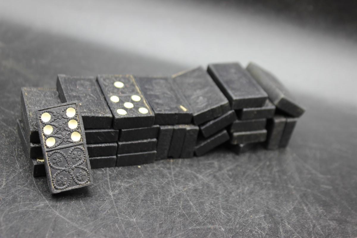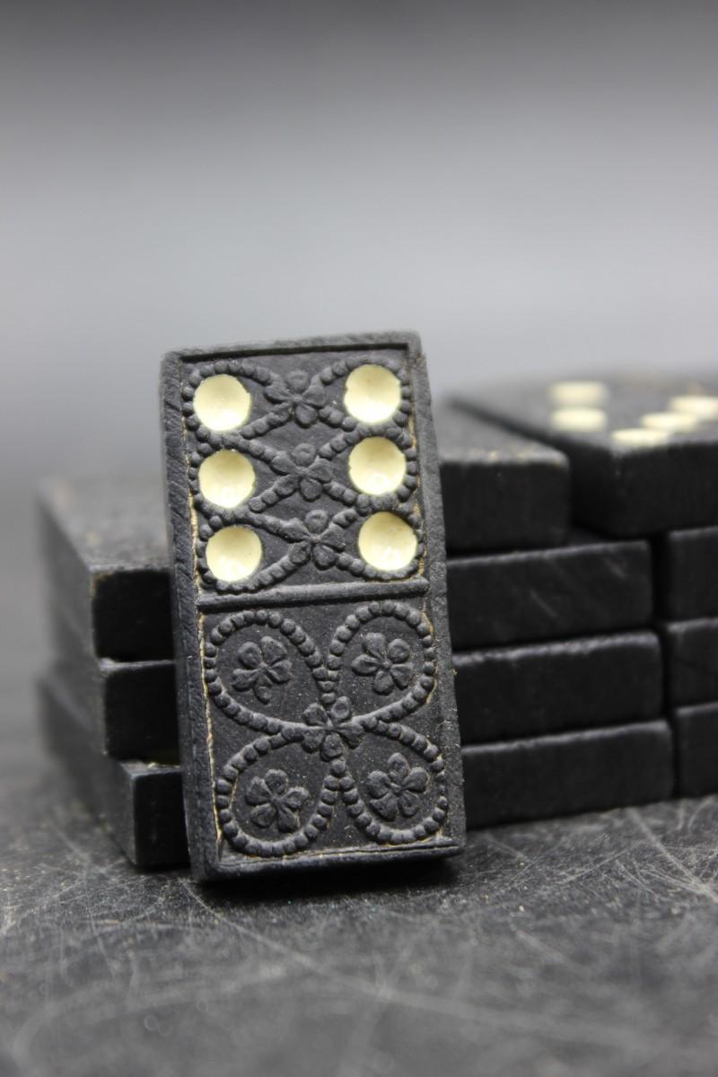 Vintage Black & White Wood Domino Set, there is no significant damage to the packaging or the domino pieces and is in good vintage condition. The dominoes appear to be complete, but has not been fully checked. Check pictures for more details and for sizing.