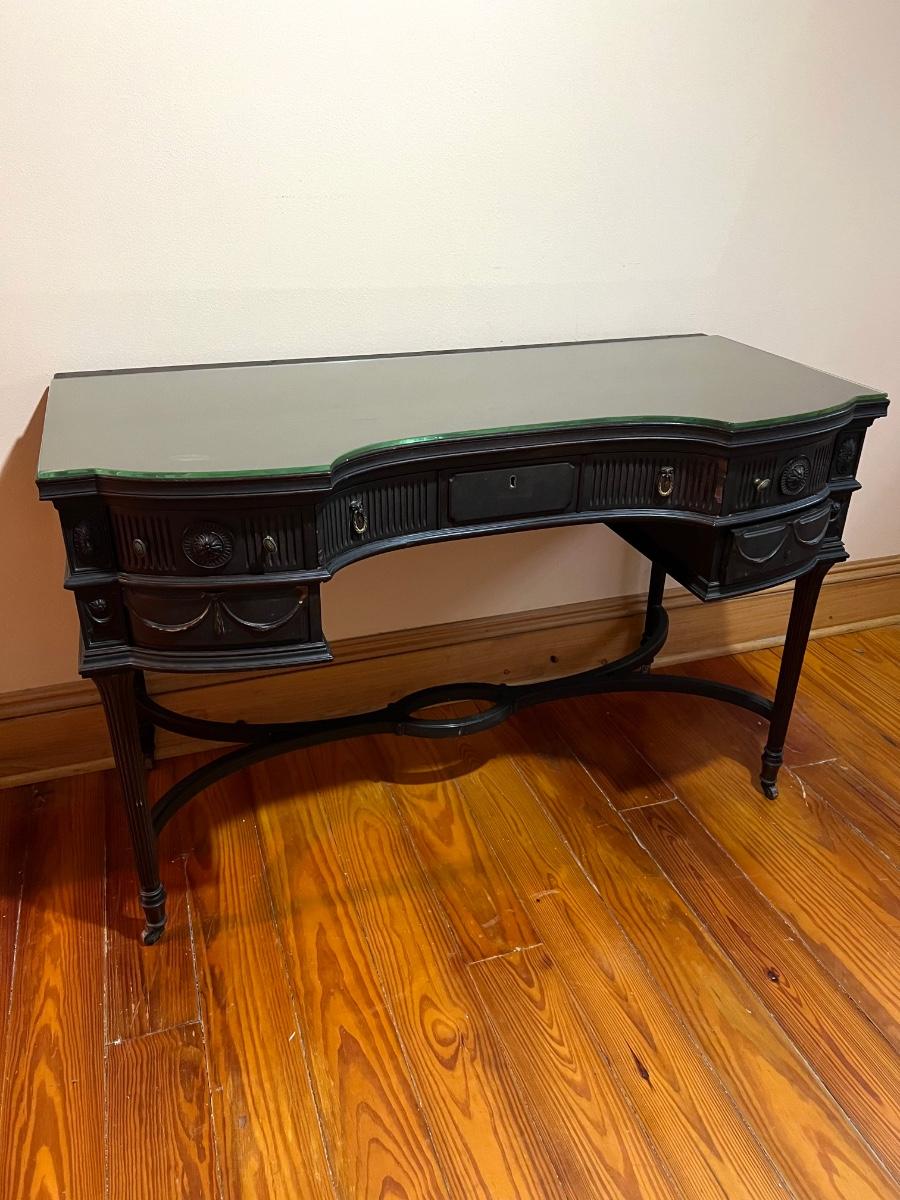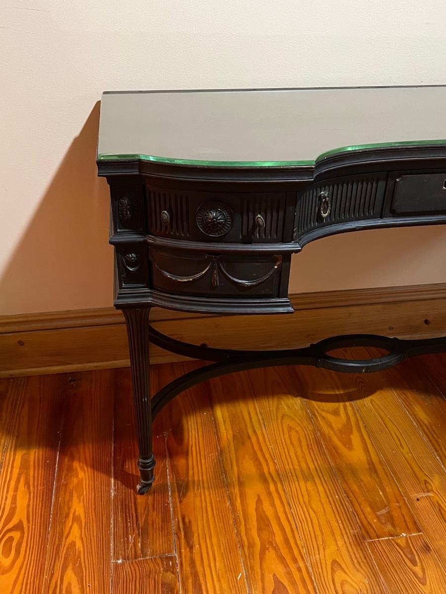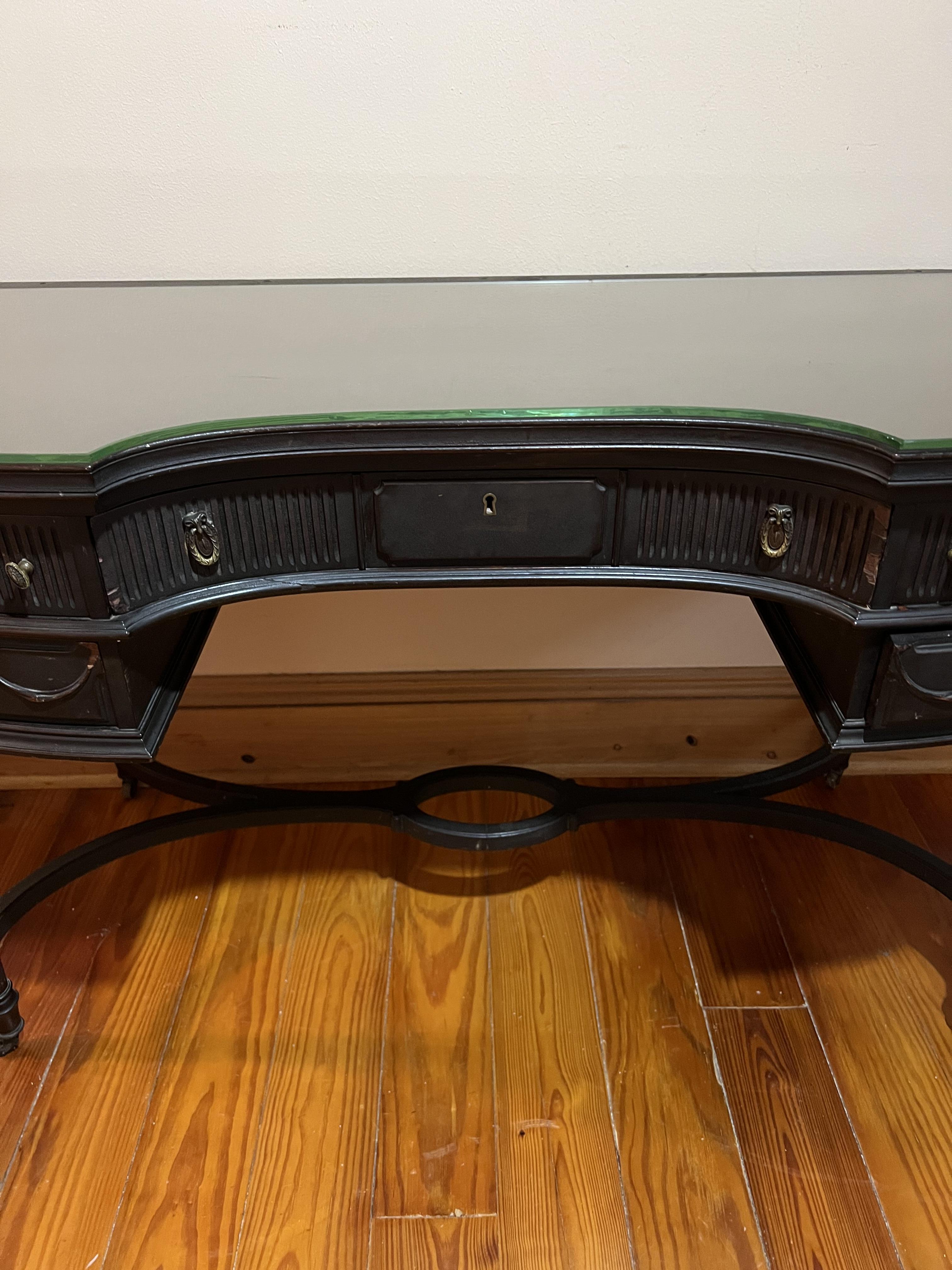 Project Piece ~ Glass Removable Top. Drawers slide out easily. Needs to be repaired in some spots. Top of Desk needs refinishing. See pictures. 31” H x 48” W x 23.5” D.