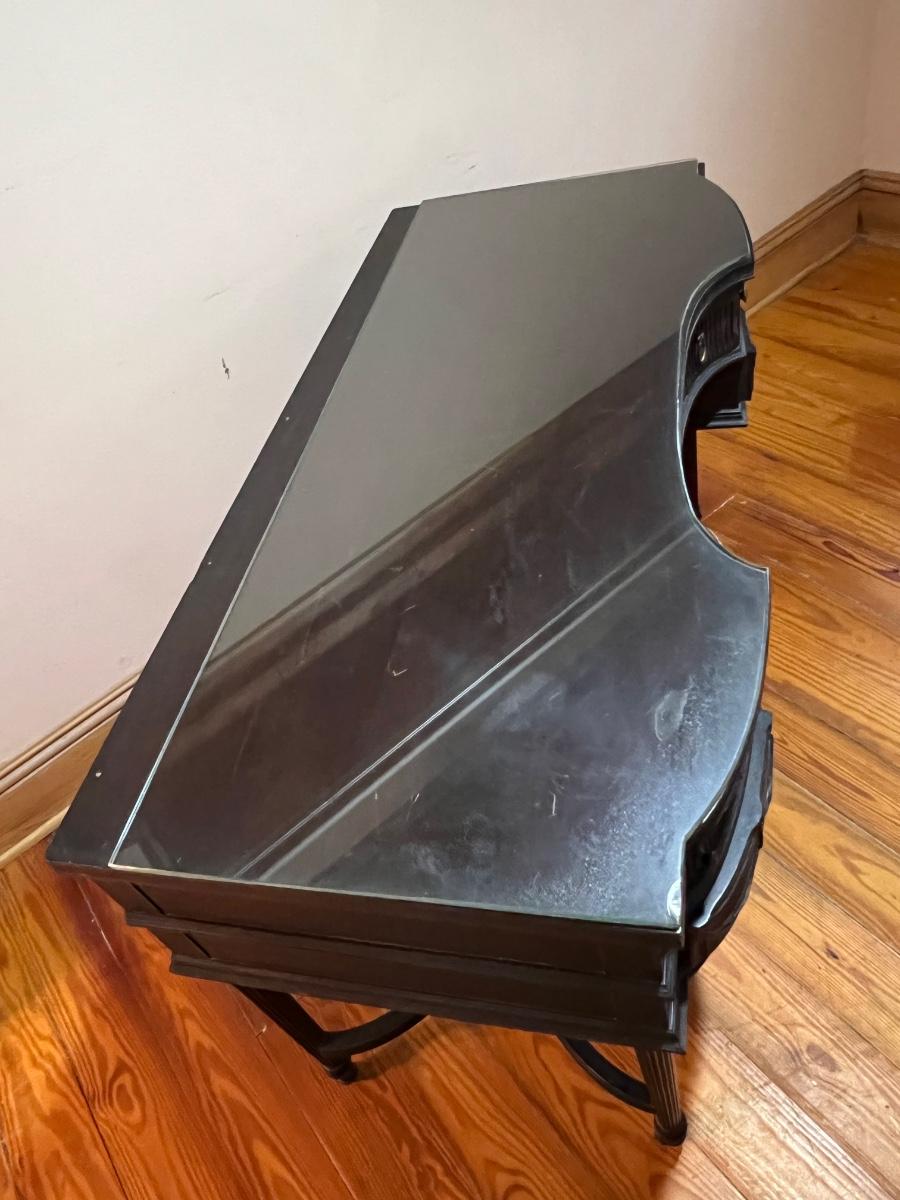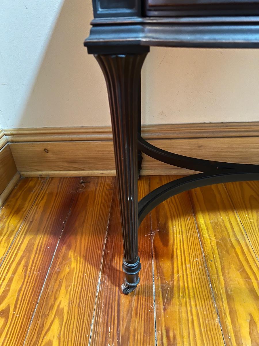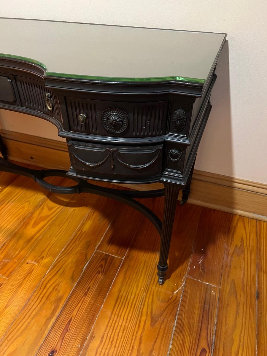 Project Piece ~ Glass Removable Top. Drawers slide out easily. Needs to be repaired in some spots. Top of Desk needs refinishing. See pictures. 31” H x 48” W x 23.5” D.