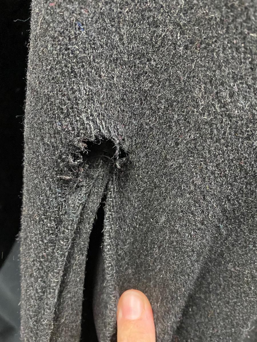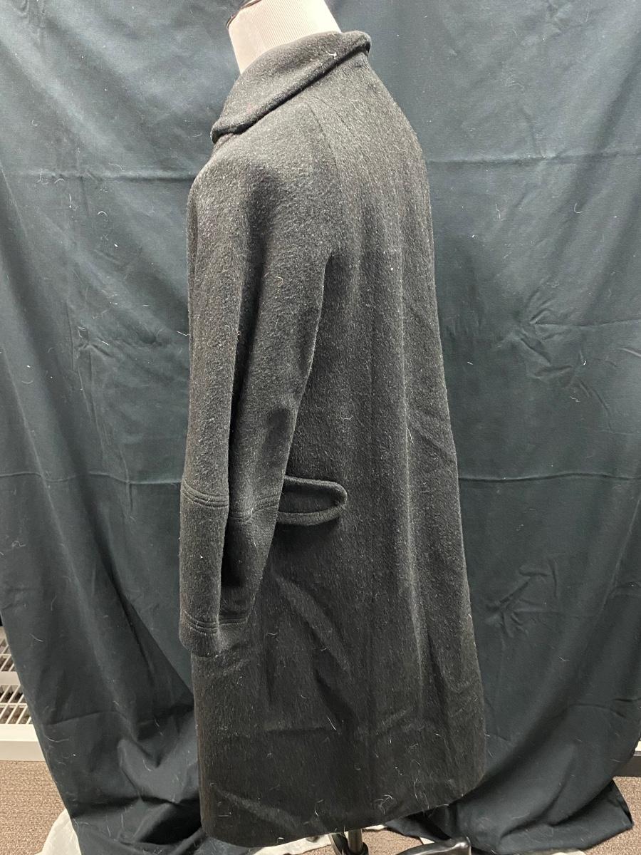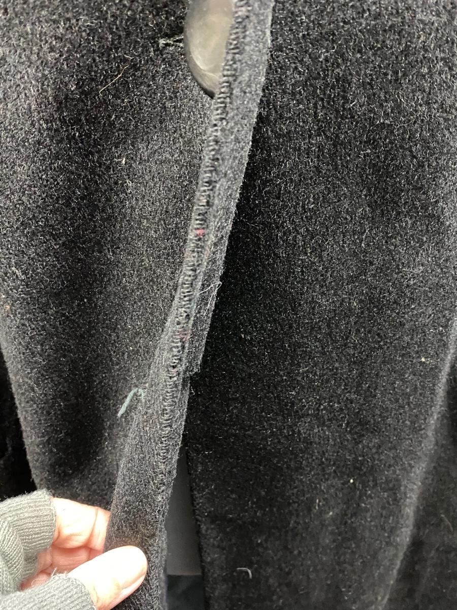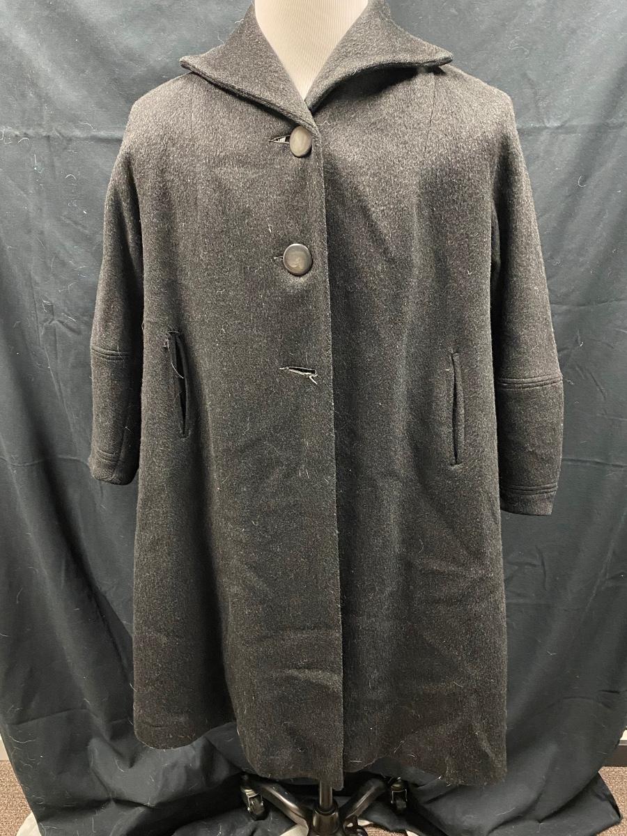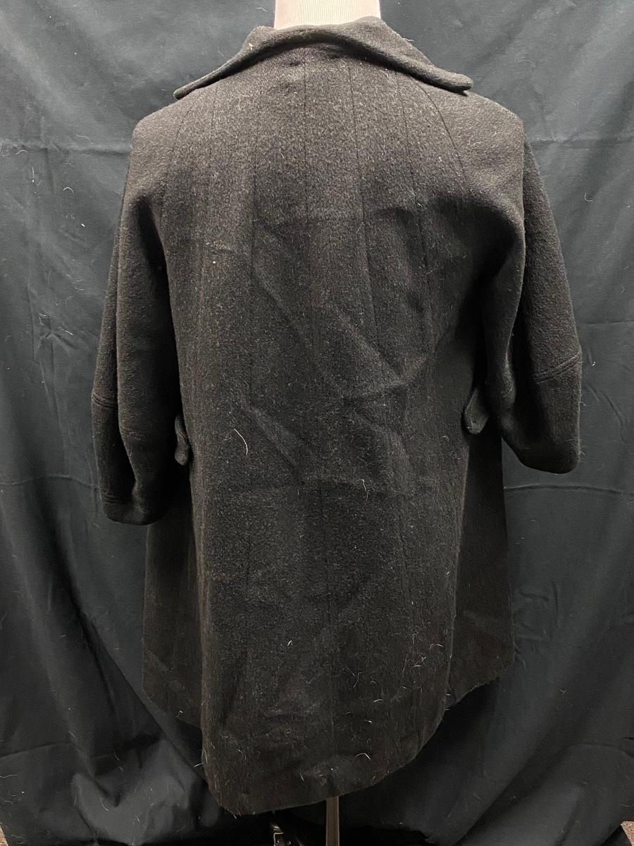 Vintage black swing coat. Lightweight wool felt material. It is missing the lower of the three buttons and does have a hole at the top of the right pocket. May hit about knee length, No size tag, maybe a medium.